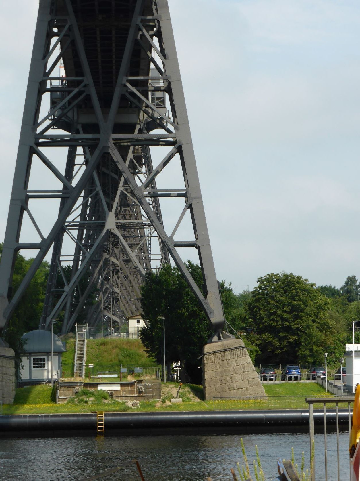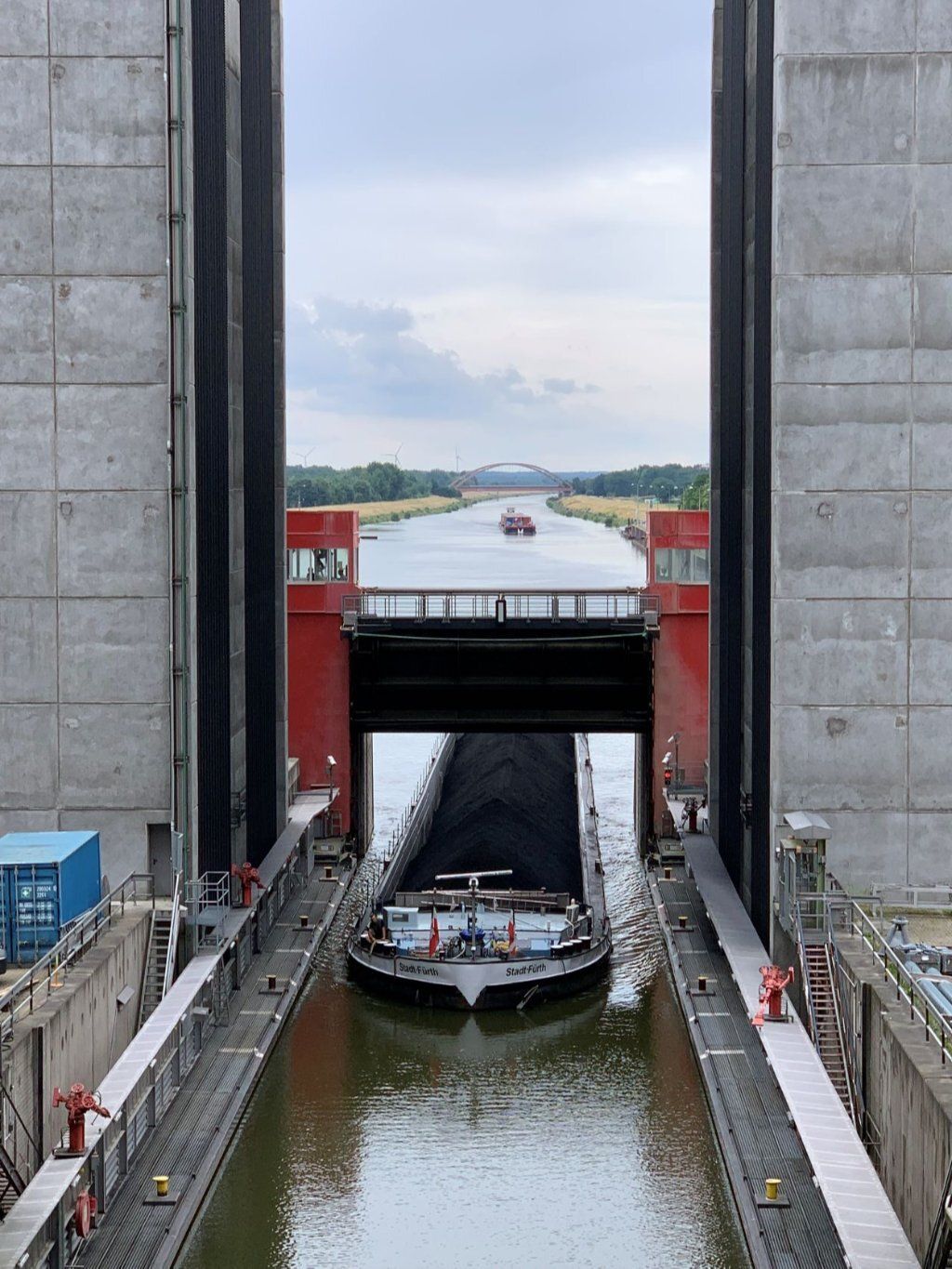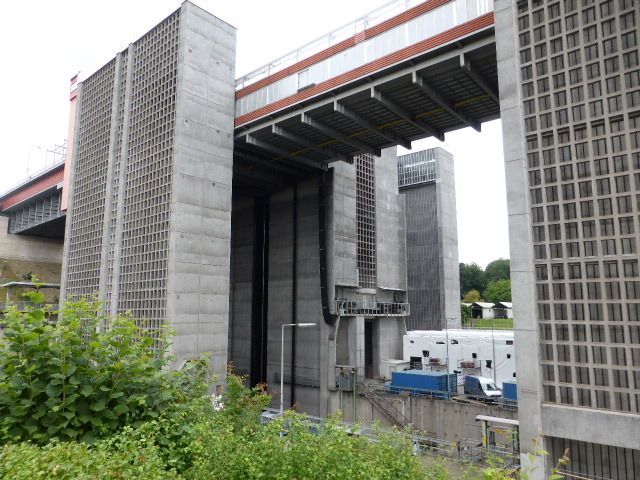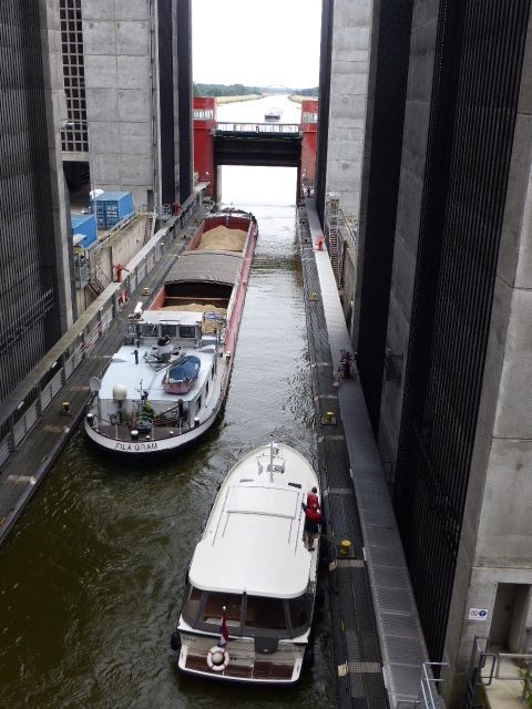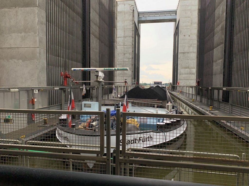 In der Nähe besuchen wir das Schiffshebewerk Scharnebeck an der Elbe. Das ist eine Art Schleuse einfach in einer Wanne. Zum Glück kommt da gerade ein grosser Kohlekahn, gegen 100m lang. Der hat genau Platz in der Wanne. Dann werden die Tore geschlossen und die 6000t, Kahn, Wasser und Schiff, werden von weiteren 6000t Gegengewichten 38m wie im Lift gehoben, dann fährt der Kahn weiter, oben kommen neue Schiffe, die unten wieder weiterfahren. Hans bekommt glänzende Augen und ich bin fasziniert.