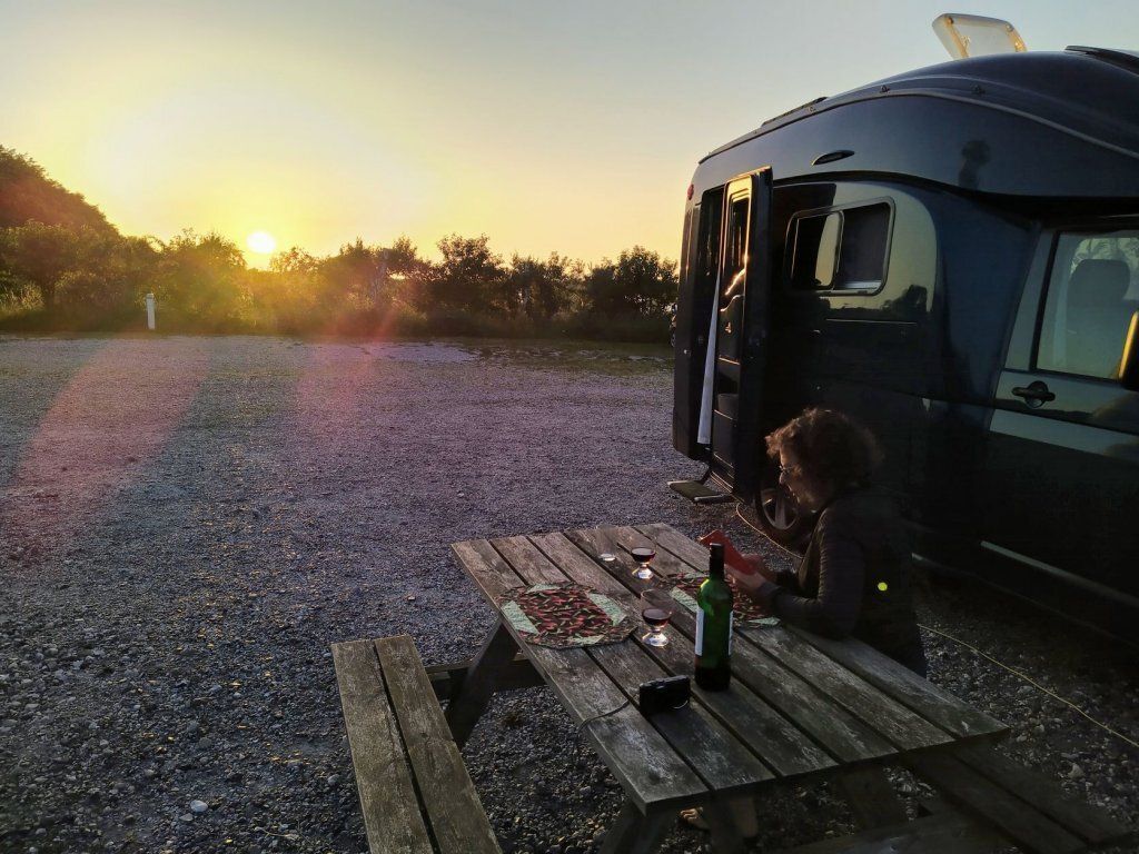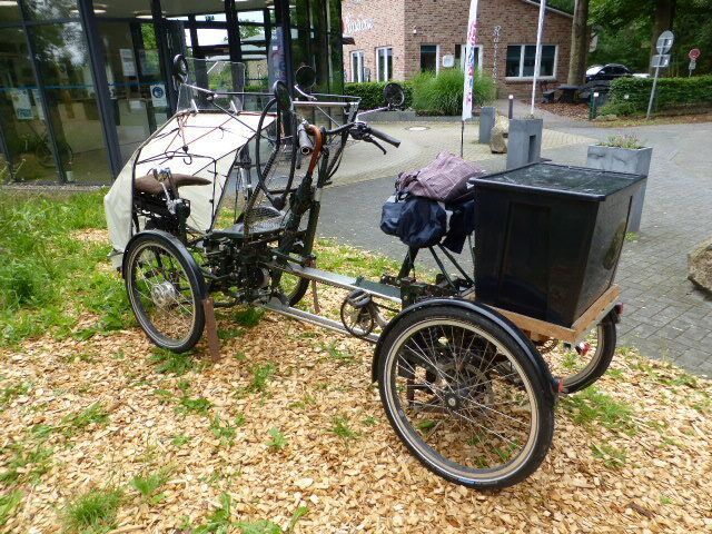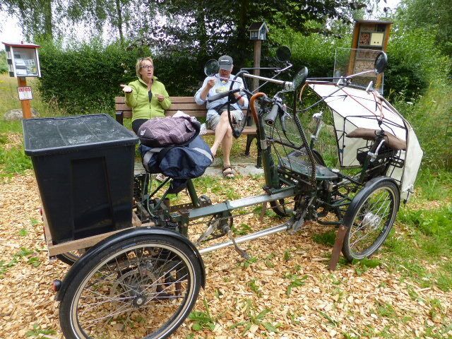 Nicht genug: Auf dem Weg zum Parkplatz treffen wir ein Super-Tandem Marke Eigenbau. Die Erbauer sitzen dahinter und picknicken. Beide können eigenständig ihren Gang wählen und treten. So können beide ihre Leistung zum Antrieb beitragen. Am Schluss wird das Gefährt zusammengeschoben und kommt auf den Anhänger des Campers.