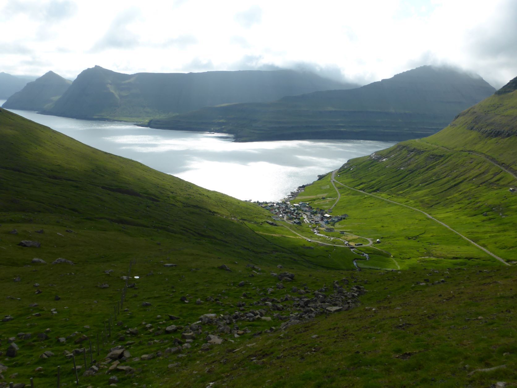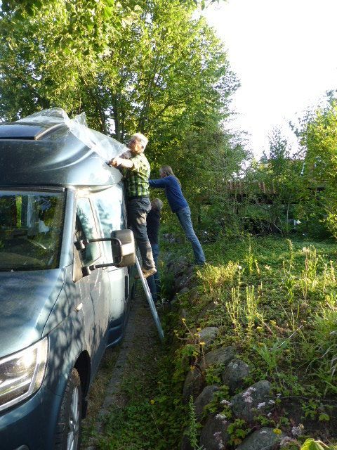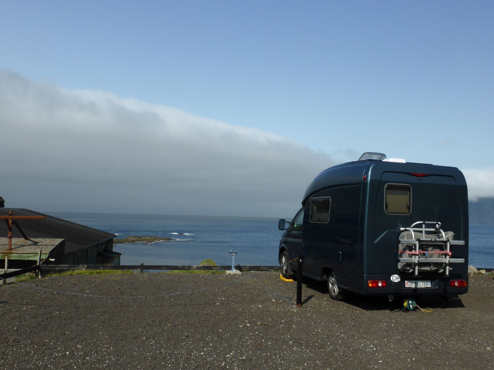 Wir kaufen für zwei Tage ein. Auffallend und uns sehr fremd ist, dass hier niemand eine Maske trägt. Nur Händedesinfektion und Abstandsregeln sind gefordert. Dann fahren wir nach Vestmanna zu einem gelobten Campingplatz. Aber da stehen nur weisse Wohnwagen in Reih und Glied und sowieso ist der Platz geschlossen. Wir fahren weiter nach Gjogv, das sich etwa wie "Tschetschv" ausspricht. Wir finden einen Platz mit Meersicht. Das Wetter ist auch färöisch: Nebel, Nieselregen und dann wieder Sonne. Wir entscheiden uns den Blog über Deutschland fertig zustellen. Aber oh Pech und Ärger: die Fotos können einfach nicht in den Blog geladen werden, die Verbindung zur Swisscom geht nur über Mail und überhaupt sind alle unsere Telefonnummern ungültig. Hans versucht alle Möglichkeiten, die ihm in den Sinn kommen, aber keine funktioniert.
