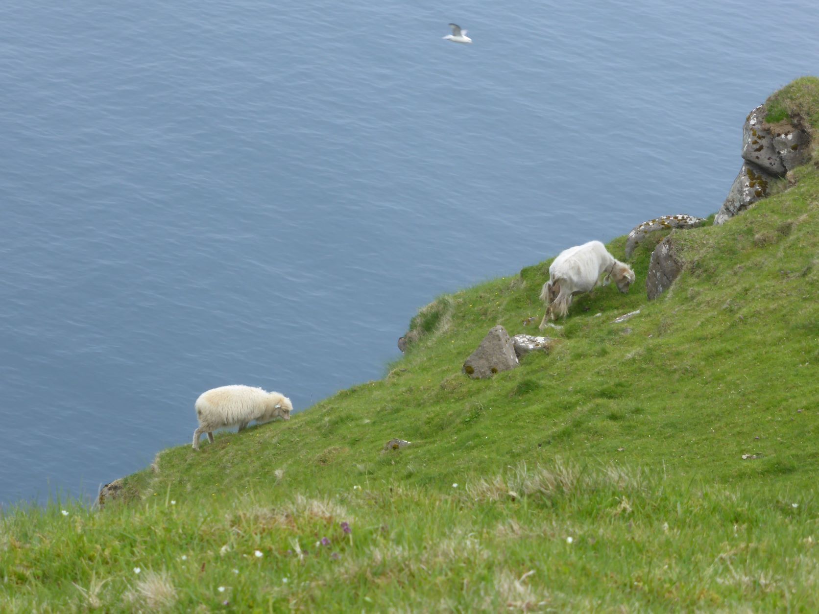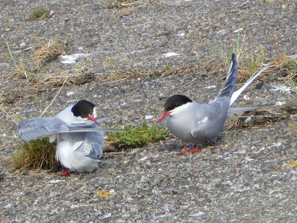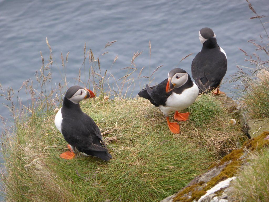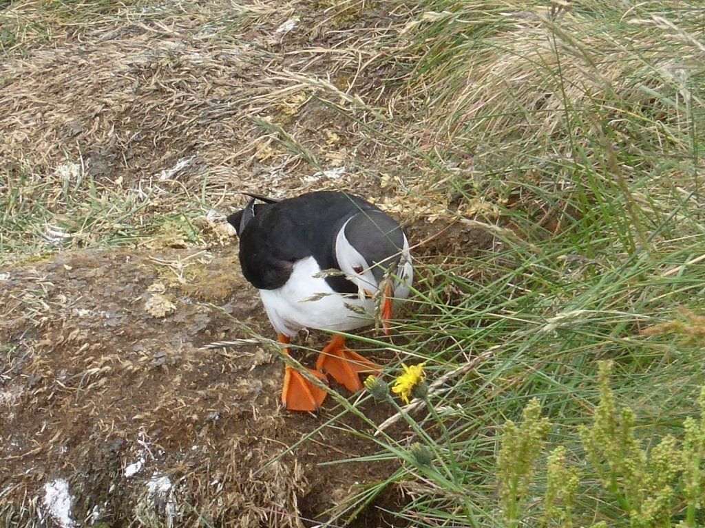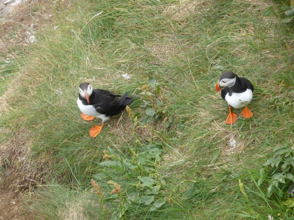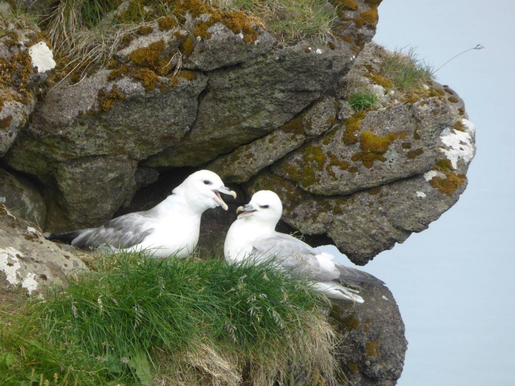 Schweren Herzens geben wir auf, hoffen auf Island und wandern auf den berühmten Vogelfelsen. Die Papageientaucher brüten in Erdlöchern von Mai bis August. Sie können gut fliegen und tauchen, nur beim Start sind sie etwas schwerfällig, weil sie so kurze Beine haben. Es sieht so putzig aus, wie sie nahe an einen Abgrund tappen und dann wegfliegen. Weiter oben ist dann der Möwenfelsen. Hier sehen wir Innigkeit und Pflege.