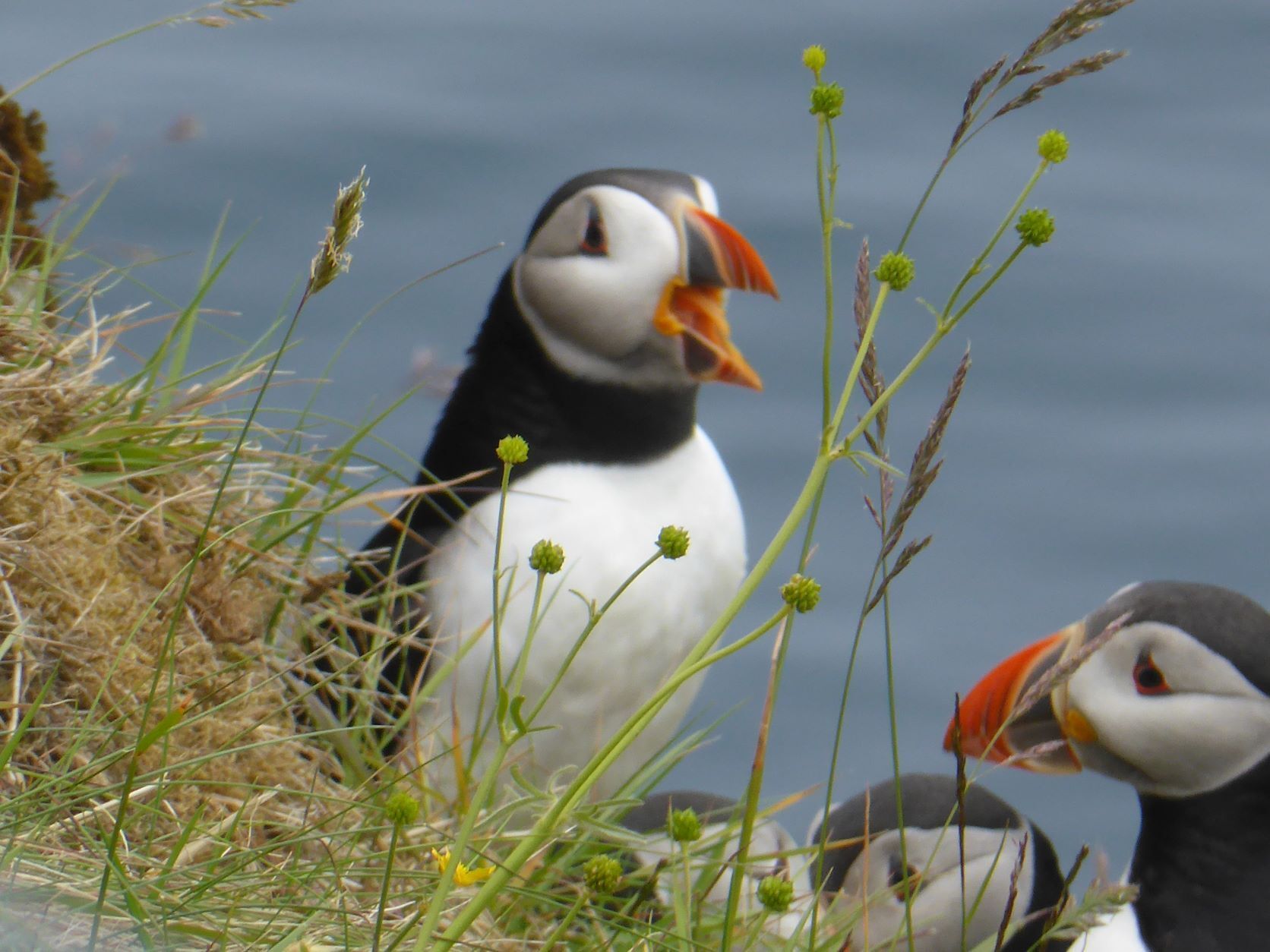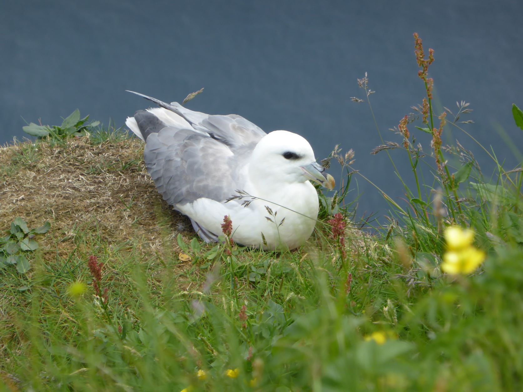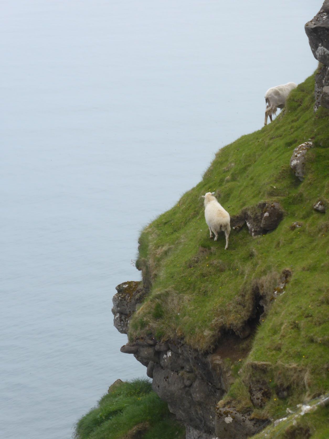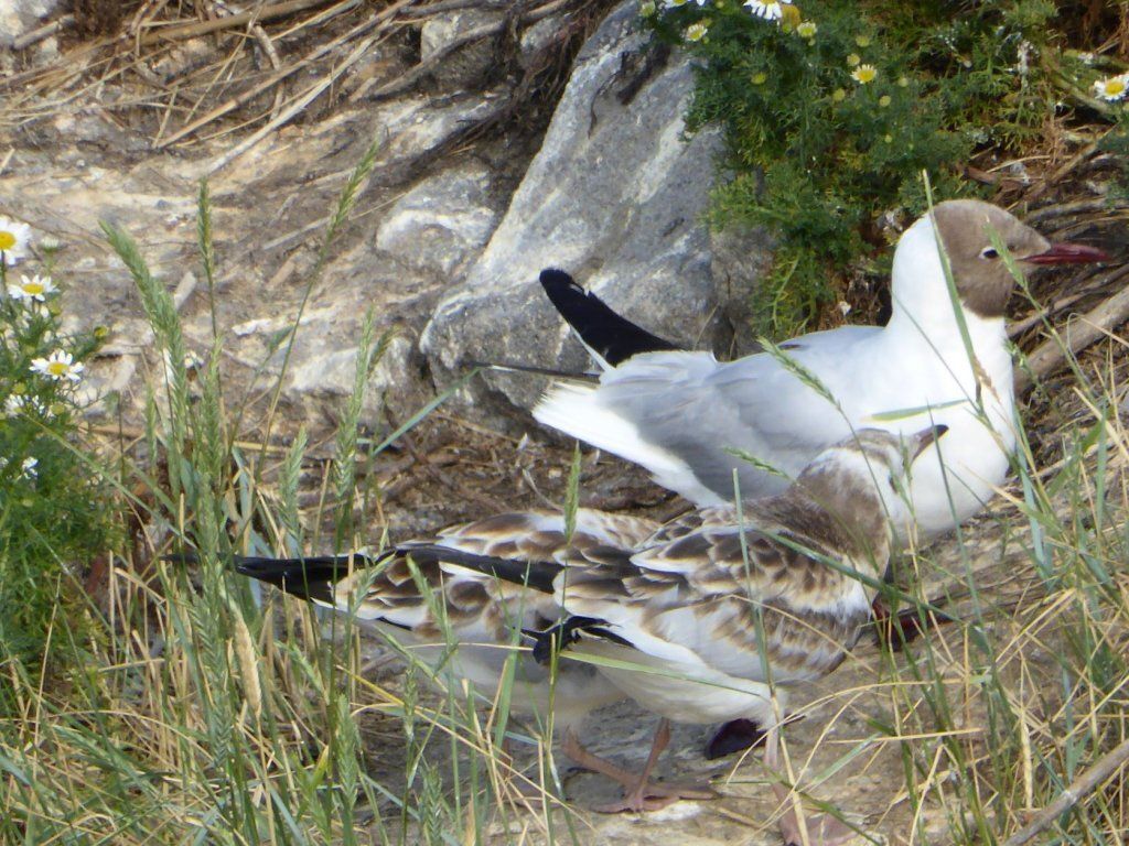 Schweren Herzens geben wir auf, hoffen auf Island und wandern auf den berühmten Vogelfelsen. Die Papageientaucher brüten in Erdlöchern von Mai bis August. Sie können gut fliegen und tauchen, nur beim Start sind sie etwas schwerfällig, weil sie so kurze Beine haben. Es sieht so putzig aus, wie sie nahe an einen Abgrund tappen und dann wegfliegen. Weiter oben ist dann der Möwenfelsen. Hier sehen wir Innigkeit und Pflege.