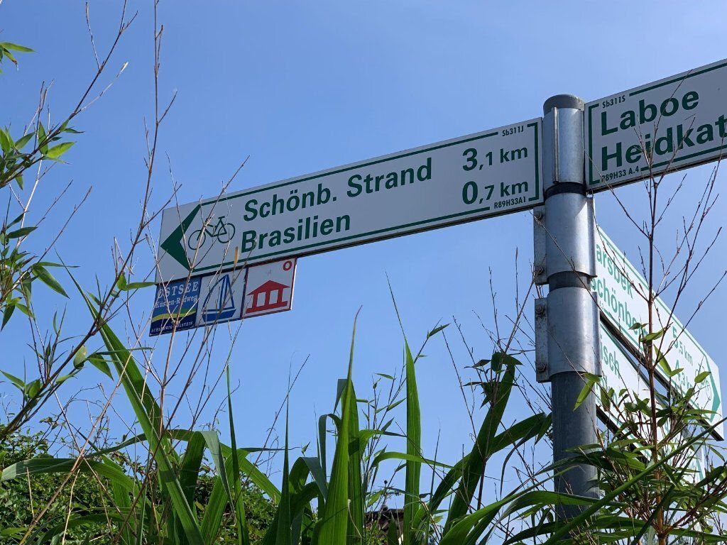 In Kalifornien baden wir. Es ist Nachbarland von Brasilien, wie der Wegweiser zeigt.