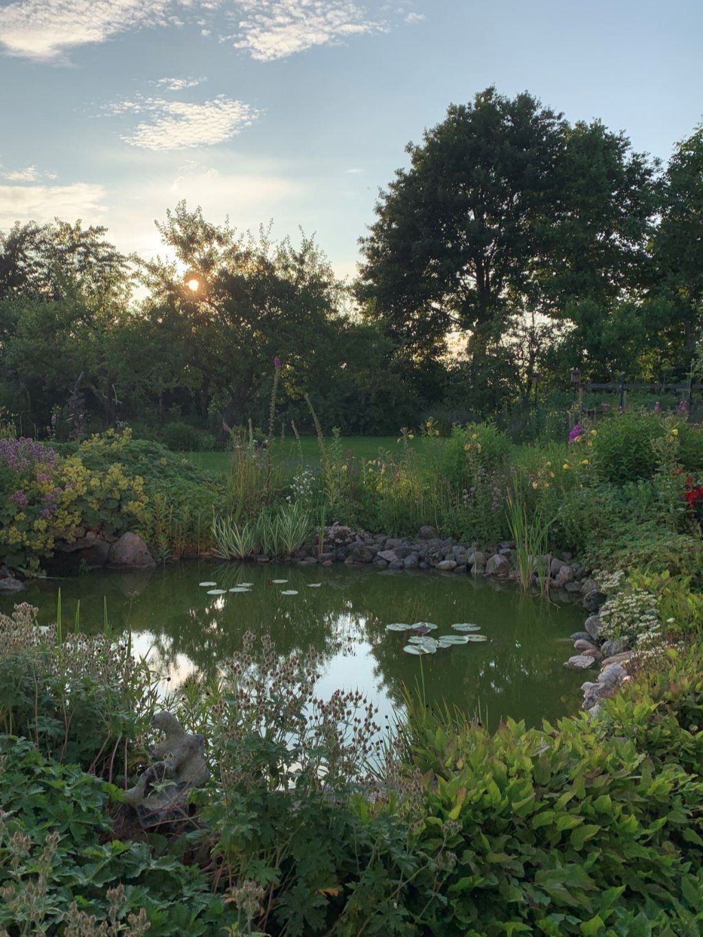 Dann fahren wir weiter nach Schleswig Holstein. Dort besuchen wir Angela und Niels, die wir in Norwegen kennengelernt haben. Sie erzählen so viele spannende Dinge, dass wir mit andern Augen das Land betrachten. Nach dem frohen Wiedersehen, packen wir zuerst das Wigwam ein. Es steht unter Linden, die grad Honig abwerfen. Wir sitzen zu Frühstück und Abendessen in ihrem paradiesischen Garten und im Wintergarten und erzählen einander Geschichten und Erfahrungen. Der feine Salat wächst ganz bio. Die Nachtkerzen verlängern den Tag. Die Sonne geht etwa um 22 Uhr unter.