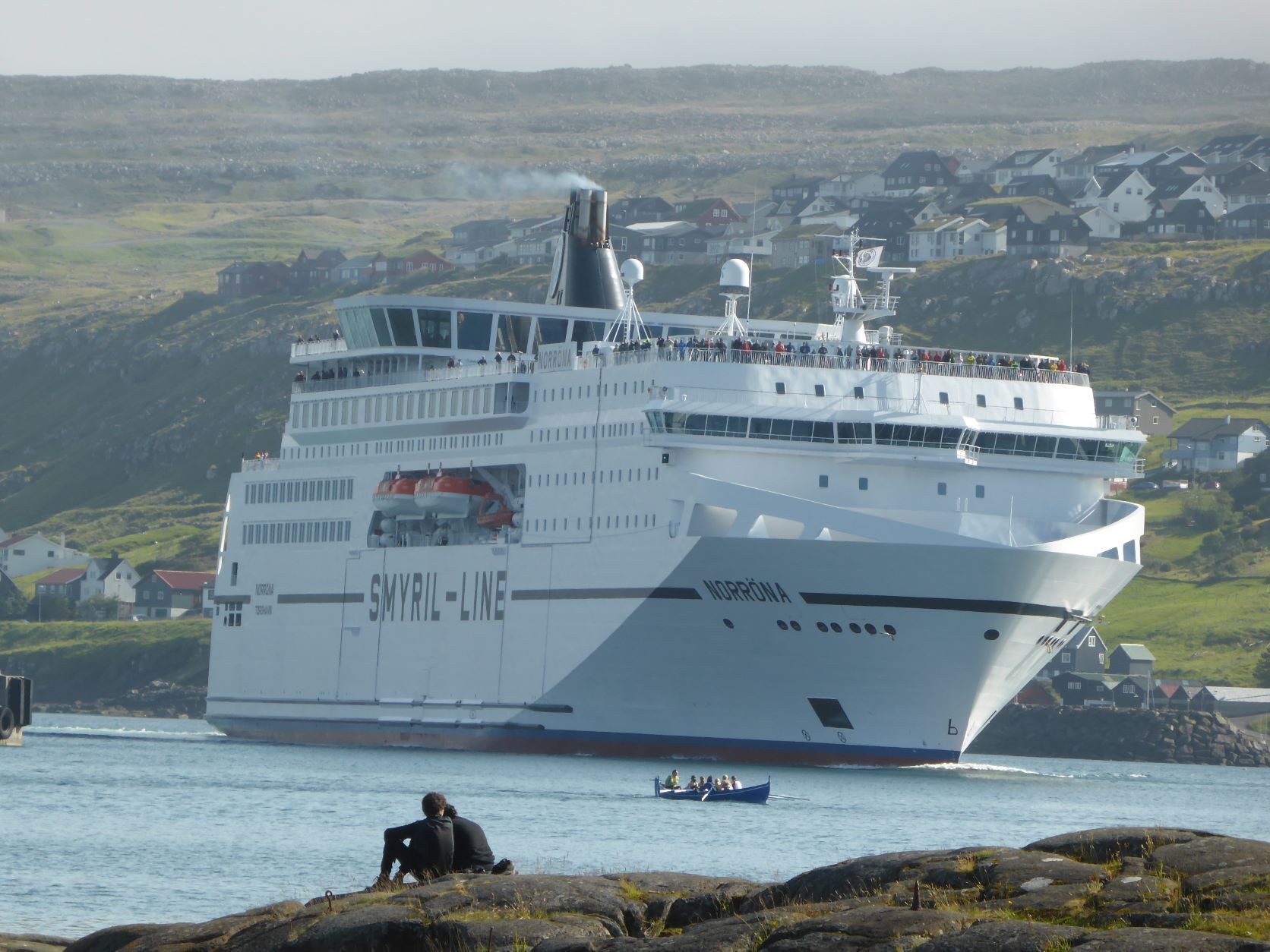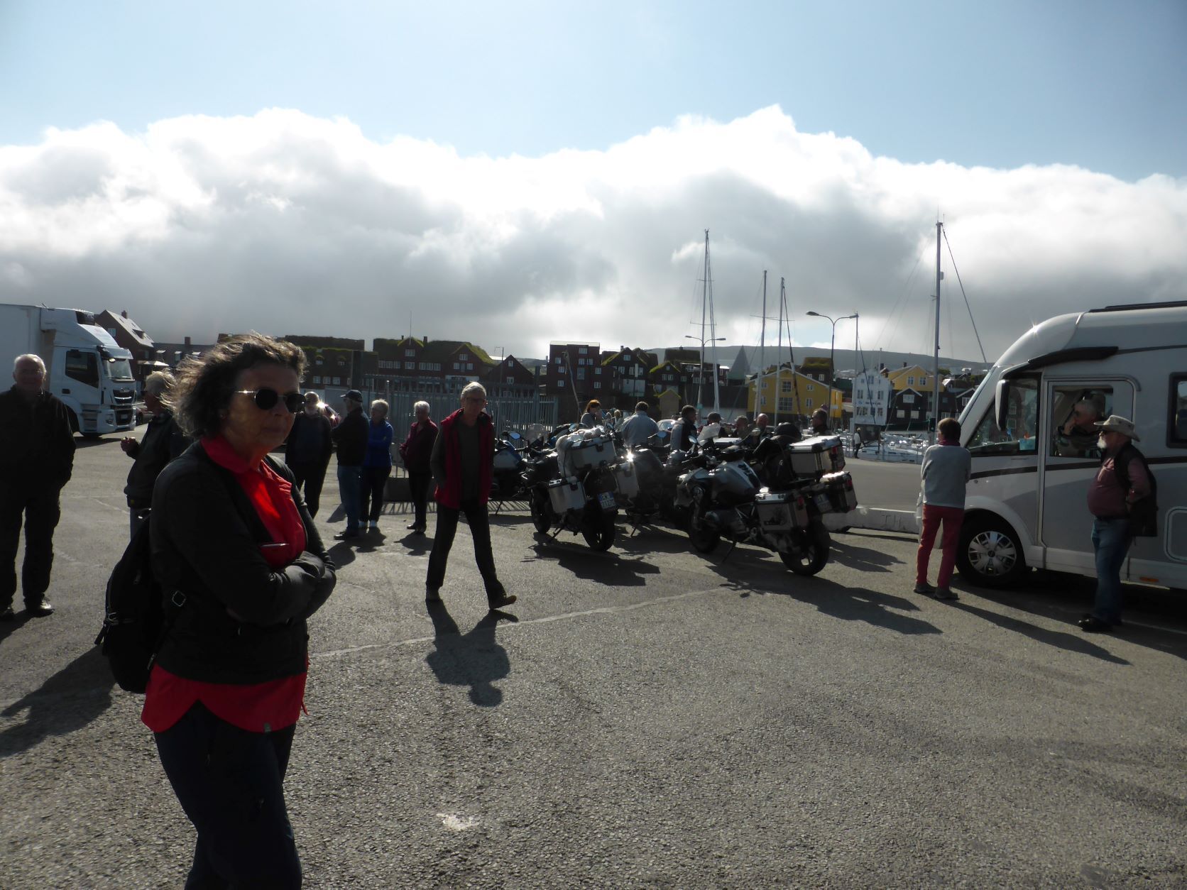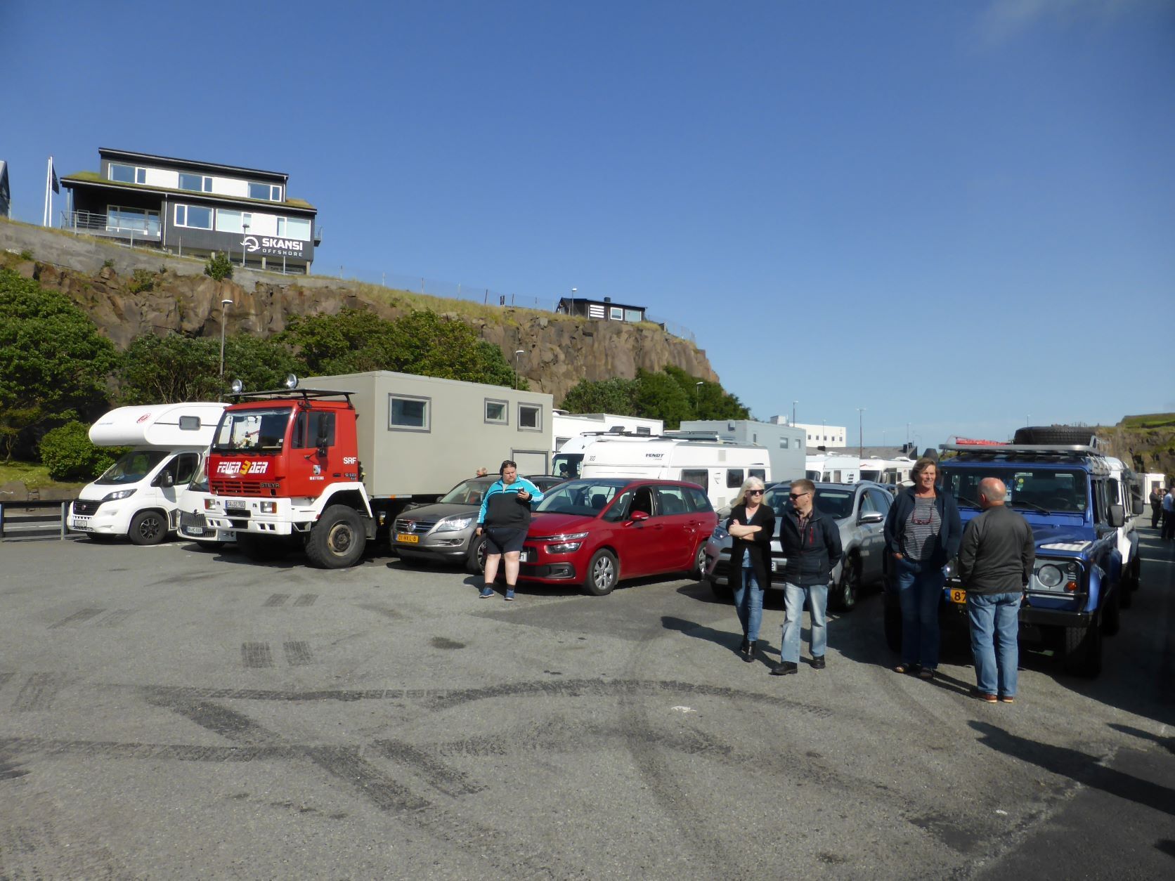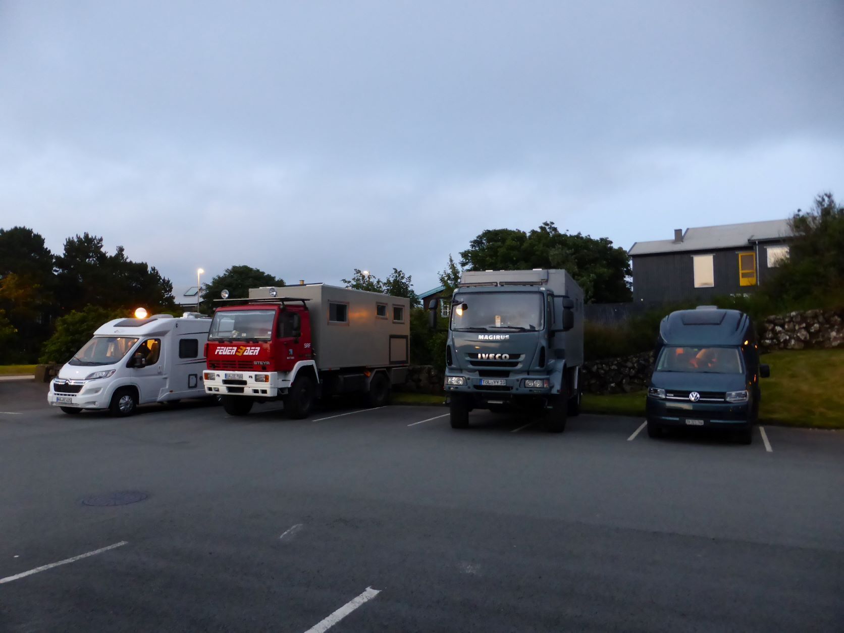 Auf der Fähre schreiben wir Texte und wählen die Fotos aus. Mit dem Schlagen, Rollen und Stampfen des Schiffes wird uns ganz flau im Magen. Erst das Nachtessen bringt die Lebensgeister wieder zurück. Es fällt uns auf, dass wir ungefragt kleinere Portionen bekommen als andere Gäste. Seniorenportionen? Nun, uns ist es recht. In der letzten Stunde stehen und sitzen alle Leute samt ihrem Gepäck auf Deck 5 und warten .... Beim Eindunkeln um 22.30 Uhr kommen wir in Torshavn an und gegen Mitternacht parken wir bei SMS, dem Einkaufszentrum. Zwei Monster halten uns den Strassenlärm ab.