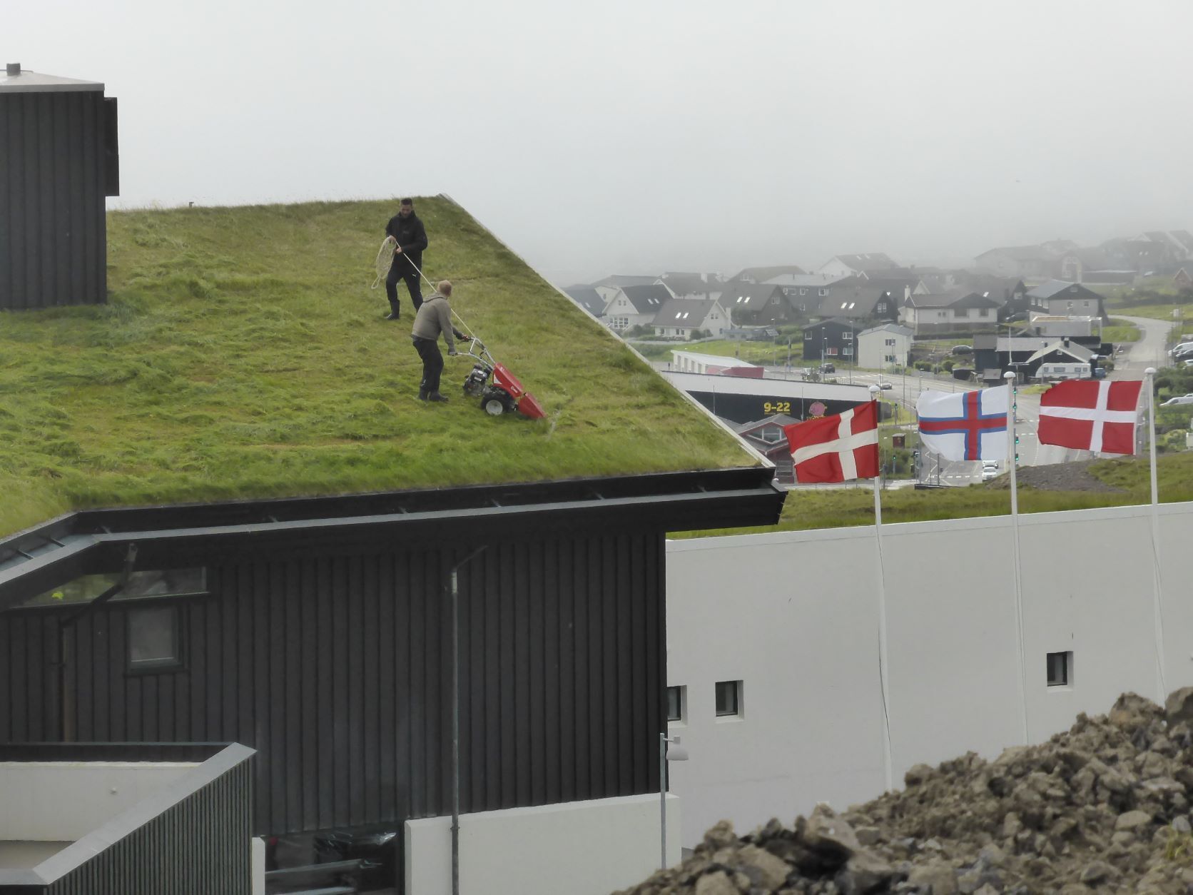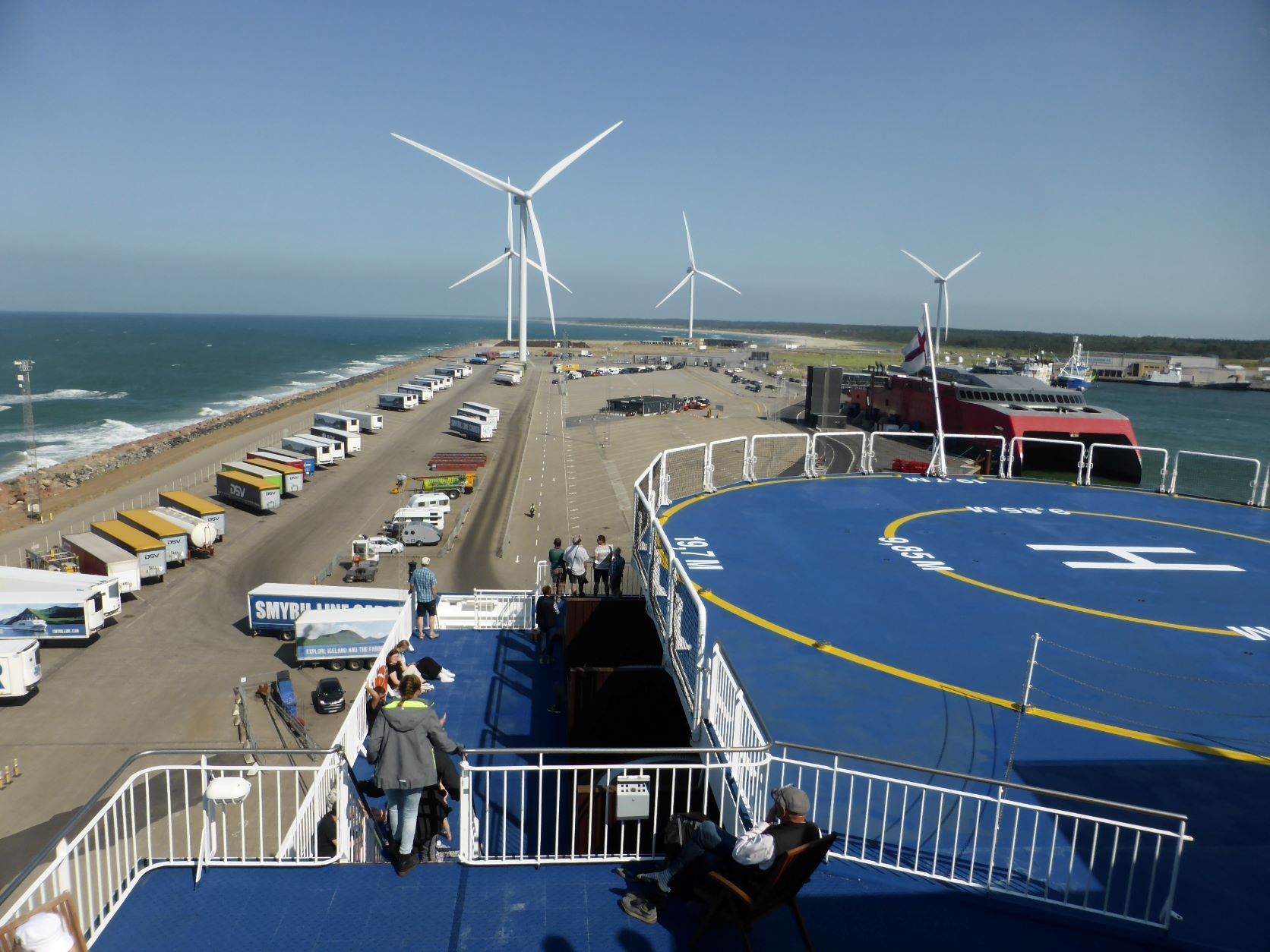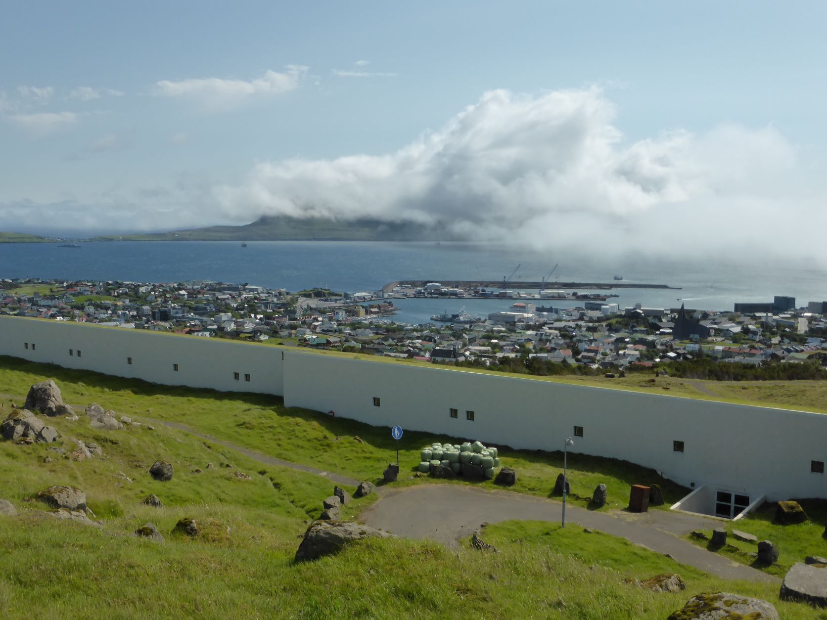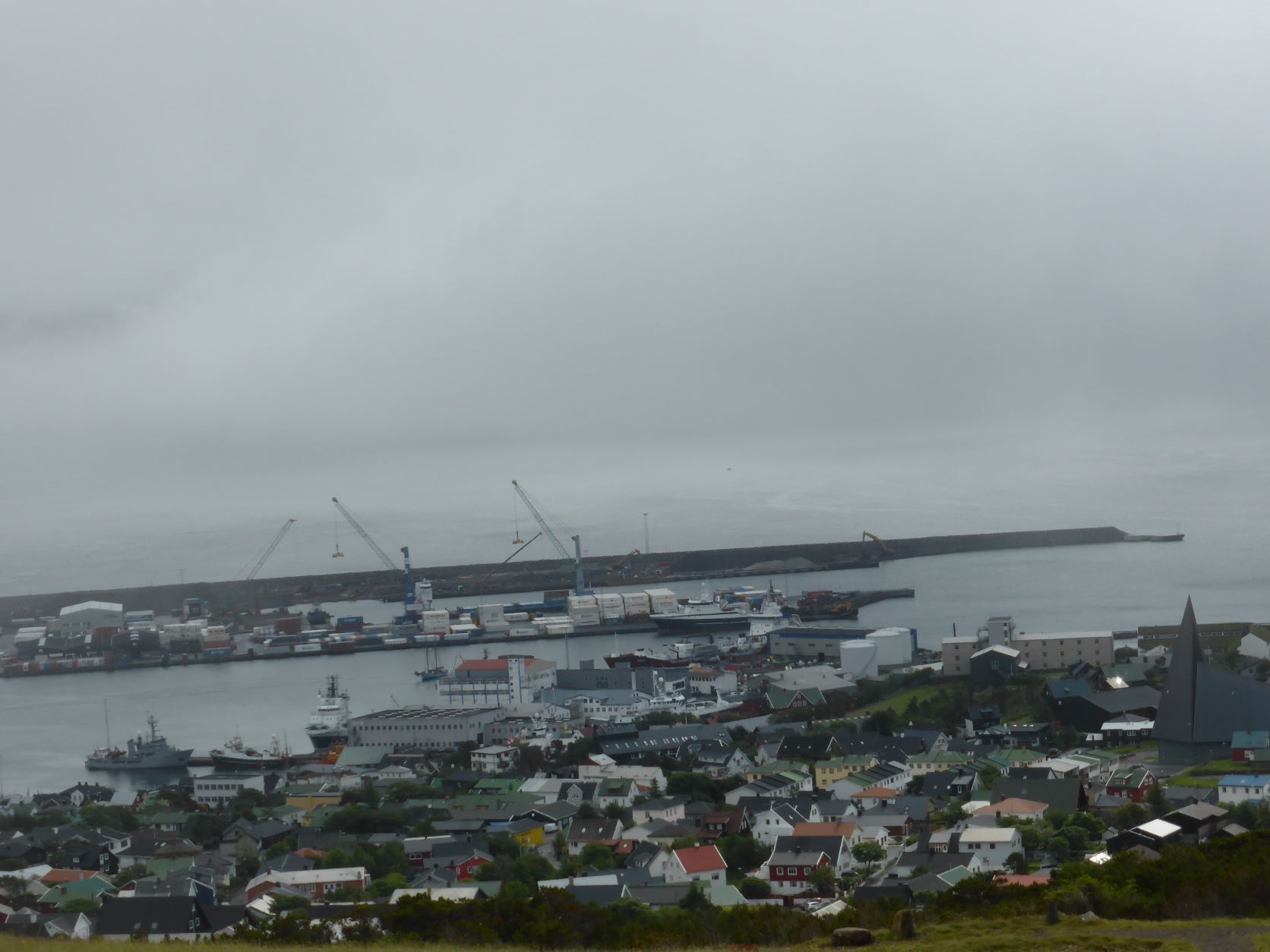 Auf der Fähre schreiben wir Texte und wählen die Fotos aus. Mit dem Schlagen, Rollen und Stampfen des Schiffes wird uns ganz flau im Magen. Erst das Nachtessen bringt die Lebensgeister wieder zurück. Es fällt uns auf, dass wir ungefragt kleinere Portionen bekommen als andere Gäste. Seniorenportionen? Nun, uns ist es recht. In der letzten Stunde stehen und sitzen alle Leute samt ihrem Gepäck auf Deck 5 und warten .... Beim Eindunkeln um 22.30 Uhr kommen wir in Torshavn an und gegen Mitternacht parken wir bei SMS, dem Einkaufszentrum. Zwei Monster halten uns den Strassenlärm ab.