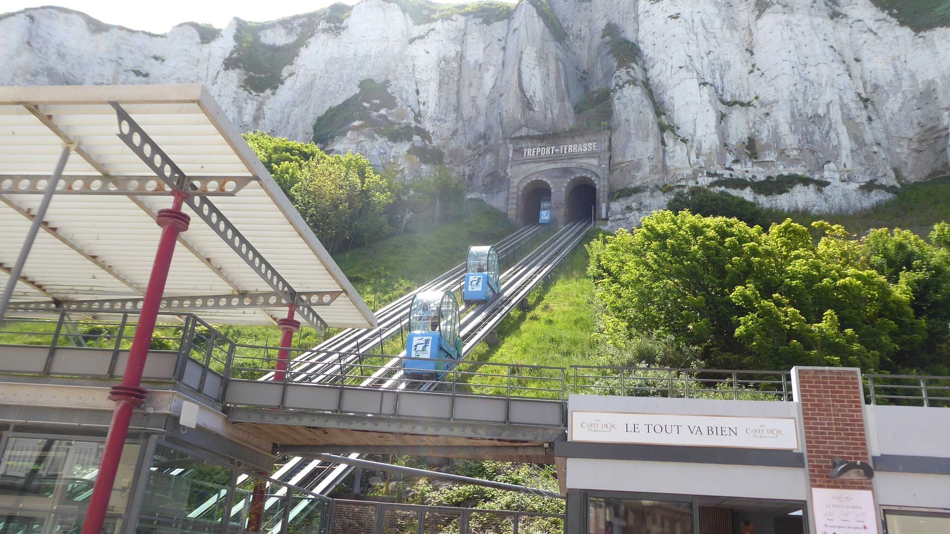Der Stellplatz ist hoch über dem Meer. Wir fahren mit dem Funiculaire hinunter in den Ort und schnuppern Meeresluft. Wegen meines Achillessehnenproblems habe ich die Krücken mitgenommen, so wird der Radius grösser. Wir gehen also dem Quai entlang, statten der Kirche St. Jean Major einen Besuch ab. Dann werde ich ganz verwegen und wir gehen weiter um den Hafen herum bis nach Mers-les-Bains. Da gibt es eine sehr schöne Wasserfront mit Häusern aus der Belle Epoche. Wir ruhen uns aus bei einem Weisswein am Strand. Mit dem gleichen Rückweg war es eine strenge Tour für mich.