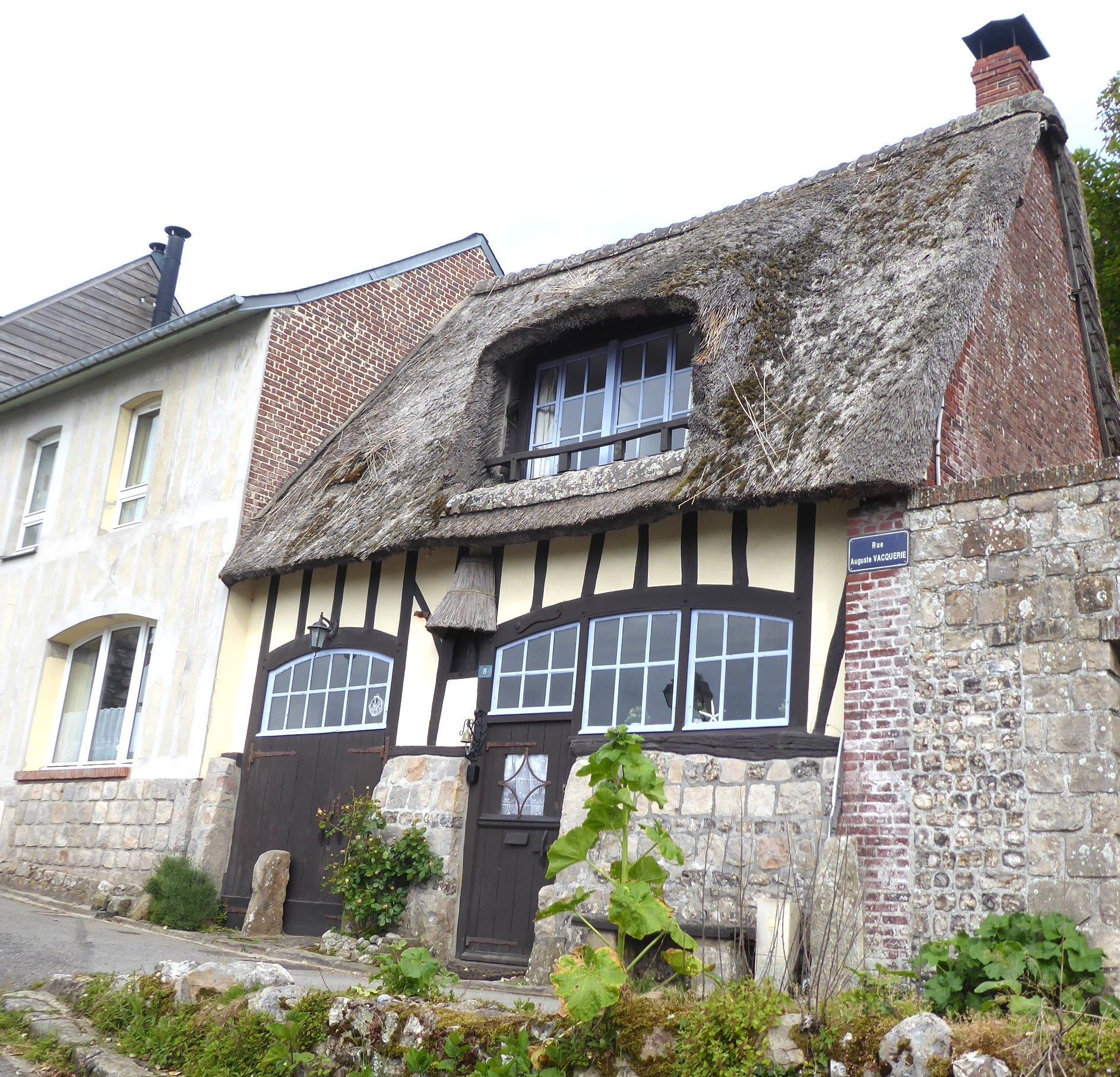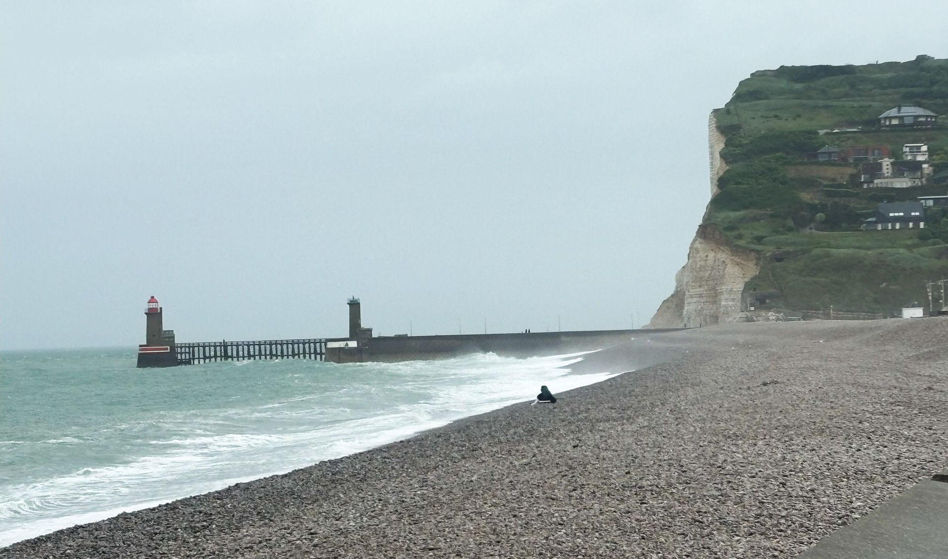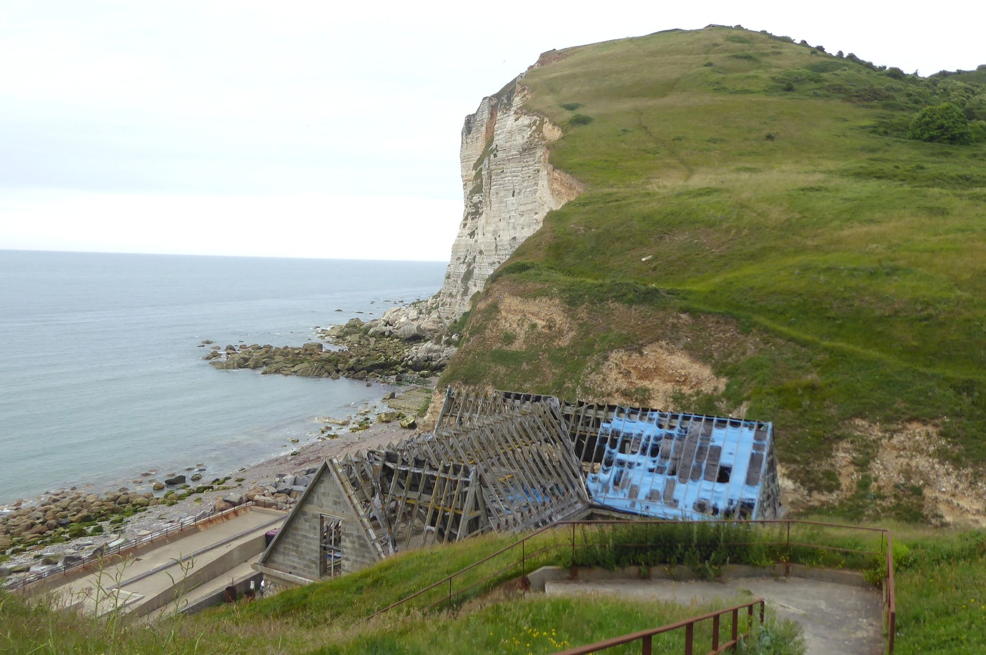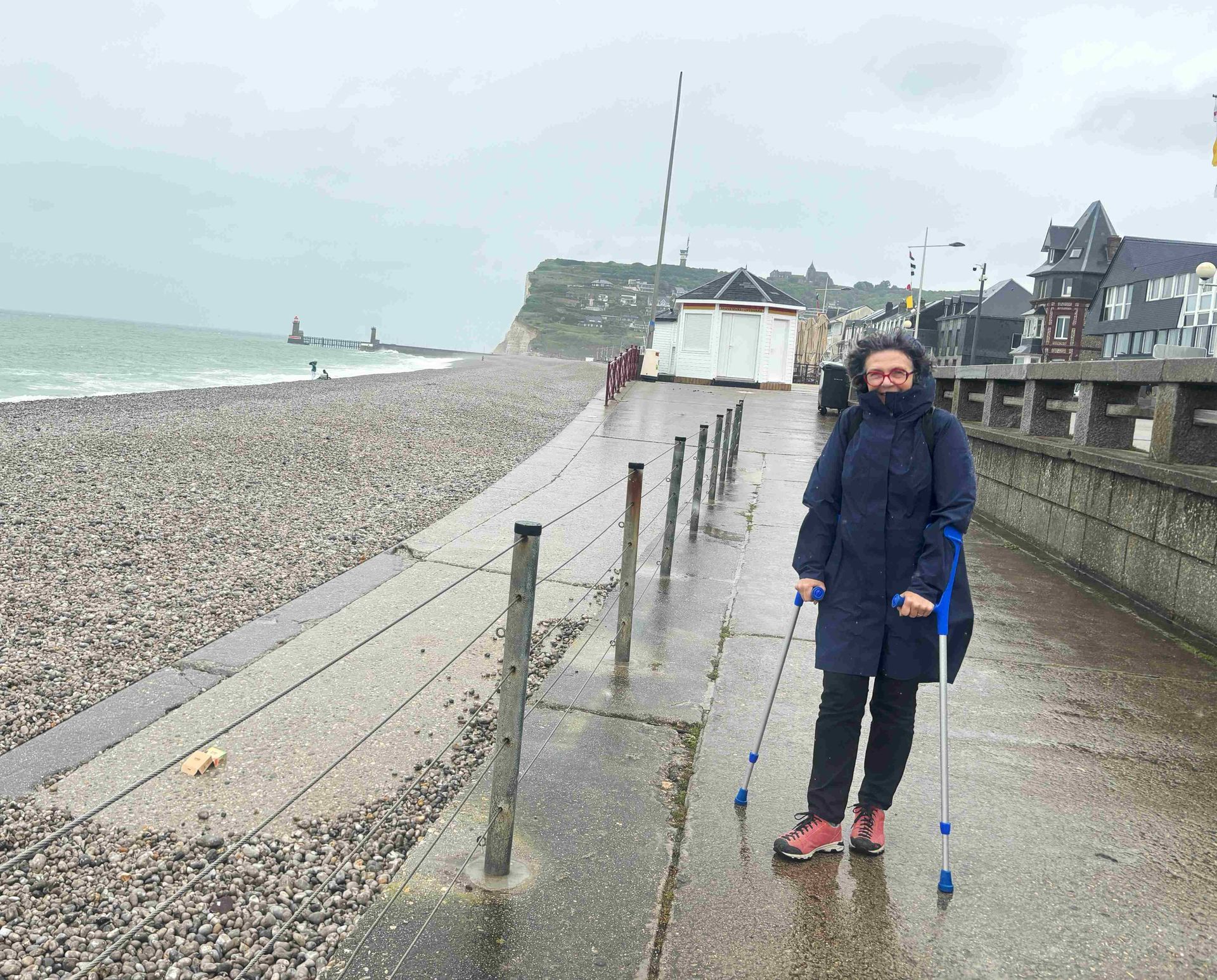 Über ganz enge Landstrassen fahren wir nach Bruneval zum zweitgrössten Tanker-Hafen Europas. Am Sonntag ist keiner da und einen Parkplatz für Camper gibt es auch nicht, also fahren wir weiter zum Memorial. Dieses ist aber in der nächsten Bucht unter dem Dorf Bruneval. Wir kommen nur bis kurz davor, dann ist die Durchfahrt für Camper verboten. Wir parken am Rand und ich gehe mit den Krücken durch das vergessene Dorf, das anfangs 20. Jahrhundert ein beliebter Badeplatz war.