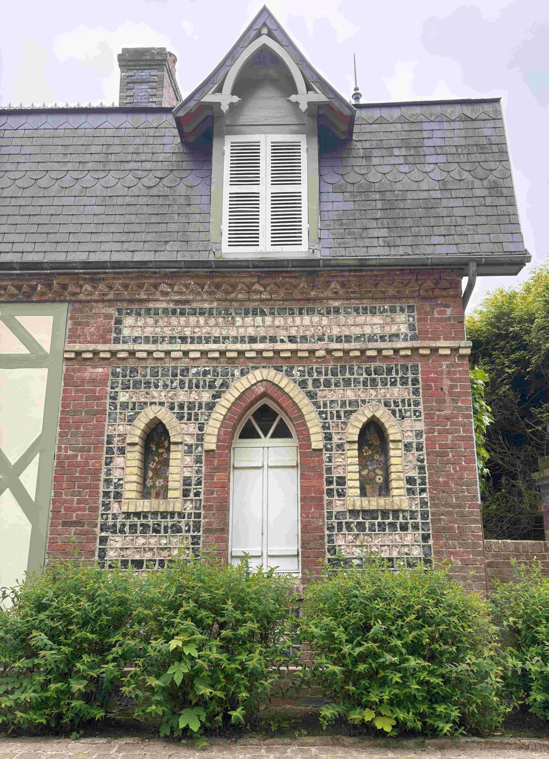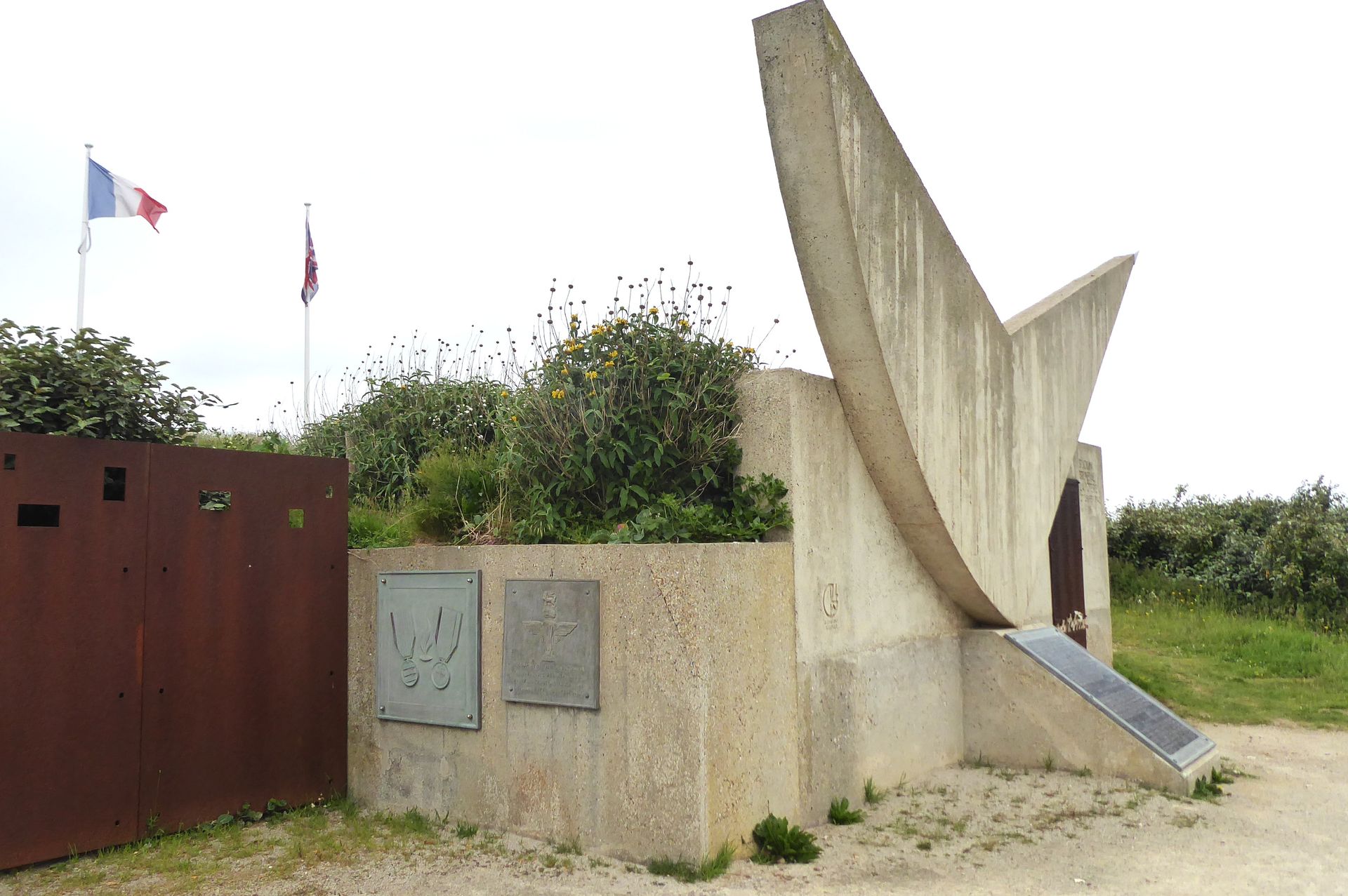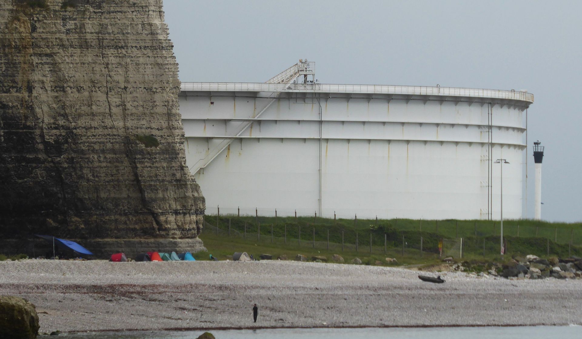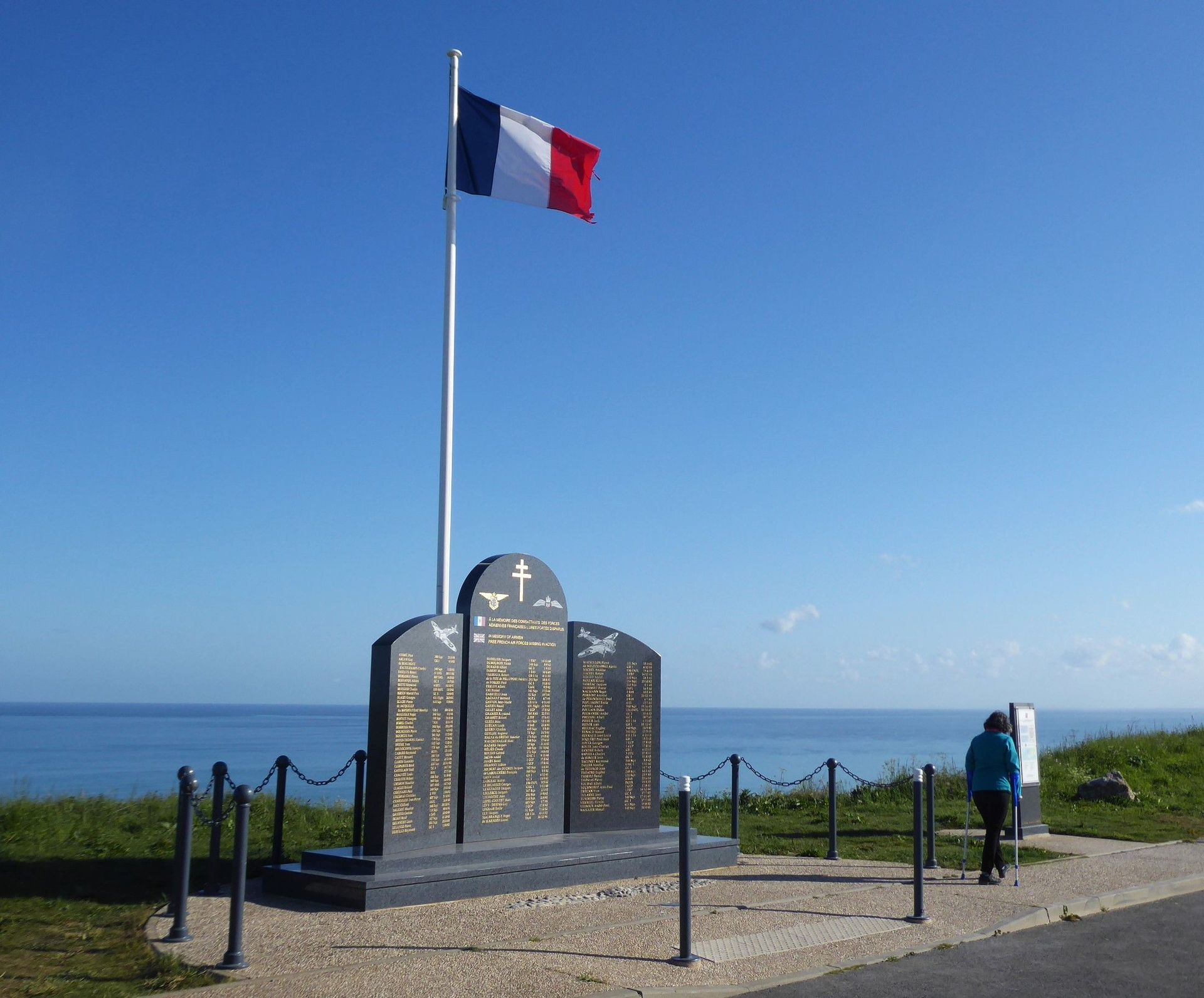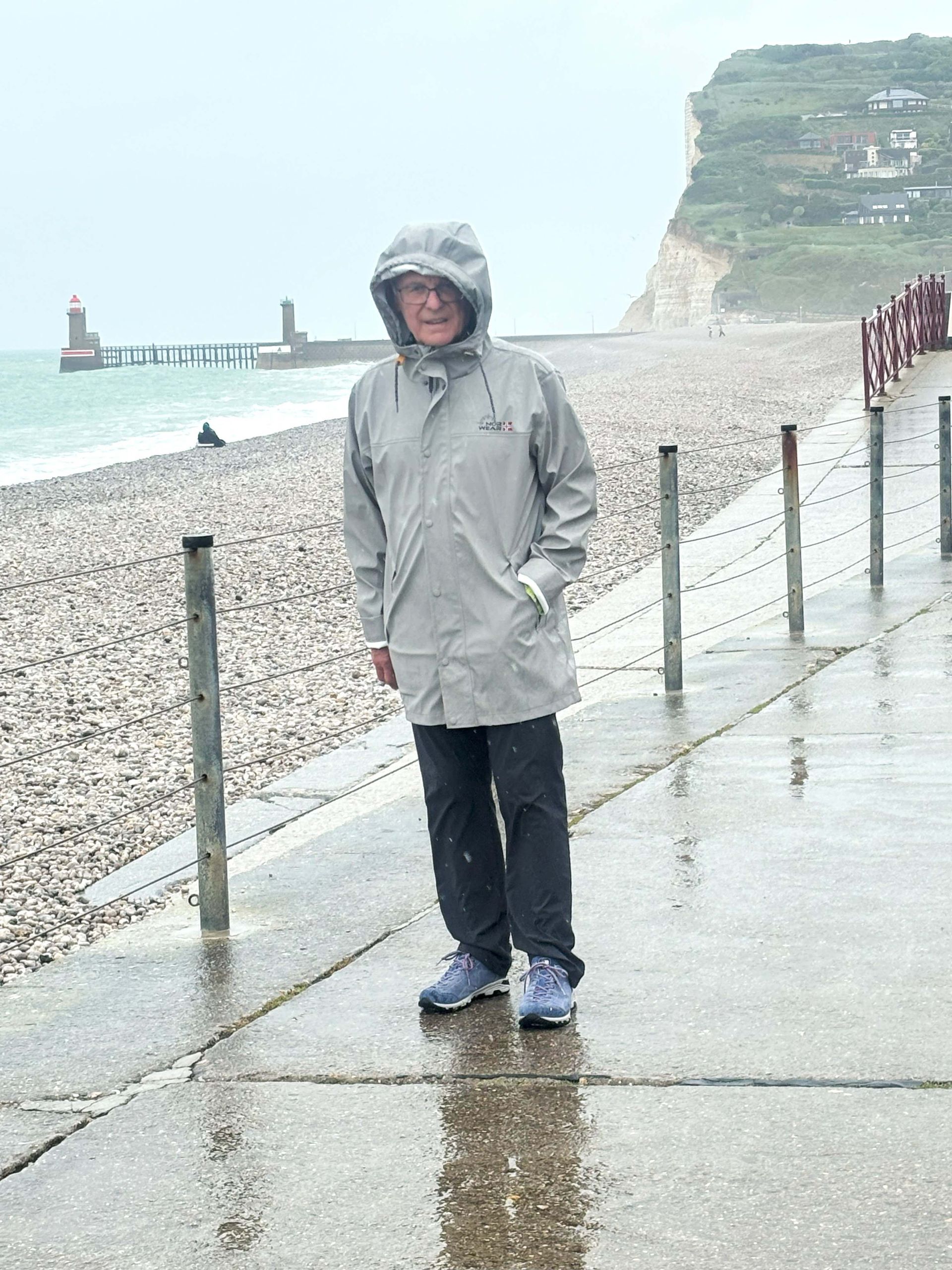 Über ganz enge Landstrassen fahren wir nach Bruneval zum zweitgrössten Tanker-Hafen Europas. Am Sonntag ist keiner da und einen Parkplatz für Camper gibt es auch nicht, also fahren wir weiter zum Memorial. Dieses ist aber in der nächsten Bucht unter dem Dorf Bruneval. Wir kommen nur bis kurz davor, dann ist die Durchfahrt für Camper verboten. Wir parken am Rand und ich gehe mit den Krücken durch das vergessene Dorf, das anfangs 20. Jahrhundert ein beliebter Badeplatz war.