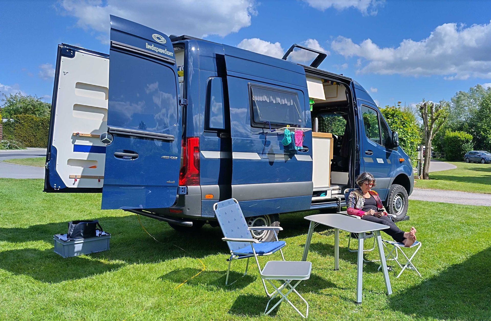 Über Auffahrt wollen wir einen festen Platz haben, weil dann sehr viele Leute unterwegs sind. Ein echter Panoramaplatz für 4 Tage. Steil unten liegt der Ort. Es ist gerade Ebbe.