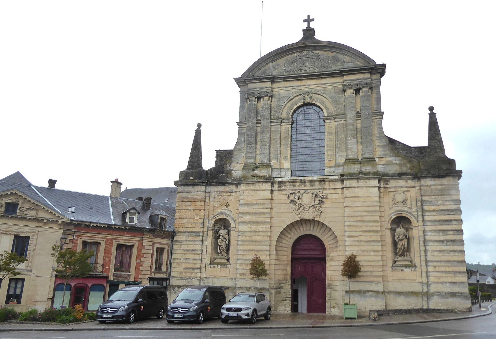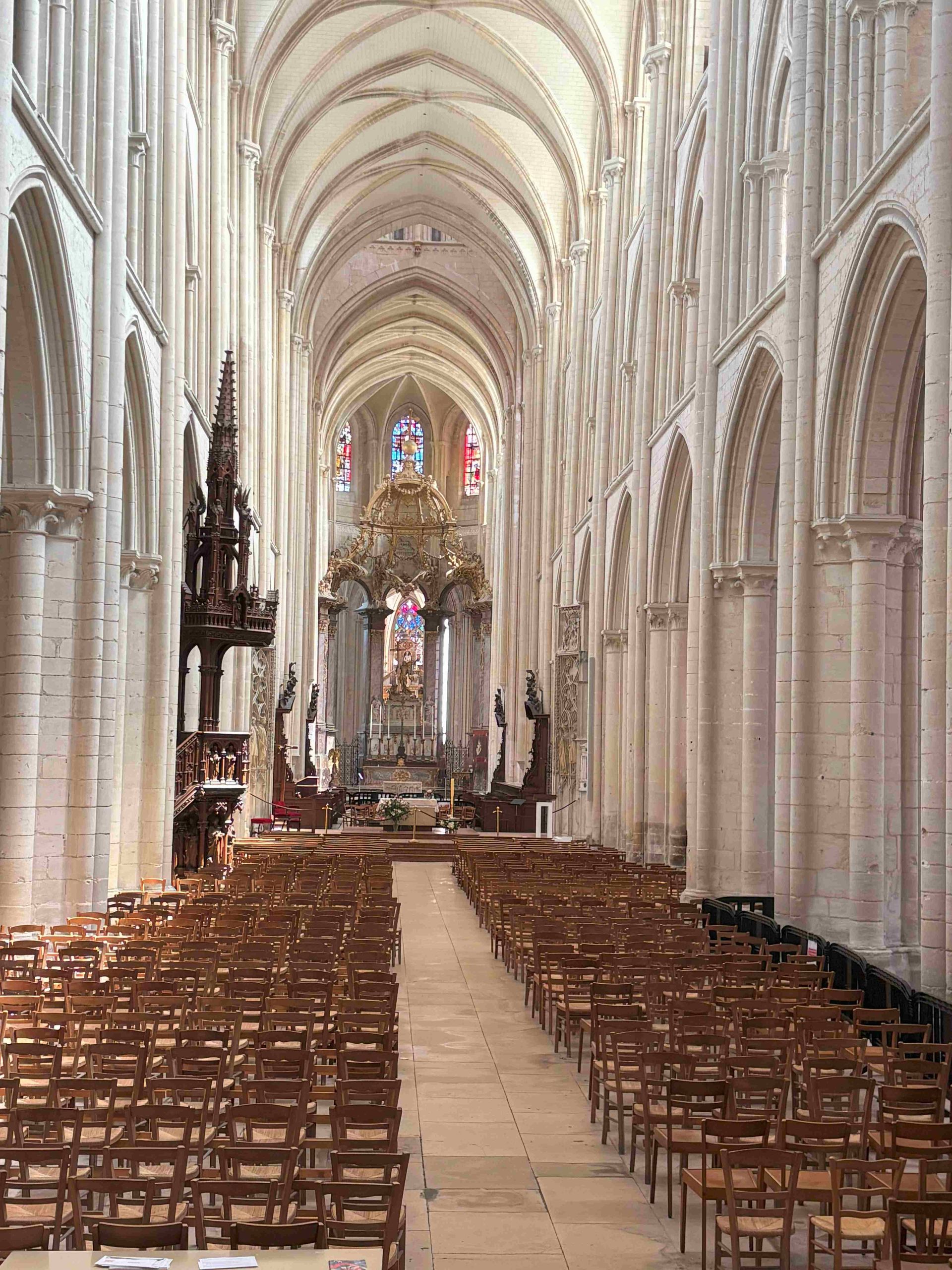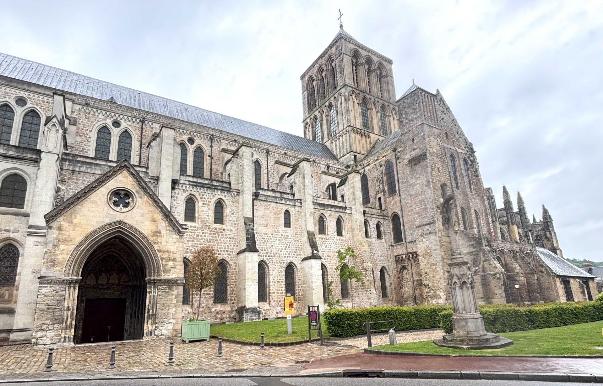 Von der Kirche St. Etienne, gut für einen Sitz am Trockenen, gehen wir weiter zur Abbey St. Trinité durch die einzige Fussgängerzone. Leider ist in der Kirche gerade eine Abschiedsfeier, sodass wir uns nur von der Länge und Höhe beeindrucken lassen können. Die Kirche war eine sehr bedeutende und wurde durch grosse Schenkungen der normannischen Herzöge so gross gebaut. Sie ist nämlich 127 m lang und nur 3 m kürzer als die Notre-Dame in Paris. Von Aussen bringen wir sie nicht aufs Bild.