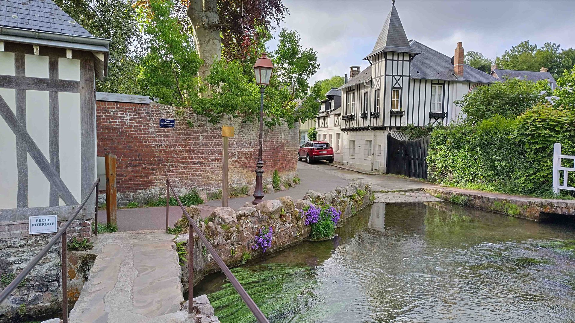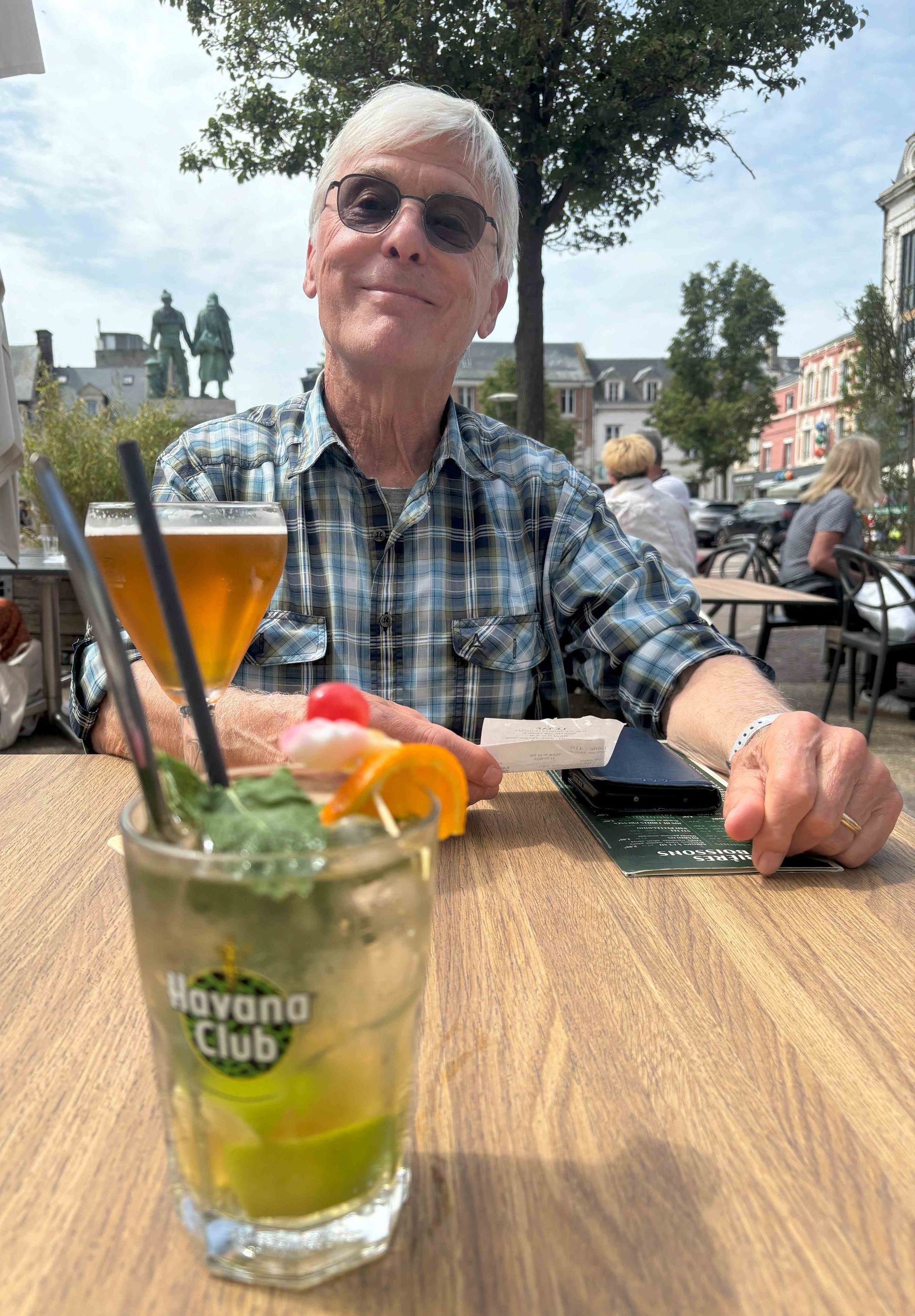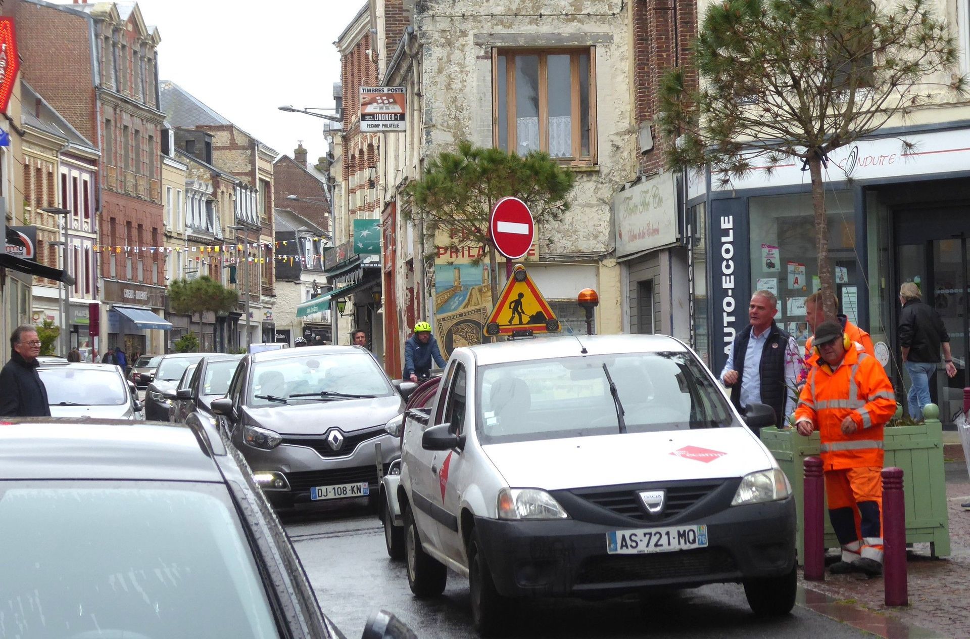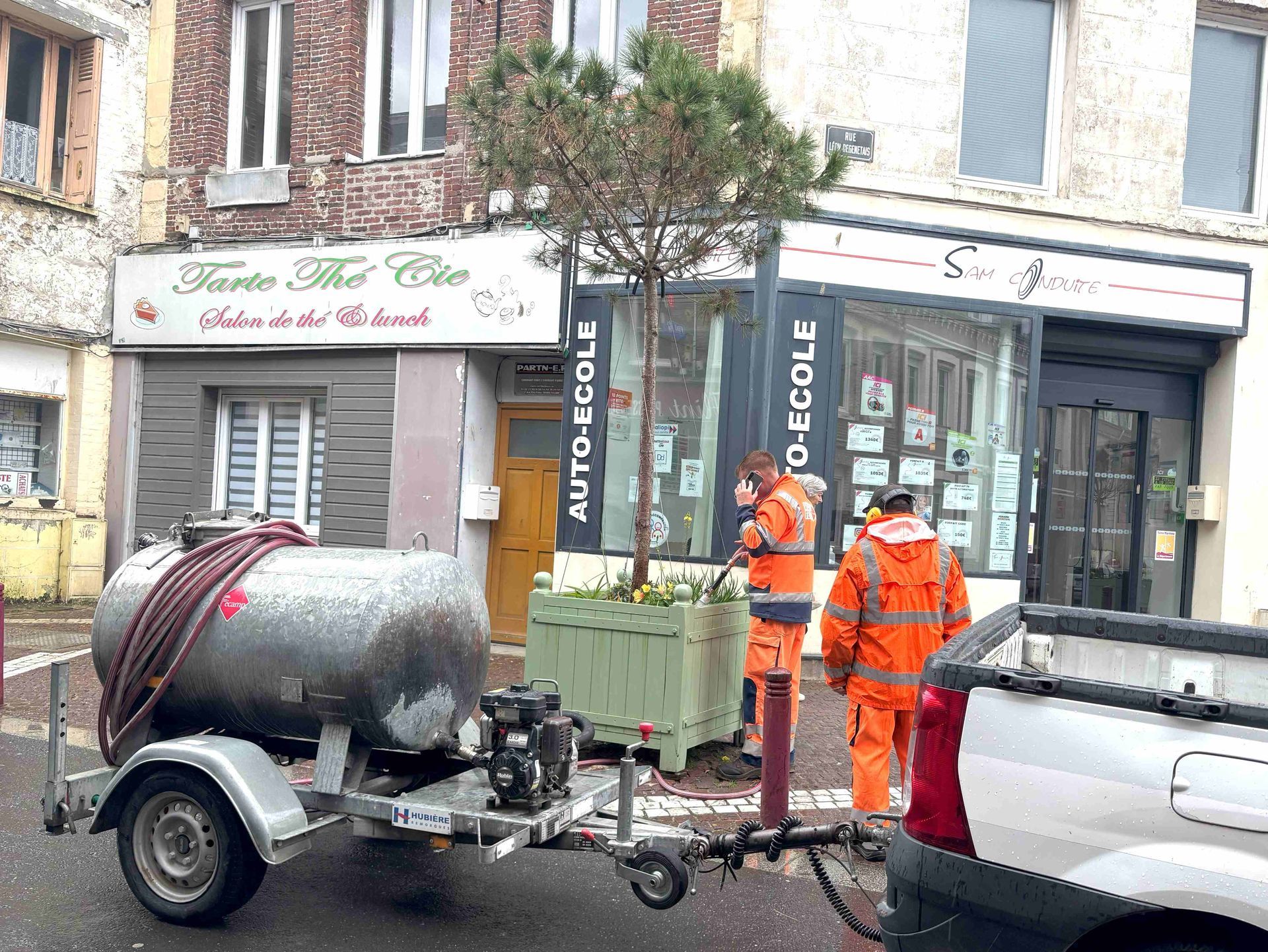 In einem Salon de Thé trinken wir Kir Vin blanc und Kir Normand. Der ist mit Cidre gemacht, nicht mein Geschmack. Wir wandern weiter und entdecken zwei Stadtarbeiter, die die Blumentröge giessen. Sie sind so vertieft, dass sie den Verkehr an der Kreuzung lahmlegen. Eine Kolonne Autofahrer wartet geduldig auf die Weiterfahrt.
