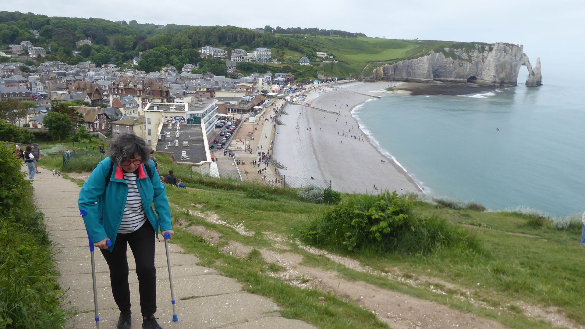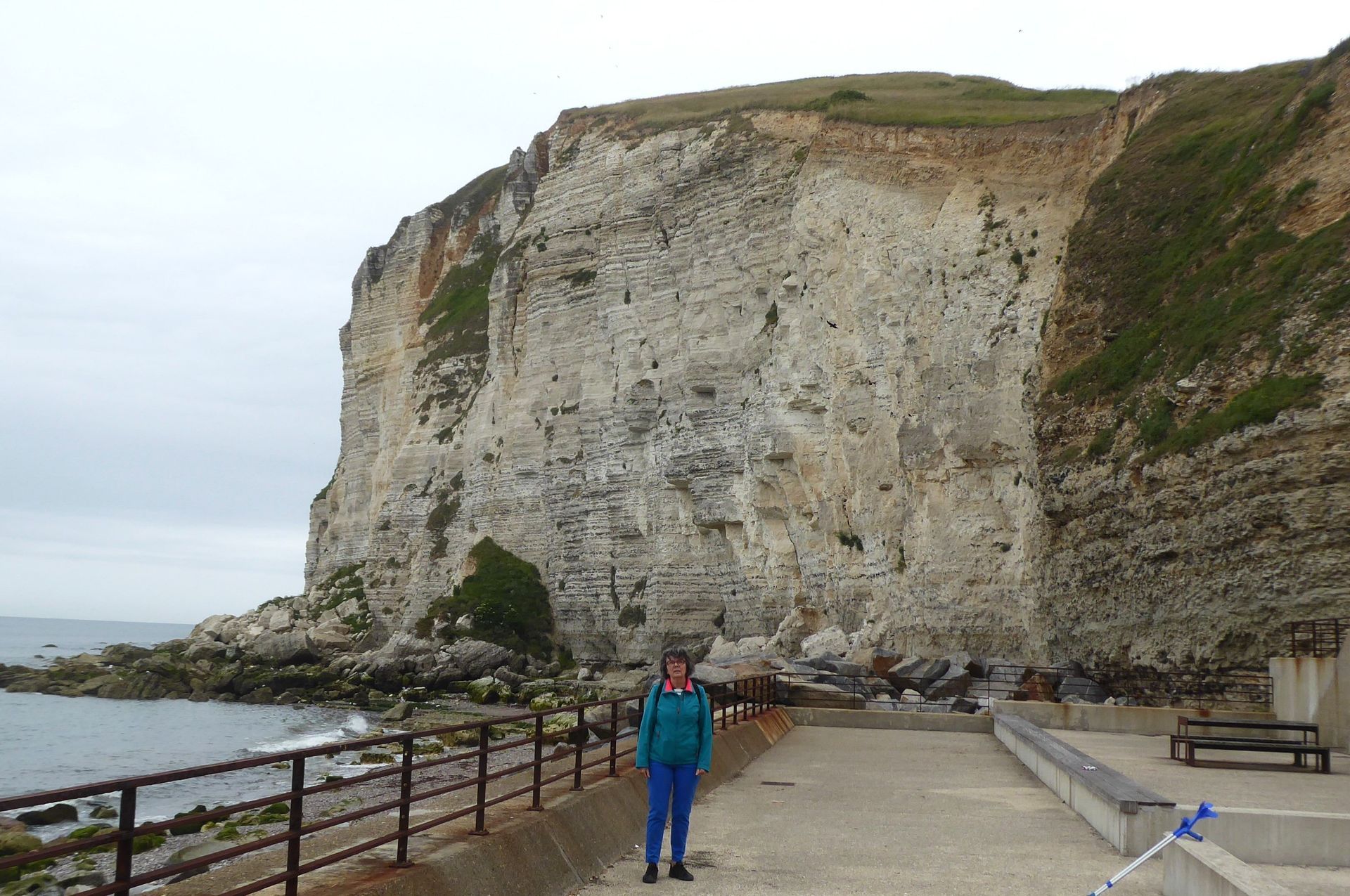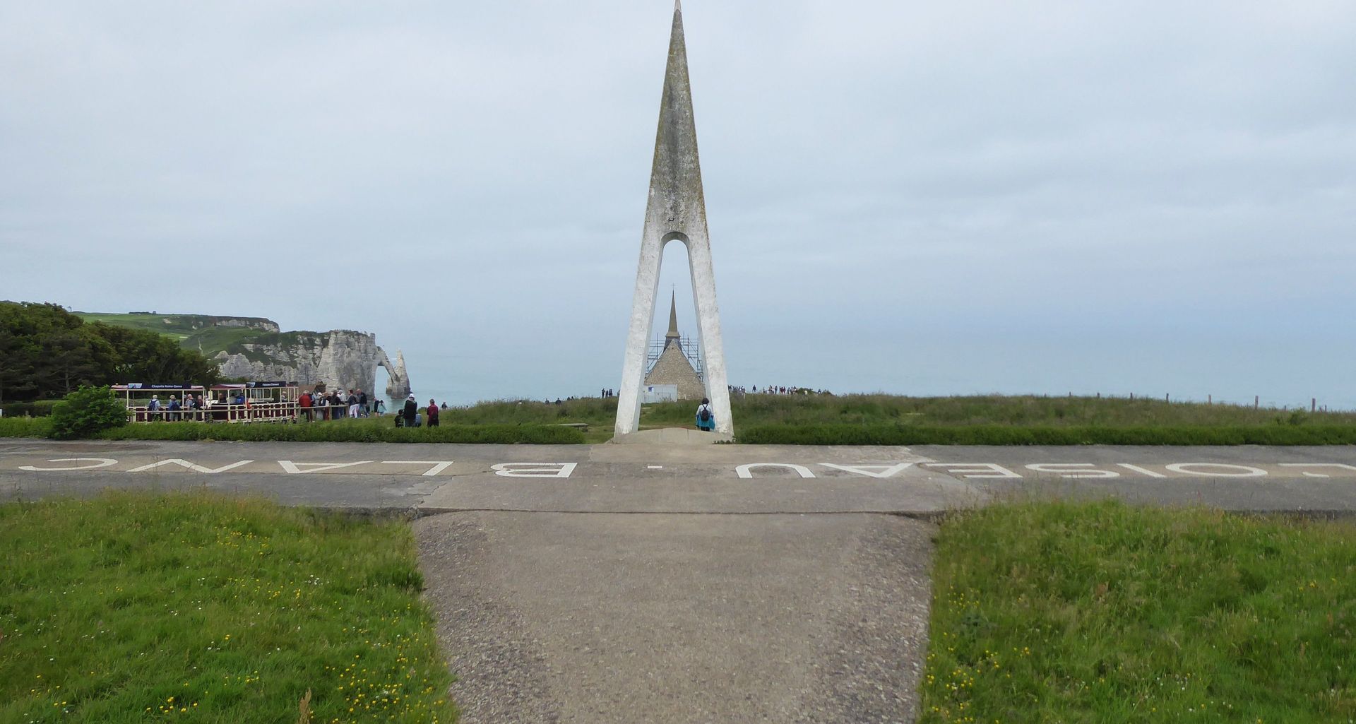 Etretat ist ein typischer und bekannter Touristenort. Dort waren schon viele Maler und Dichter und die Felsformation "Elefant" ist berühmt. Wir fahren mit dem öffentlichen Bus um 9 Uhr. Bei der Ankunft eine halbe Stunde später hat es schon viele Leute. Wir gehen zum Strand und steigen dann über viele Treppen auf die Falaise, ziemlich anstrengend. Das Museum für die beiden Atlantiküberquerer ist zu, aber es gibt ein Freiluftdenkmal, weil sie in Etretat zum letzten Mal gesehen wurden.