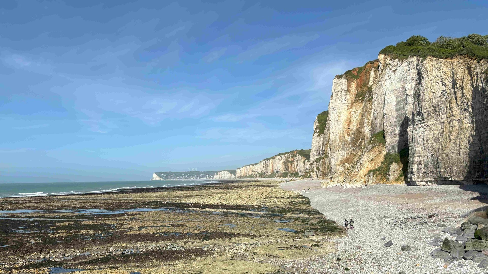 Vom Stellplatz in Veules-les-Roses steigen wir steil zum Strand hinunter und bewundern die Falaises, die weissen Felsen. Auf dem Aufstiegsweg macht der Ort seinem Namen alle Ehre.