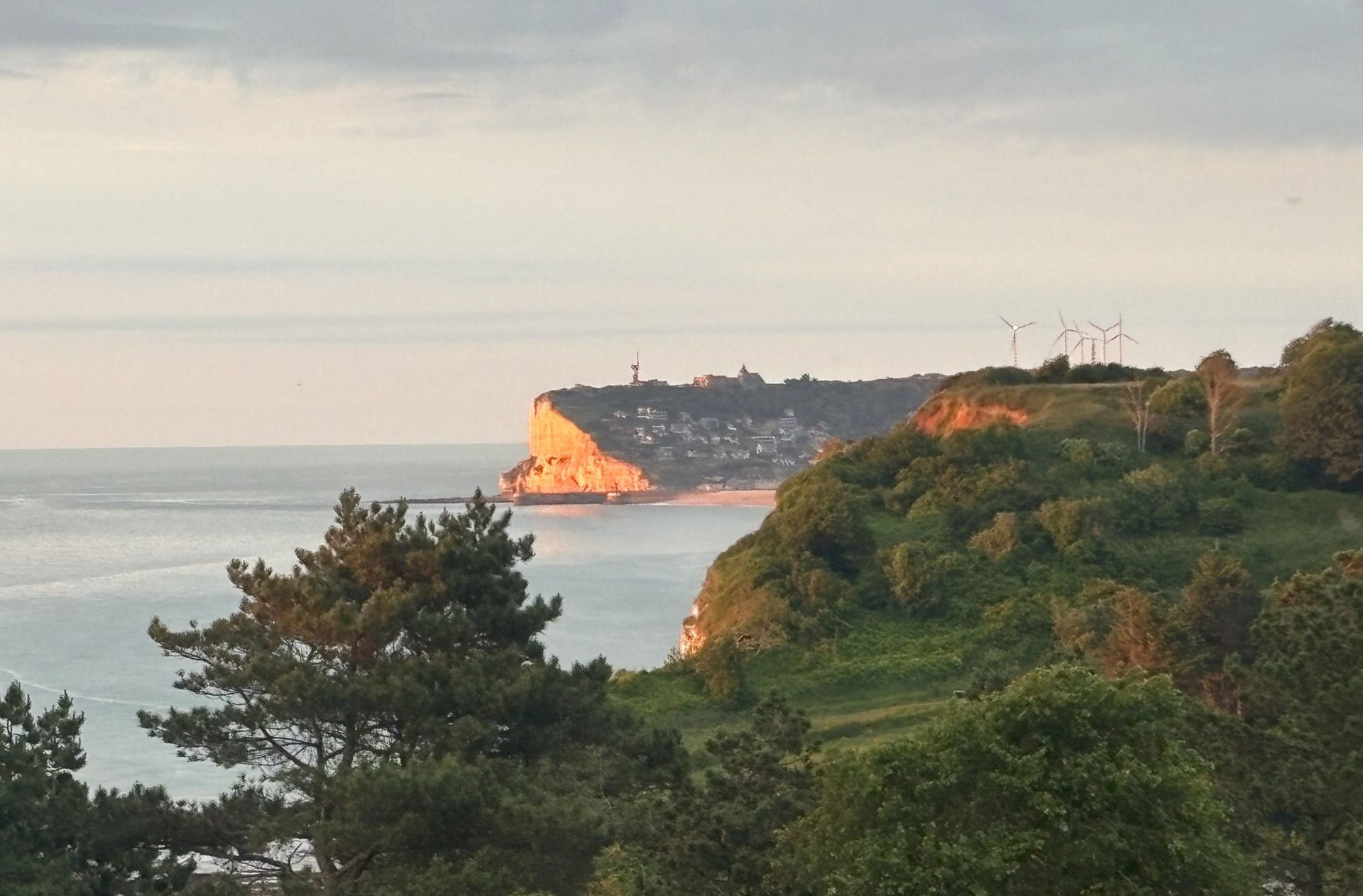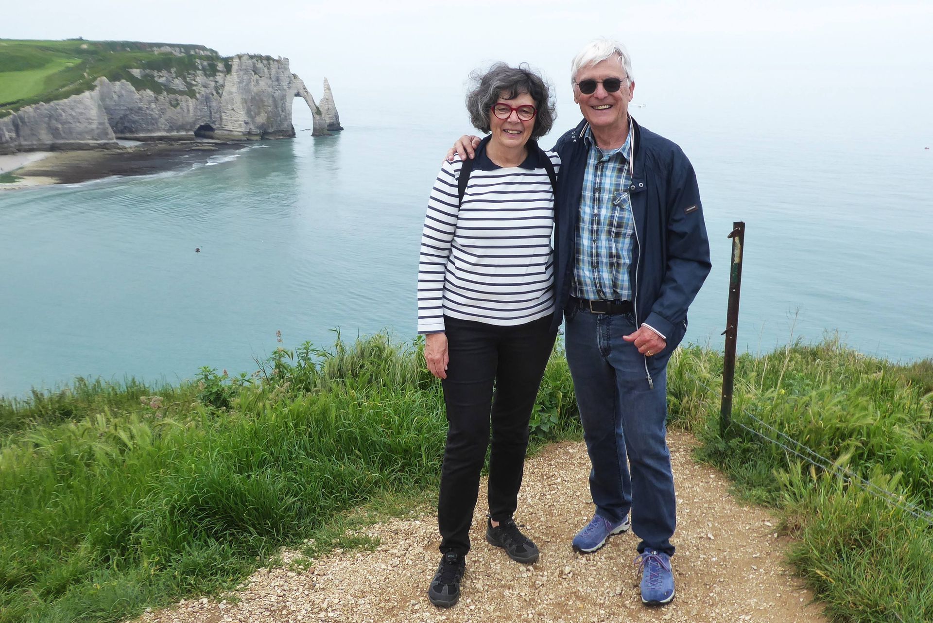 Dieser Platz ist direkt unter den Felsen und in der zweiten Reihe zum Strand. Wir gehen dem Hafenbecken entlang bis in den Ort, schauen in die Kirche, die eine wirklich schöne Glasfront zeigt. Am nächsten Morgen fährt Hans ein schmales Strässchen hinauf zum Parkplatz von Bunkern. Die sind zwar abgesperrt, aber wir lesen Tafeln vom misslungenen Angriff der Briten 1940. 1927 flogen zwei Kampfpiloten, Nungesser und Coli, von Paris nach New York, kamen aber dort nie an und wurden auch nie gefunden. Erst Charles Lindbergh gelang der Überflug in umgekehrter Richtung.