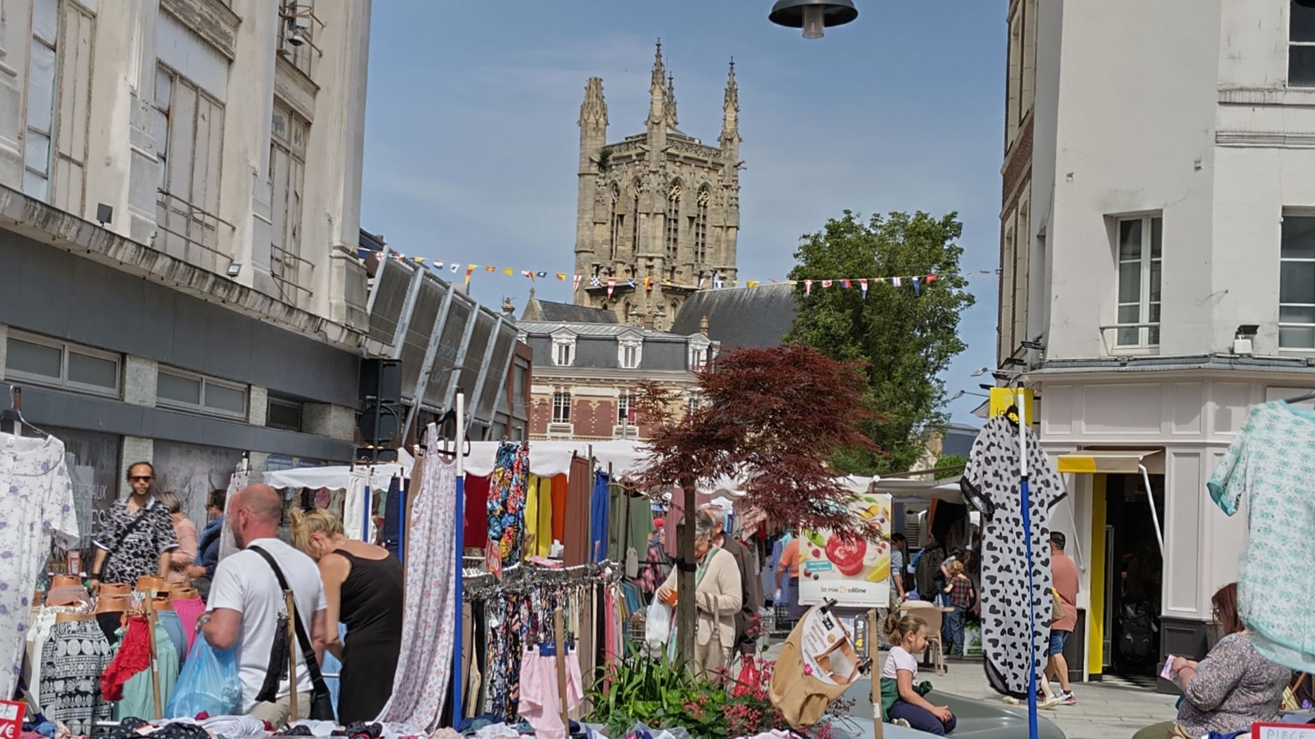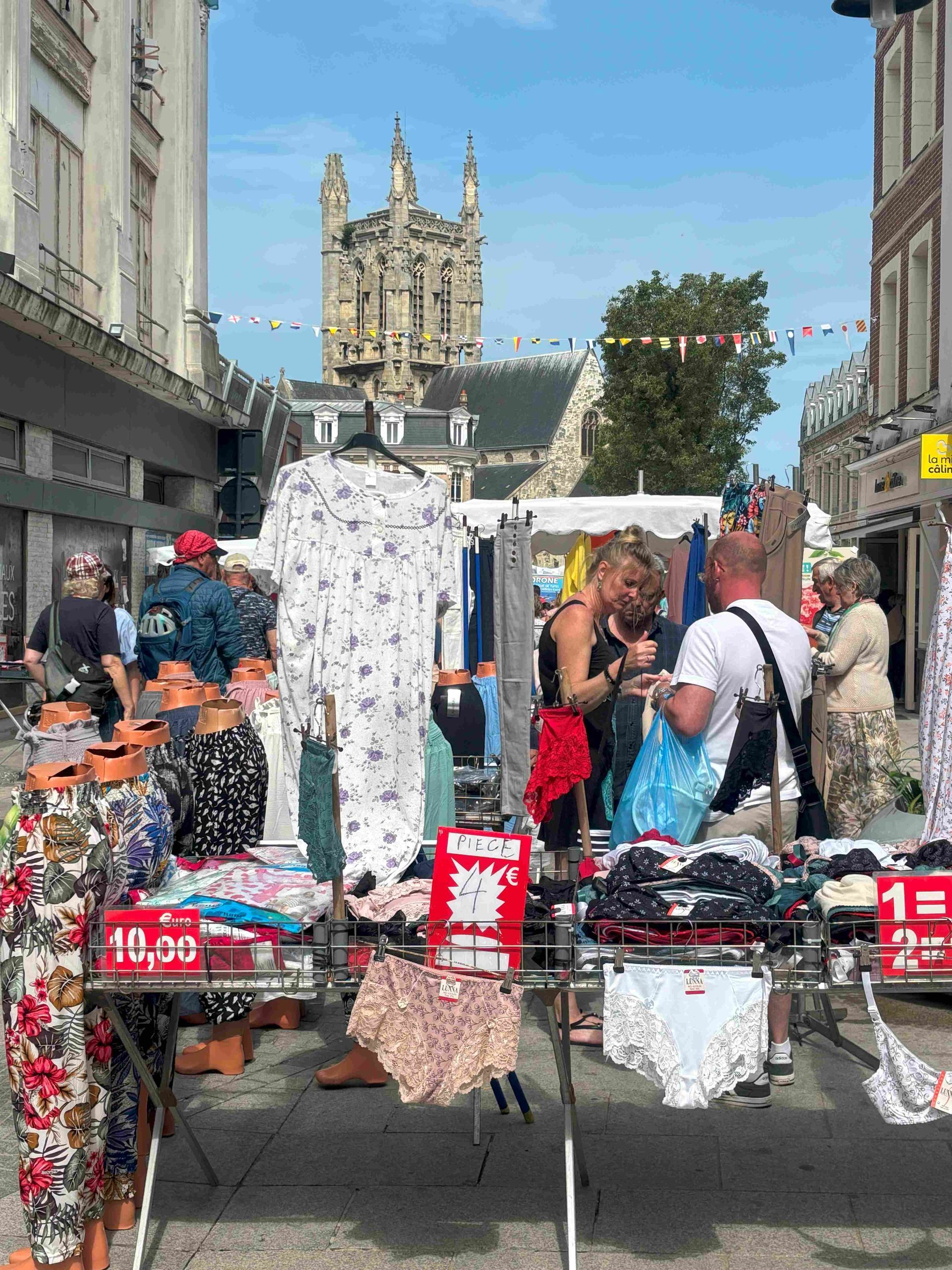 Am Samstag ist Markt in Fécamp. Darum müssen wir unbedingt nochmals hin. Heute ist es sonnig und schön. Mit dem Bus haben wir nur eine Viertelstunde und steigen zum Place De Gaulle hinauf. Die Fussgängerzone ist voll von Ständen in buntem Gemisch, Kleider, Käse, Taschen, Gemüse, Würste. Daneben gibt es eine Runde Gemüse, Früchte, Esswaren. Wir kaufen dies und das und setzen uns dann an die Sonne vor dem Salon de Thé für einen Apero.