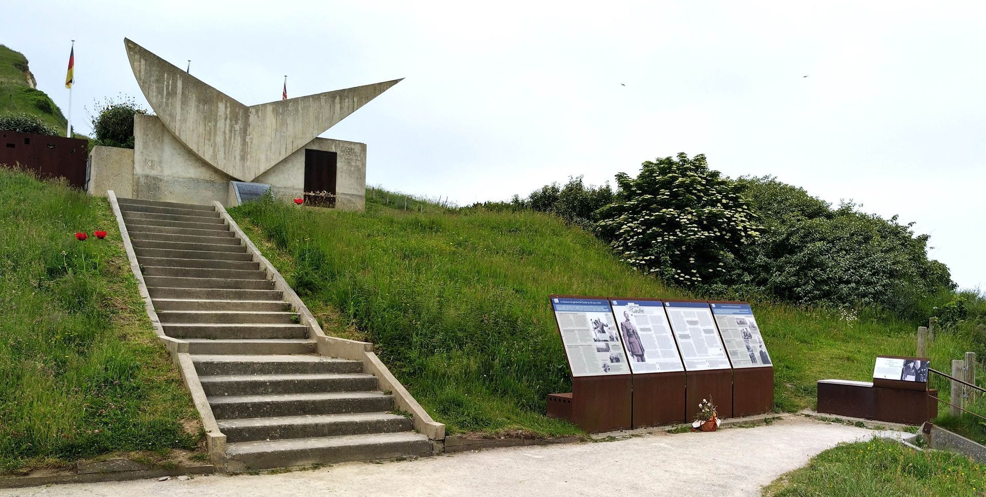 Eindrücklich ist der Stein von Mauthausen. André Harvaux (1927-2991) gehörte der Résistance an und wurde im Januar 1944 nach Buchenwald und später Mauthausen ins KZ gebracht. Er initiierte später das Memorial und brachte einen von den Steinen, die in Mauthausen die steile Treppe hinaufgetragen werden mussten. General De Gaulle liess die Treppe nachempfinden. Ich steige also hinunter ans Meer und als ich wieder hinauf will, hält mich ein sehr beleibter Mann an und meint, ich könne da nicht hinauf, das sei viel zu gefährlich und wenn ich falle, sei er verantwortlich. Wie bitte? Oben gab es keine Verbotstafel. Das sage ich und gnädig gibt er mir die Erlaubnis wieder hinaufzusteigen. Wie kann man nur einen Weg von nur einer Seite her verbieten? Und beim Steigen kommt mir in den Sinn, dass die KZ-Häftlinge in wesentlich schlechterer Verfassung waren ...