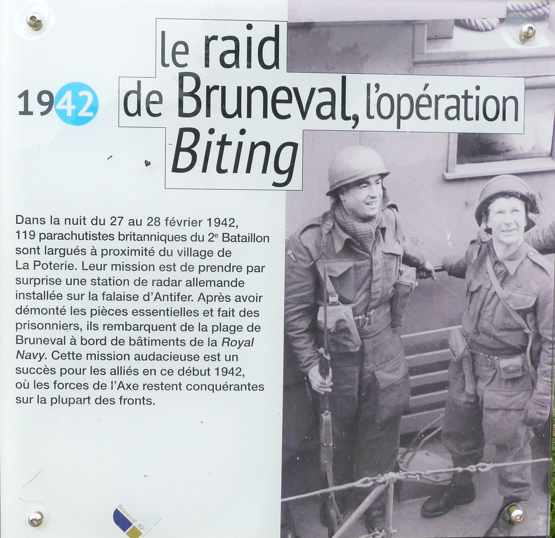 Operation Biting: In der Nacht vom 27./28. Februar 1942 landeten Fallschirmjäger und flache Landungsboote mit Soldaten, die die Radarstation der Deutschen stürmten und die Elektronik stahlen. Diese gab wichtige Einblicke in die Radartechnik der Nazis und war hilfreich bei der Invasion 1944. Leider war die Kommunikation unter den Briten unterbrochen, sodass es einige Todesopfer gab. Die anderen konnten sich auf die Boote retten.
