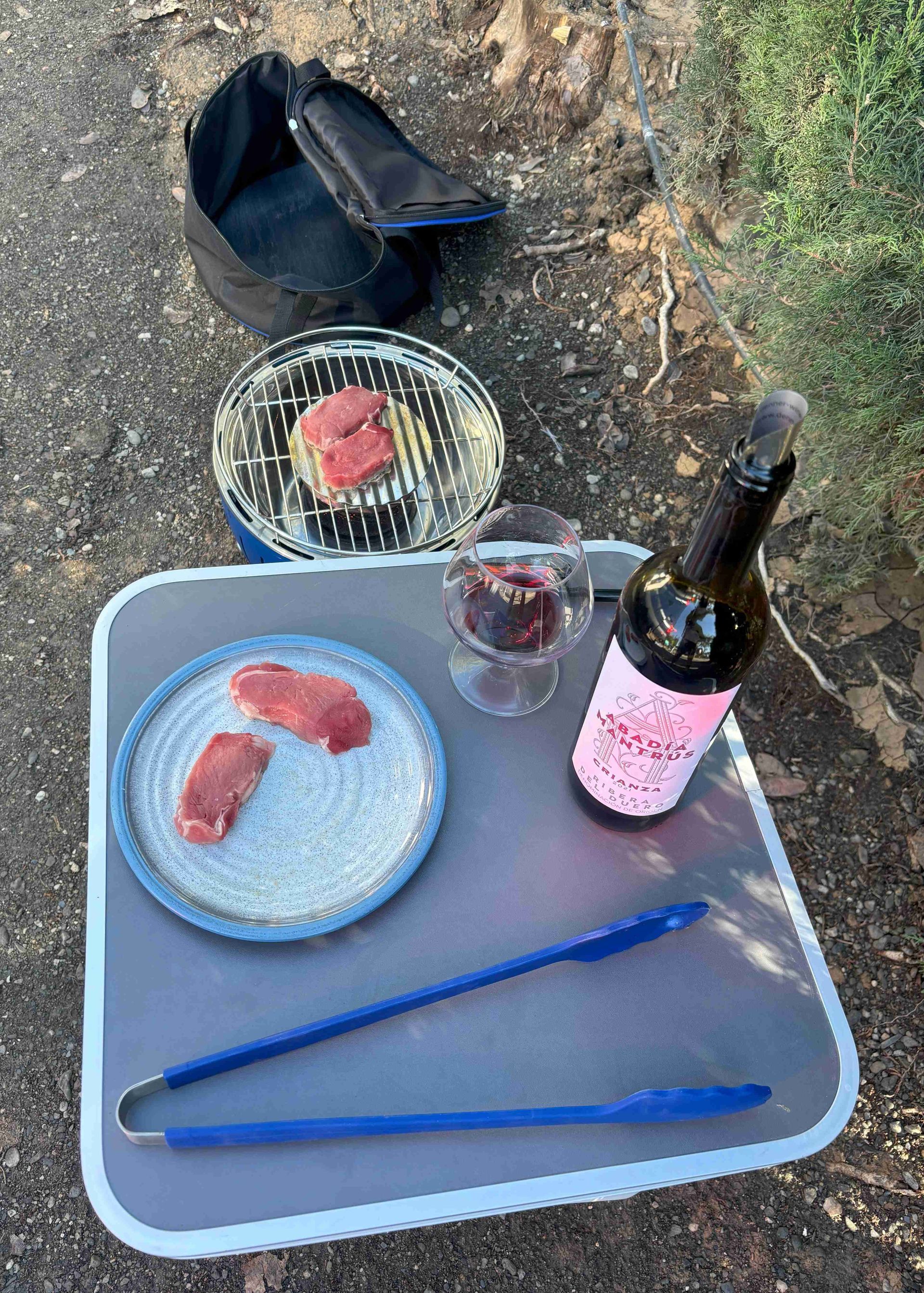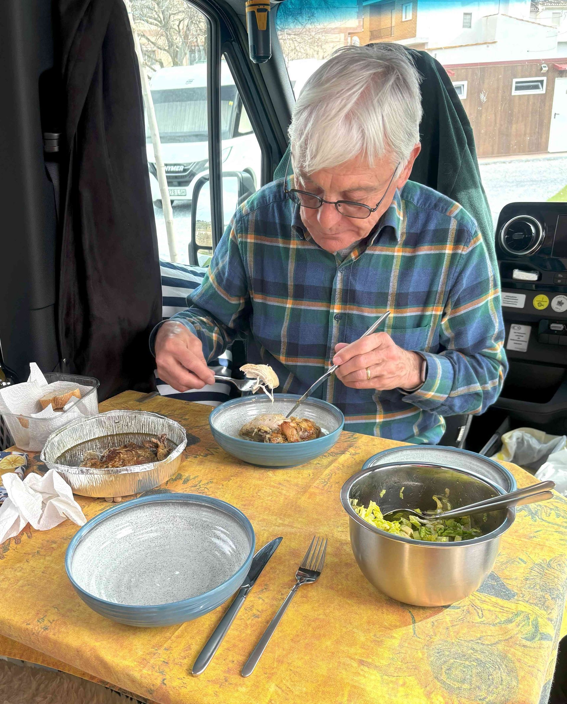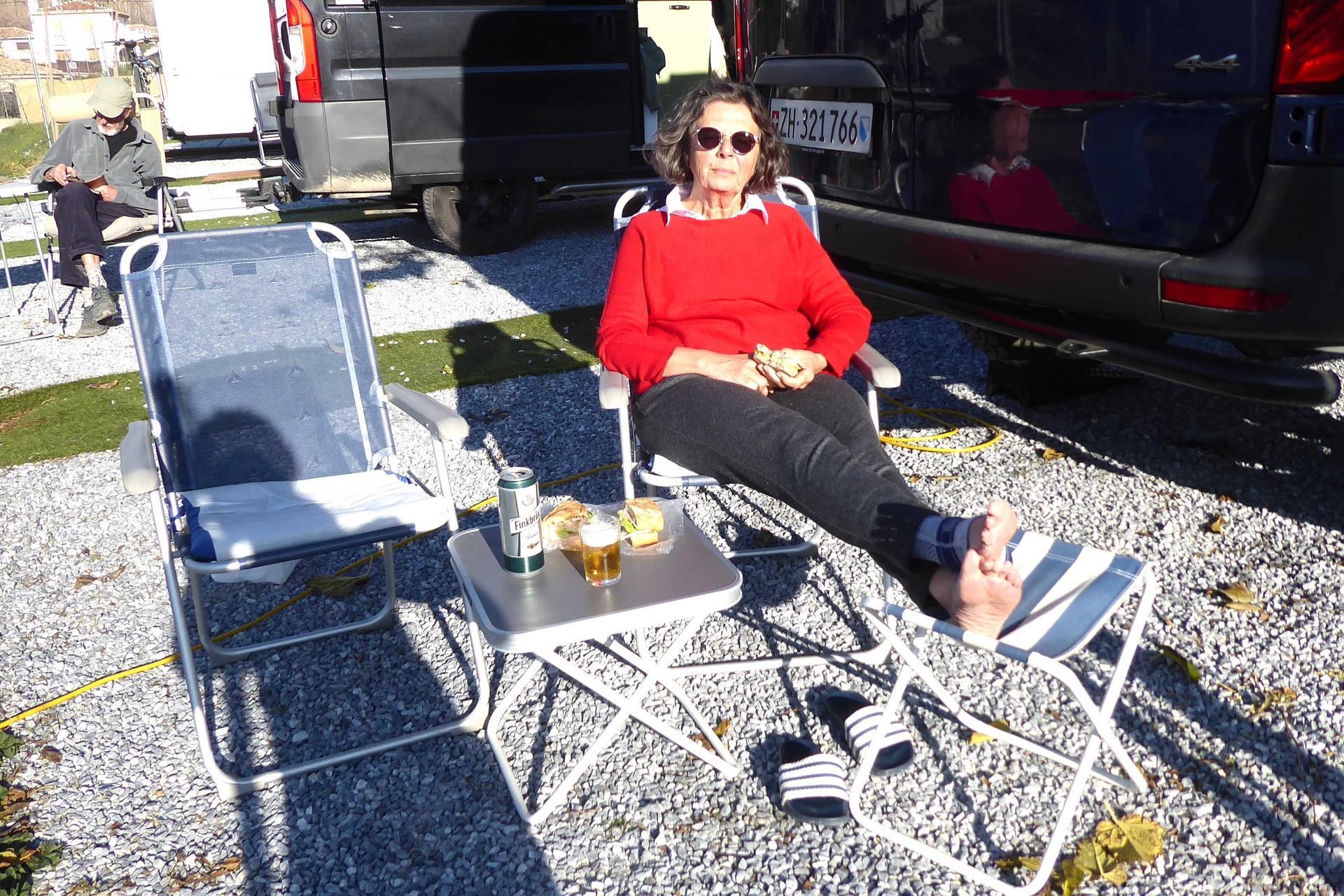 Auf der Suche nach Brot spazieren wir ins Dorf und kommen an einem kleinen Markt vorbei. Da gibt es sooo feine Orangen und Mandarinen. Sonntags bäckt niemand, aber in einer Bar erhalten wir ein Baguette frisch von gestern geschenkt. Der Duft von Grillgüggeli lockt uns an und ab 13 Uhr ist das bestellte fertig. Wir lesen und schreiben Reisebericht.