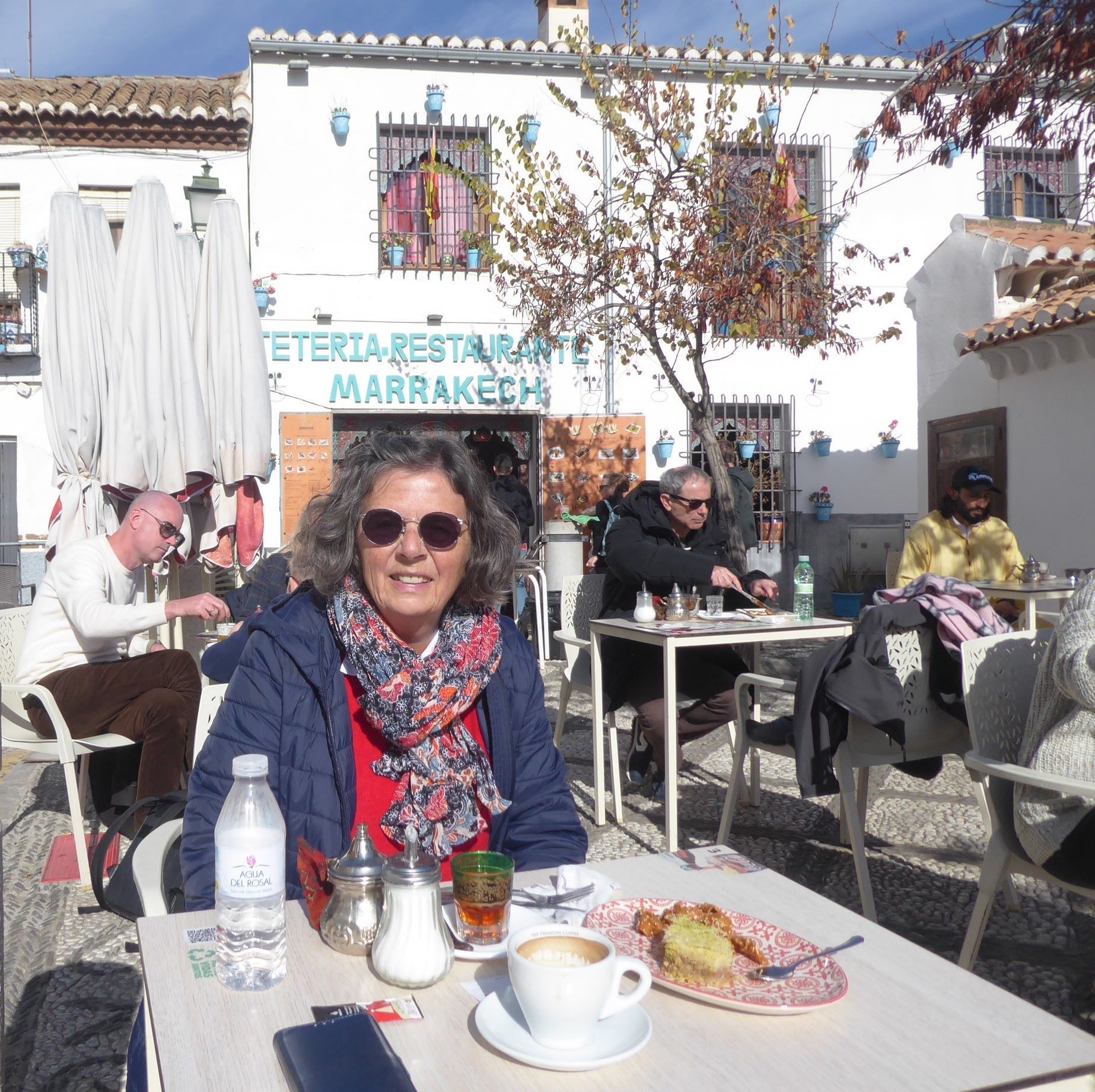 Wir laufen nahe bei einem Busch durch, ein Mann kommt uns entgegen und läuft an uns vorbei. Plötzlich etwas Nasses am Kopf und Hans ist ganz verspritzt mit einer braunen Flüssigkeit, die schon aussieht wie Vogelschiss. Der Mann meint, es sei ein Vogel und er wisse wo es Wasser gibt. Er führt uns in einen kleinen Hausgang, gibt uns Wasser und Papiertaschentücher und hilft uns putzen. Hans soll seine Jacke abziehen um sie zu putzen. Auch ich habe die Sauce am Mantel und in den Haaren. Dann verschwindet er…. wir putzen draussen weiter und gehen dann in ein marokkanisches Kaffee um uns zu erholen.