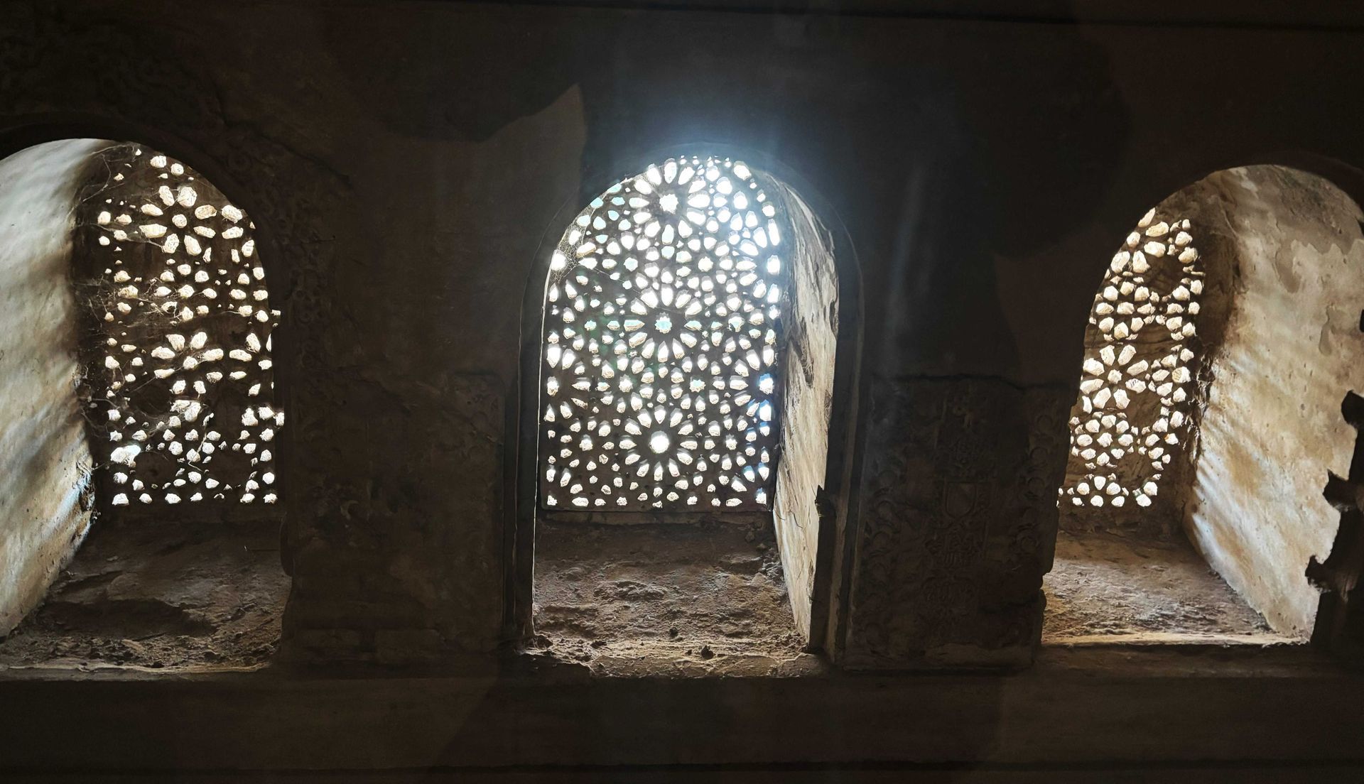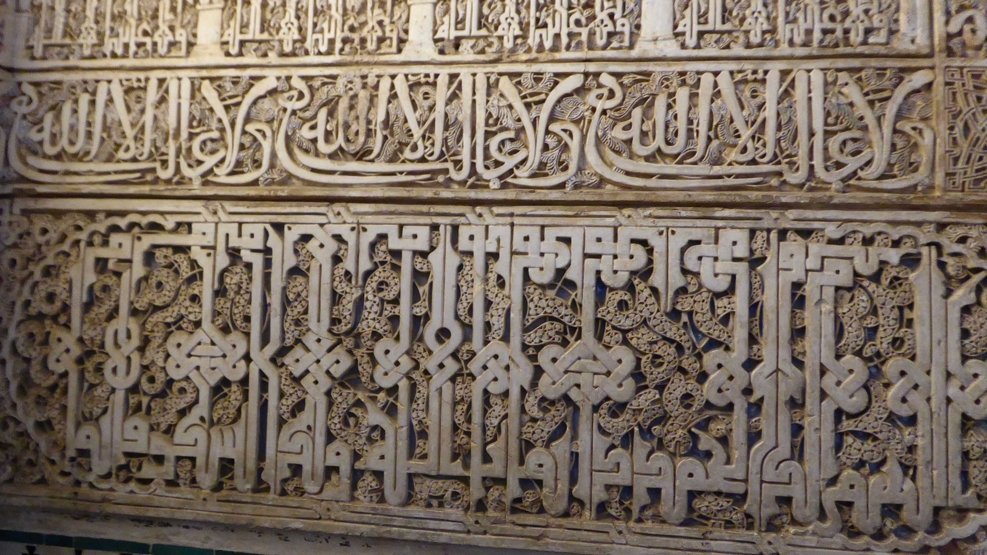 Wir fügen uns in den Menschenstrom ein und tauchen in eine neue, künstlerische und fantastische Welt ein. Muslime stellen keine Menschen und Tiere dar. Dafür haben sie einen riesigen Ornamentenreichtum auf Fliesen, in Holz und aus Sandstein gehauen. Die Paläste waren auch im Zentrum der Macht der Kalifen und darum auch sehr reich verziert. Dies ist an den Wänden, Decken und Säulen sichtbar. Es ist ein Spiel mit Licht und Wasser, Brunnen gehen mitten durch Innenhöfe und sprudeln in Räumen. Oft müssen wir lange warten oder rasch neue Winkel suchen um möglichst wenig unbekannte Leute auf den Föteli zu haben. Es gelingt selten. Hier ein paar Eindrücke: