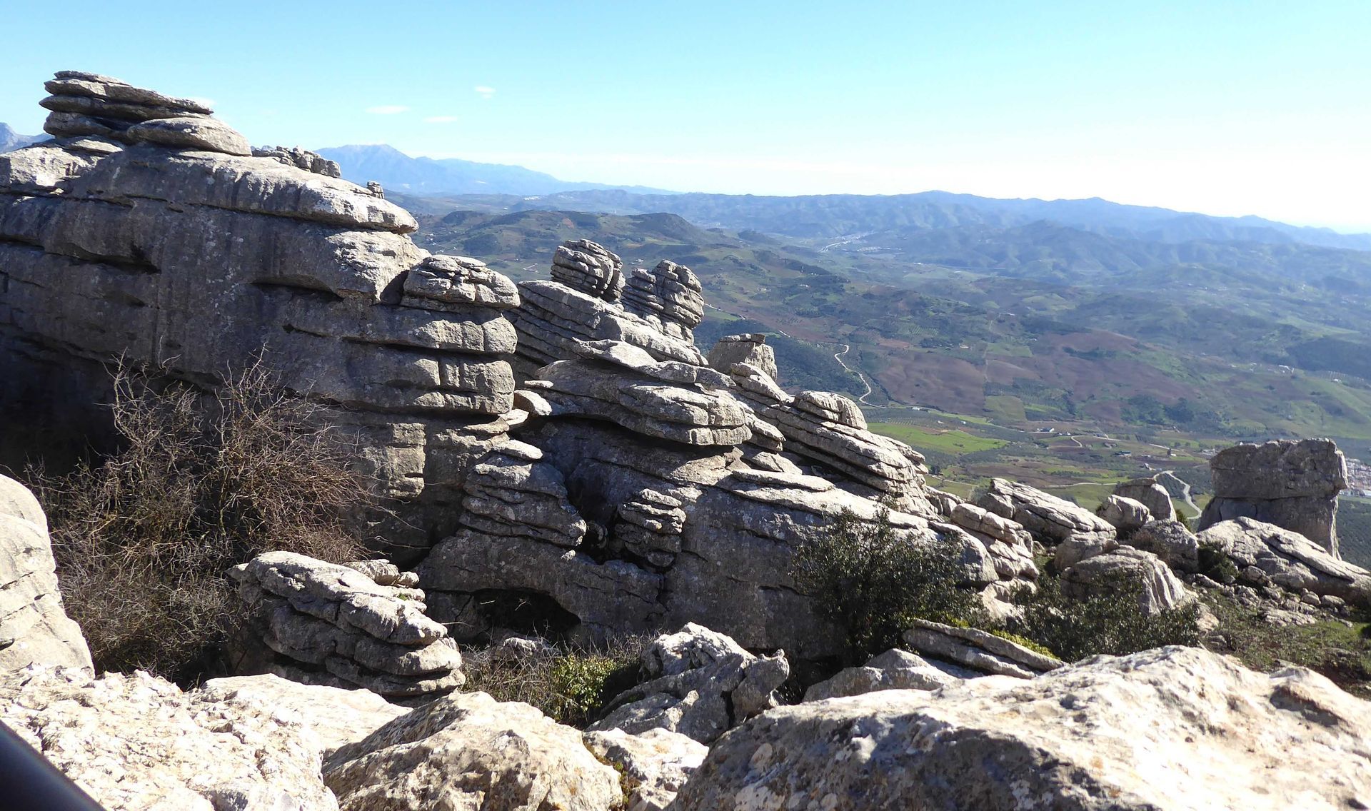Also wir haben echt genug von Stadt und Trubel. Hans hat einen Naturpark gefunden, wo wir einen Spaziergang machen könnten. Wir fahren über Land und kurven zum El Torcal. Speziell sind die Gesteinsformen wie Steinplatten aufgeschichtet. Da oben auf 1200 müM bläst ein eisiger Wind und der rotbraune Boden ist vom Regen gestern ganz matschig und lehmig. Also verzichten wir auf die Wanderung.