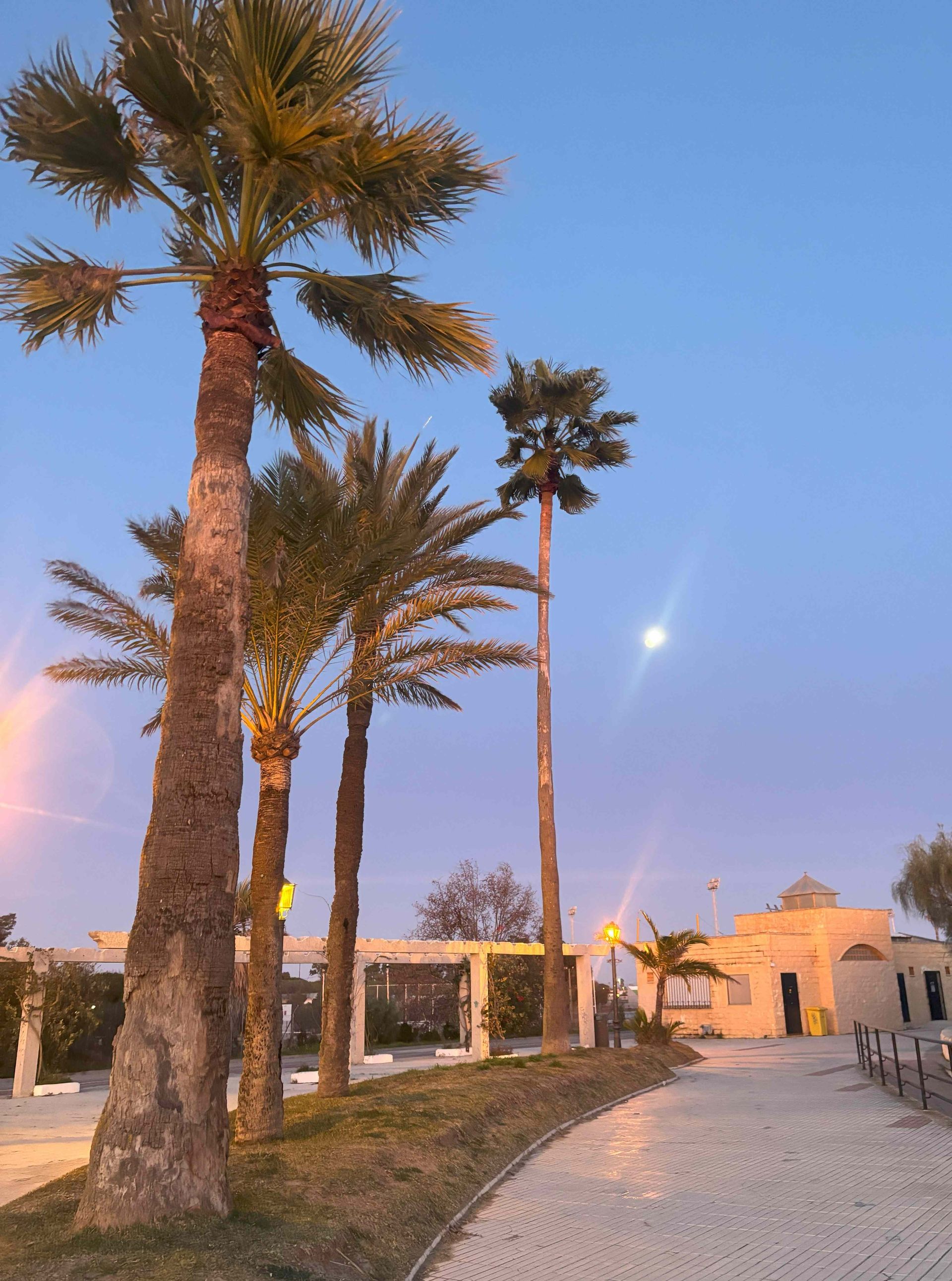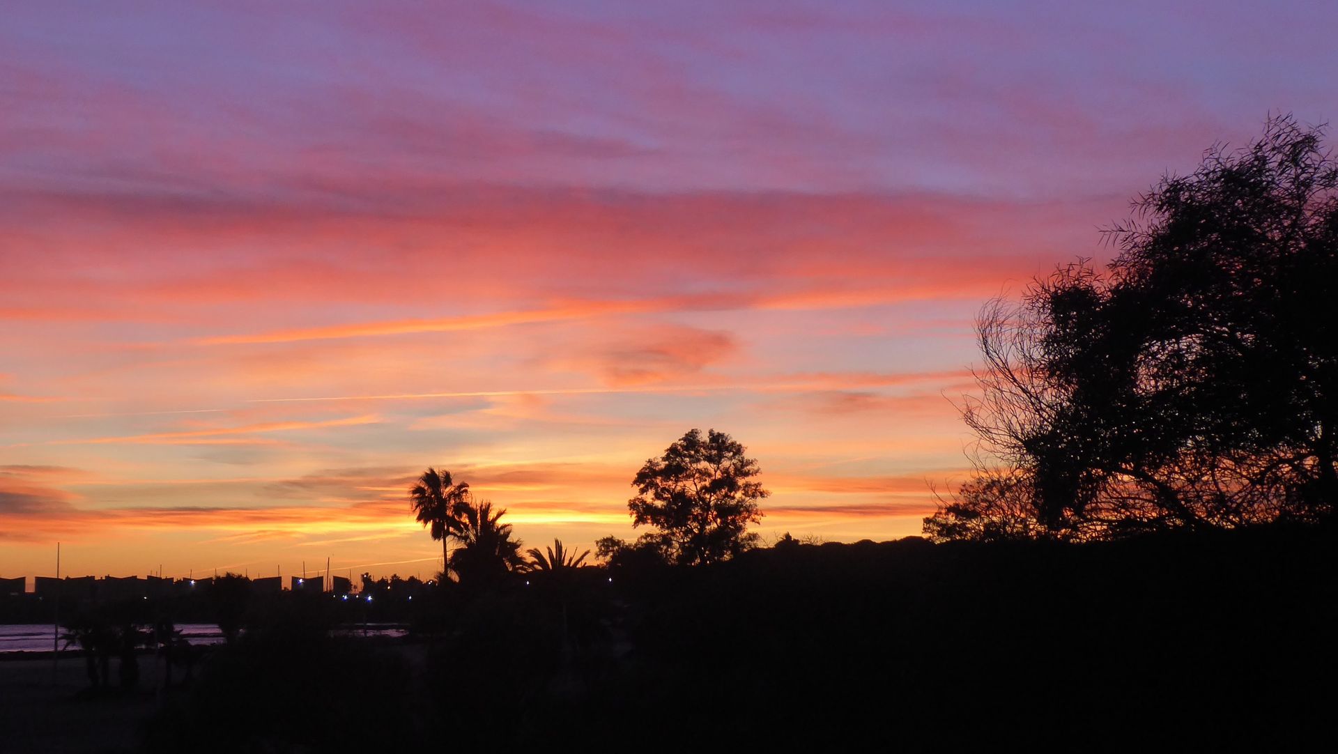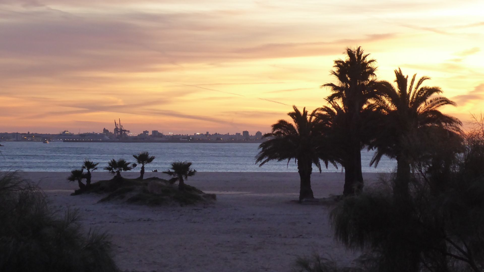 Nach Kaffee und Kuchen tuckern wir in der schönen Abendstimmung zurück nach El Puerto. Der Weg zum Camping zurück ist eine halbe Stunde Fussmarsch, der immer leuchtender werdende Abendhimmel ist die Belohnung.