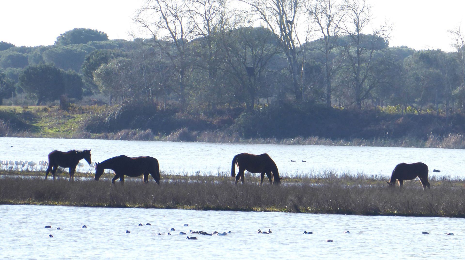 Wir hoffen, die Flamingos im schönen Morgenlicht zu sehen. Stattdessen entdecken wir wilde Pferde.