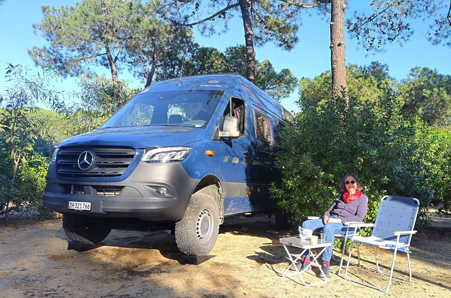 Wir fahren weiter dem Naturpark Donana entlang nach Huelva und weiter über die Grenze nach Portugal. In Olhao finden wir einen Platz im Wald. Hans schafft es mit den Keilen den Bänz eben hinzustellen. Wir wollen kochen und kurz bevor wir die Spaghetti ins Wasser geben wollen, ist das Gas aufgebraucht.