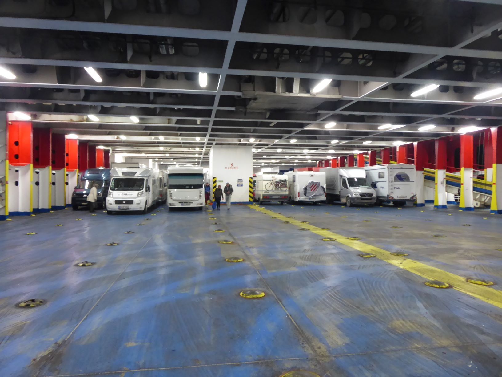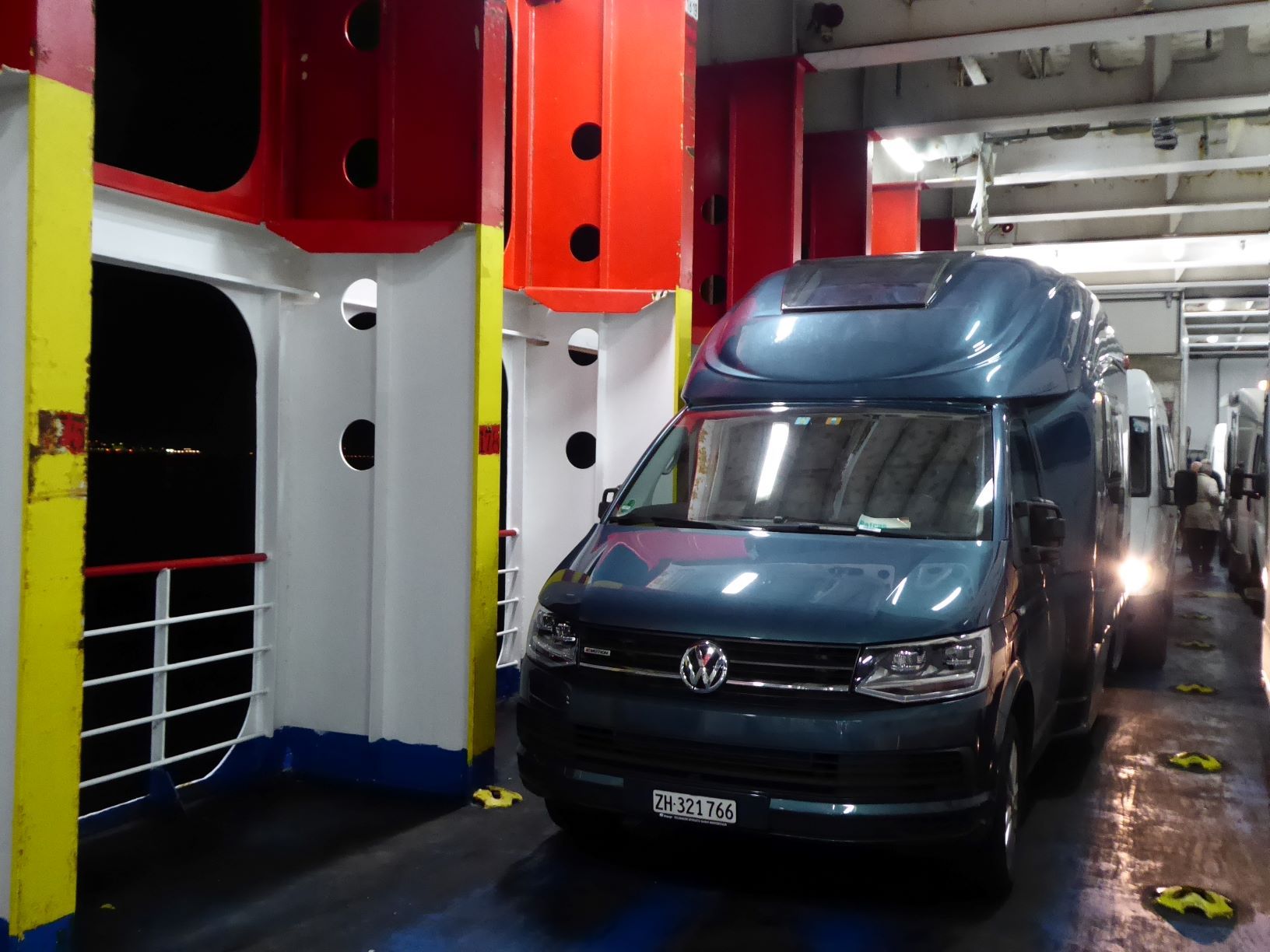 A trip like this from Venice to Patras requires a lot of patience and a lot of waiting: we could drive through the barrier from 2:00 a.m. So we sleep until 1 a.m. but there's no sign of the many campers anymore. Have we done something wrong? We hurry up andSo eine Fahrt von Venedig nach Patras braucht viel Geduld und viel Wartezeit: Ab 2:00 Uhr könnten wir durch die Schranke fahren. Wir schlafen also bis um 1 Uhr aber da ist von den vielen Campern gar nichts mehr zu sehen. Haben wir etwas falsch gemacht? Wir beeilen uns und stehen dann ganze zwei Stunden in der Kolonne zum einschiffen ... Es gab noch eine kurze Morgenruhe in der Dunkelkammer (Innenkabine).