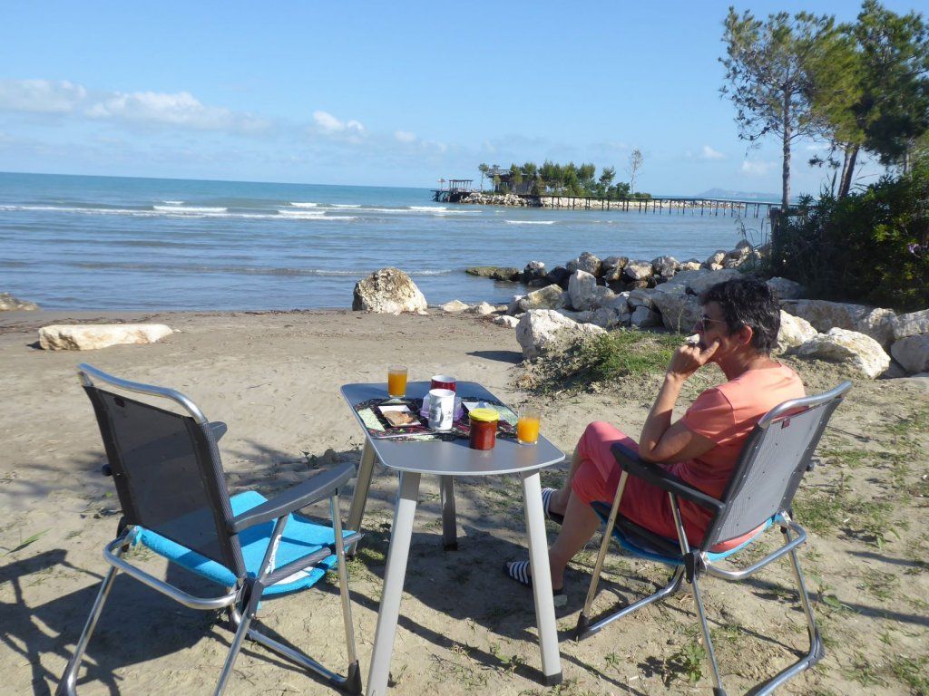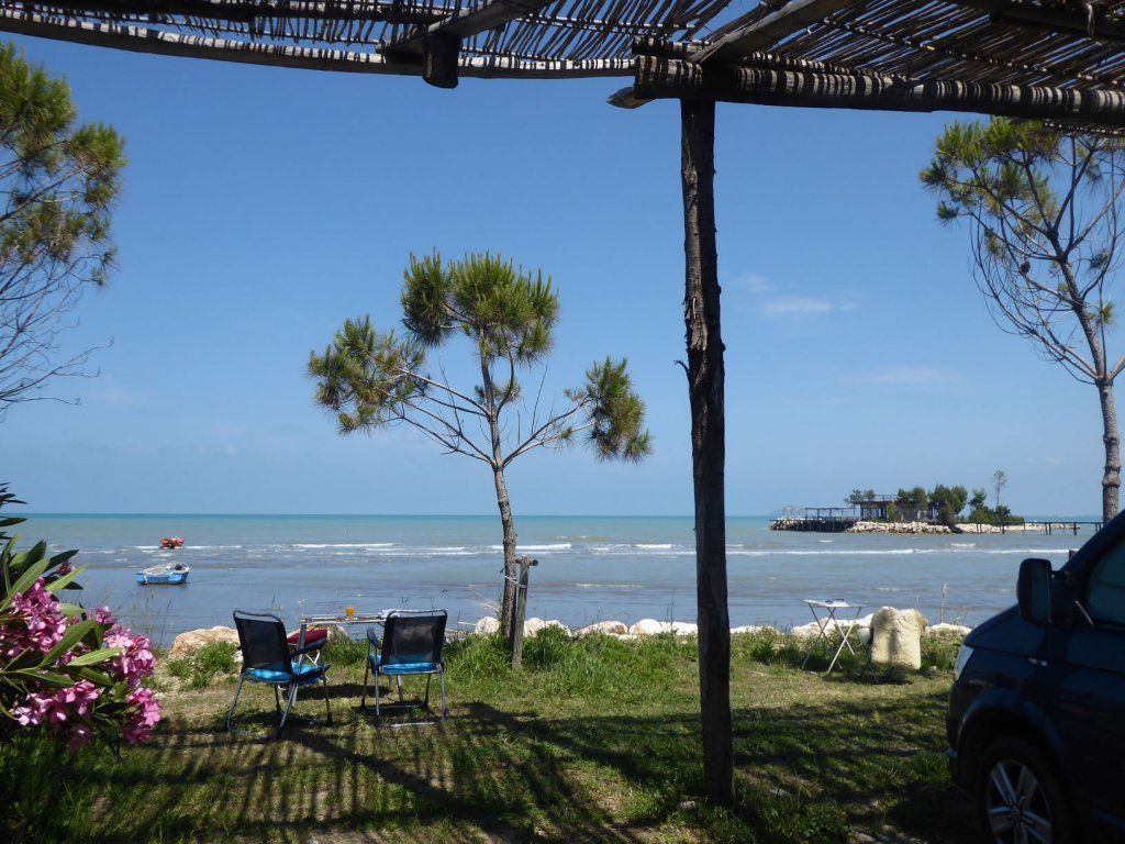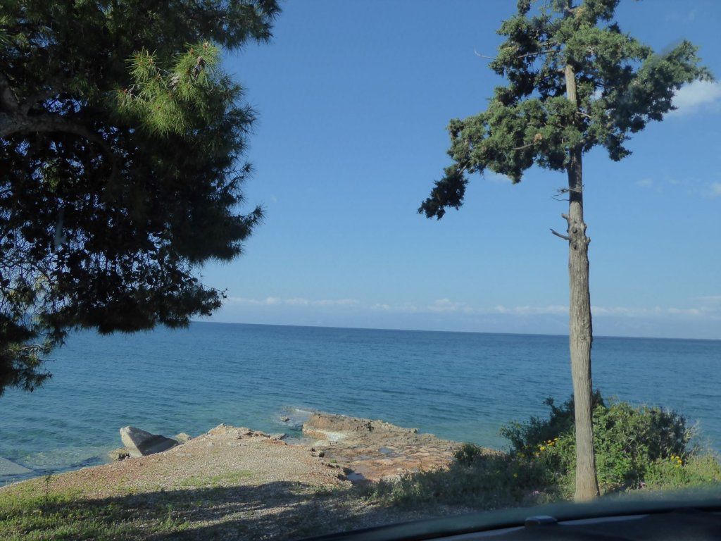 Am nächsten Tag fahren wir nach Syr i Kalter, auch als Blue Eye bekannt. Da fliesst glasklares Wasser aus dem Karst in sagenhaft blauer Farbe. Wir suchen einen Platz am Meer und finden den Strand von Lukove. Wir sind ganz deutlich in der Vorsaison, er ist nämlich noch ganz vermüllt und die Bars sind noch zu und sehen armselig und verjäst aus. Daneben finden wir aber eine tolle Terrasse mit schönem Blick nach Korfu. Schon im Dunkeln wird an unser Wigwam geklopft und ein ziemlich betrunkener Mann, der sich als Besitzer des Landes ausgibt, verlangt seinen Tribut von 7 Euro. Das geben wir und haben eine ruhige Nacht. Am andern Morgen kommt auch noch der wirkliche Besitzer und möchte Geld, der bekommt nichts mehr, wir haben ja schon bezahlt.