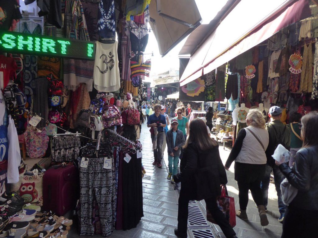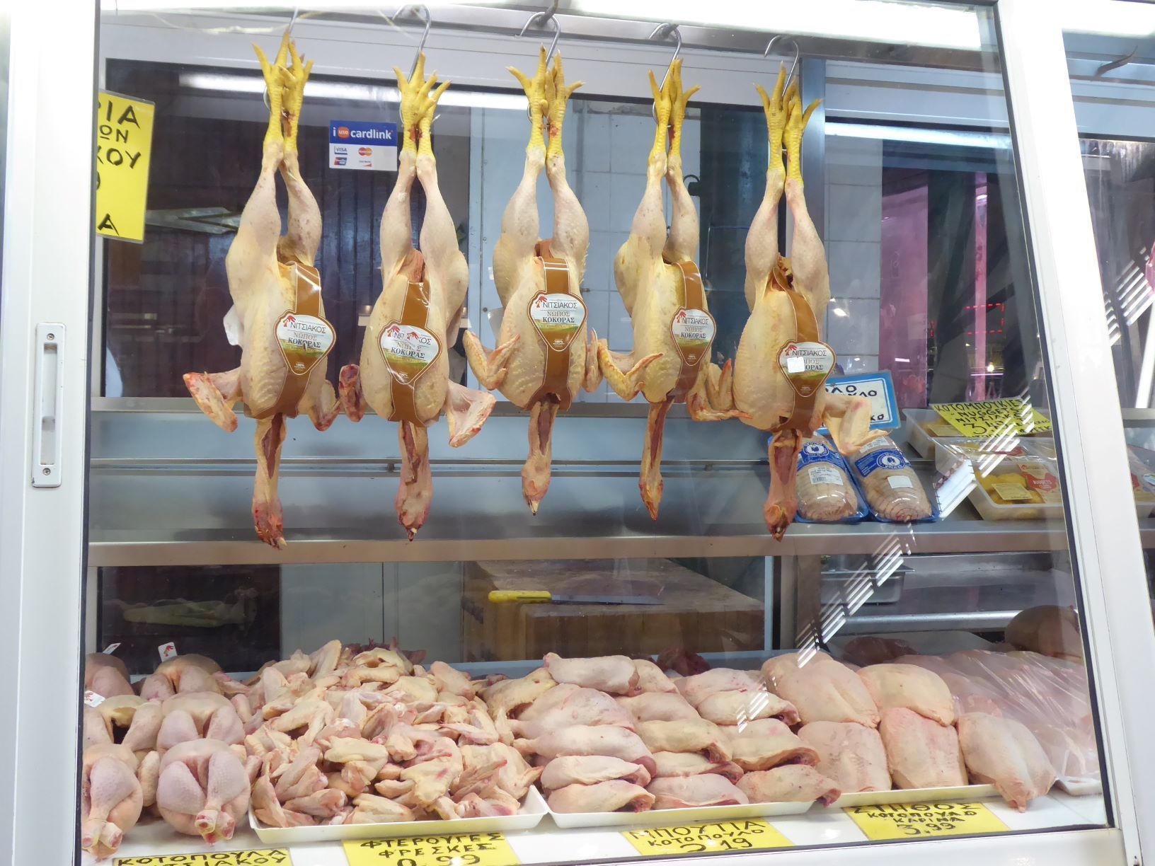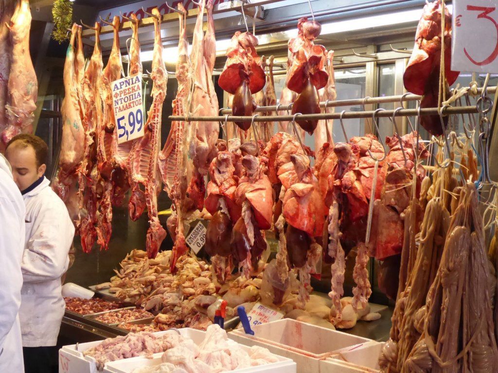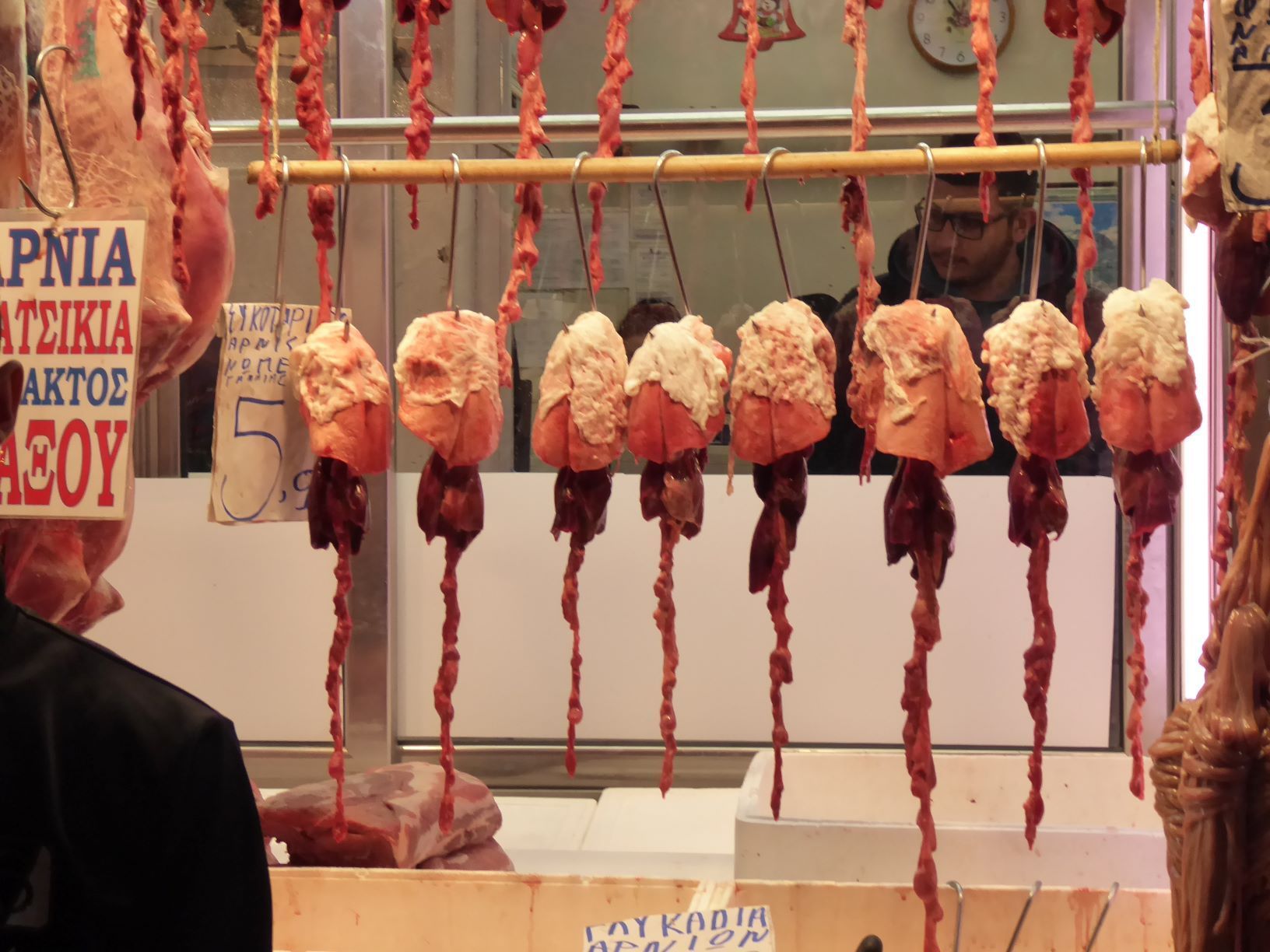 Am Dienstag standen wir sehr früh auf, fuhren mit dem Camper nach Galathas, mit einem kleinen Schiffchen nach Poros und von dort mit dem Drahtflügelboot nach Piräus und mit der U-Bahn direkt in den Moloch Athen. Zurst gehen wir auf den Markt. Der ist ganz auf Ostern eingestellt. Es gibt ganze Schafe, Schafsköpfe, Lungen und Lebern hagen herum und so Gebilde aus den Därmen mit Fleisch innerhalb. Während ich dies schreibe, bringt mir eine Frau zum probieren, nachdem das Gebilde 5 Stunden auf dem Grill gedreht wurde. Es schmeckt fein aber ich würde es trotzdem nie bestellen.