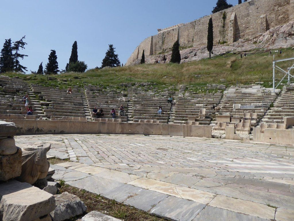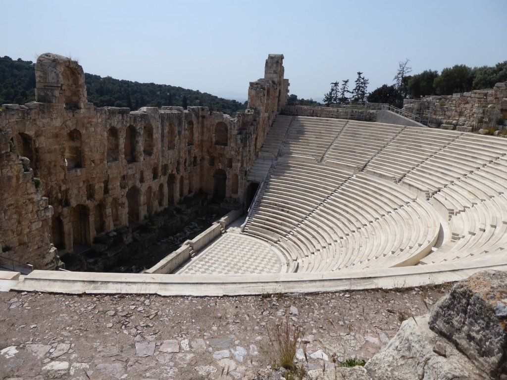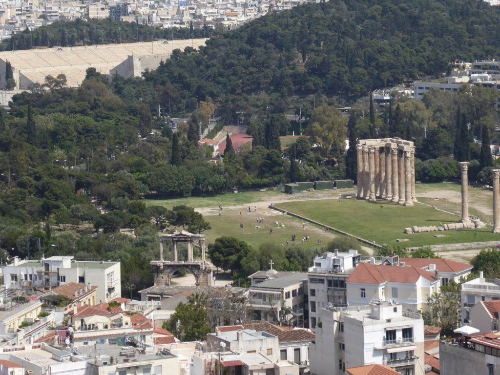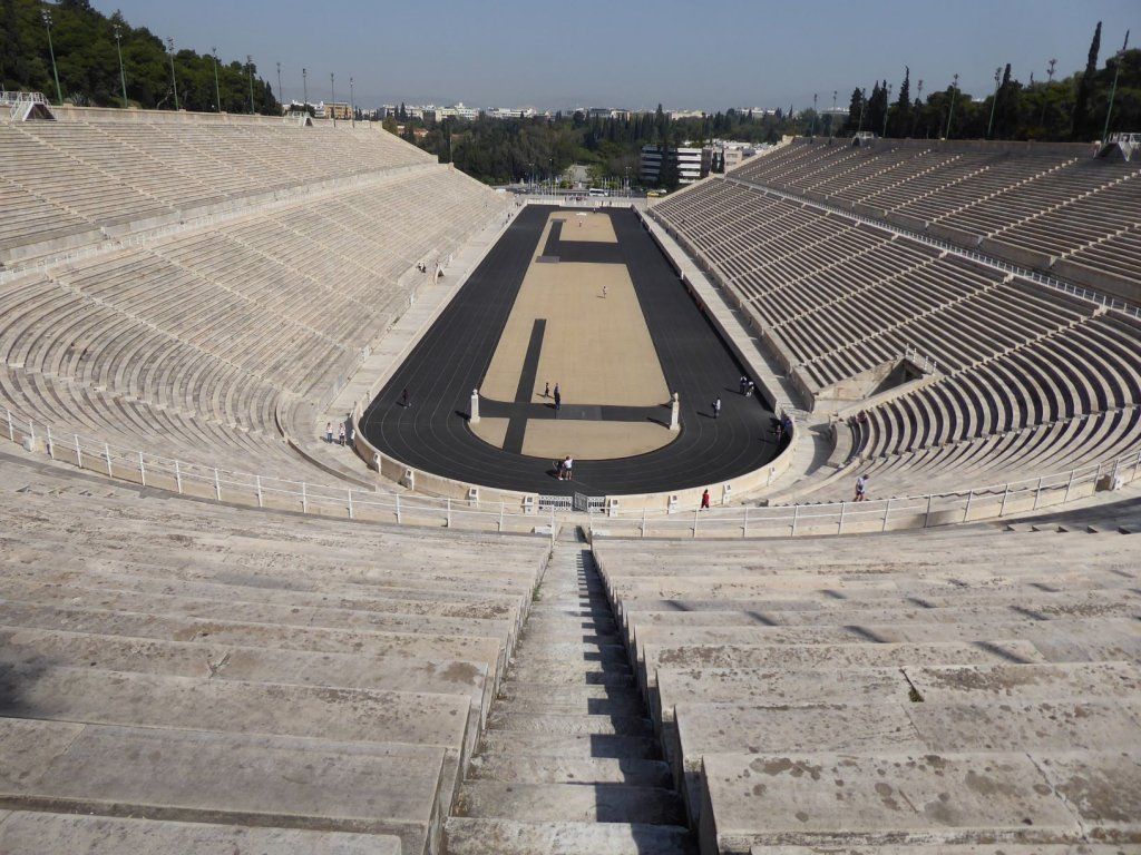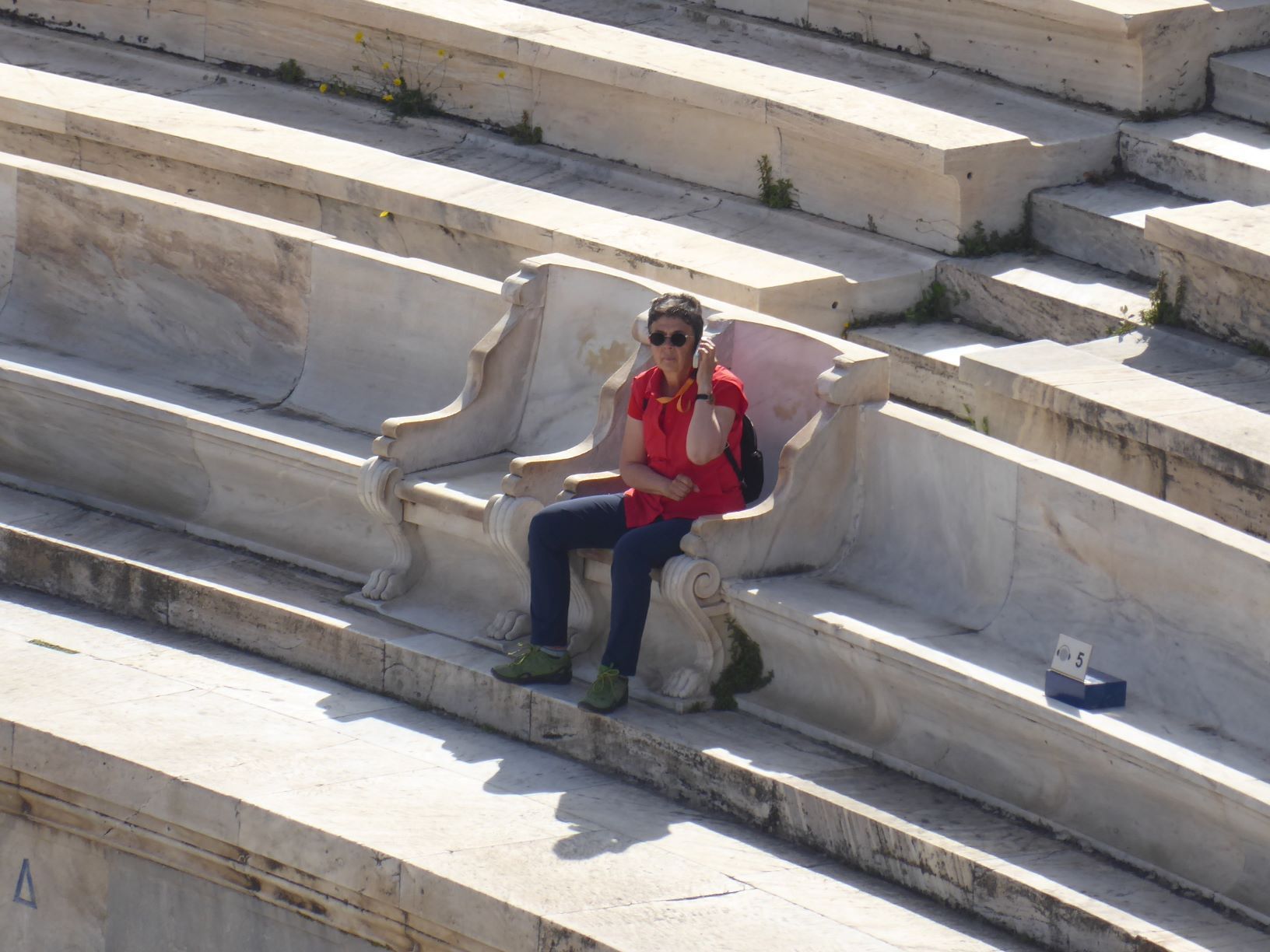 Am Karfreitag, Orthodox ist eine Woche später, stehen wir wieder früh auf um endlich die Akropolis zu erklimmen. Es ist wunderbares Wetter und verspricht warm zu werden. Um 9.30 Uhr ist es dort verdächtig ruhig und tatsächlich finden wir auf einem windigen Zettel geschrieben, dass am Karfreitag von 12-17 Uhr offen ist. So ein Frust! Auch den Zeustempel können wir nur durchs Gitter fotografieren. Aber die Sportler haben offen. Wir besuchen das Olympiastadion, das über 2000 Jahr alt ist und 1896 aus Marmor wieder neu aufgebaut wurde. Es fasst 68000 Leute. Es gibt einen Audioguide und das ist eine echt spannende Führung.