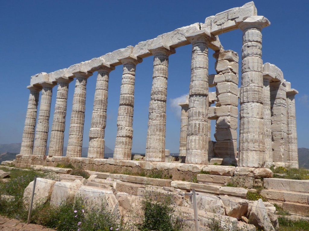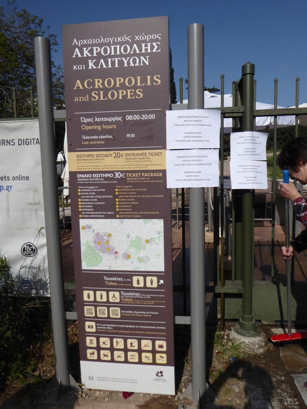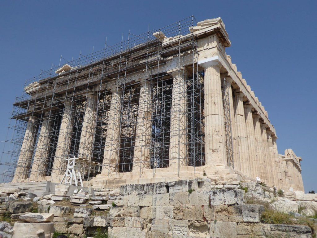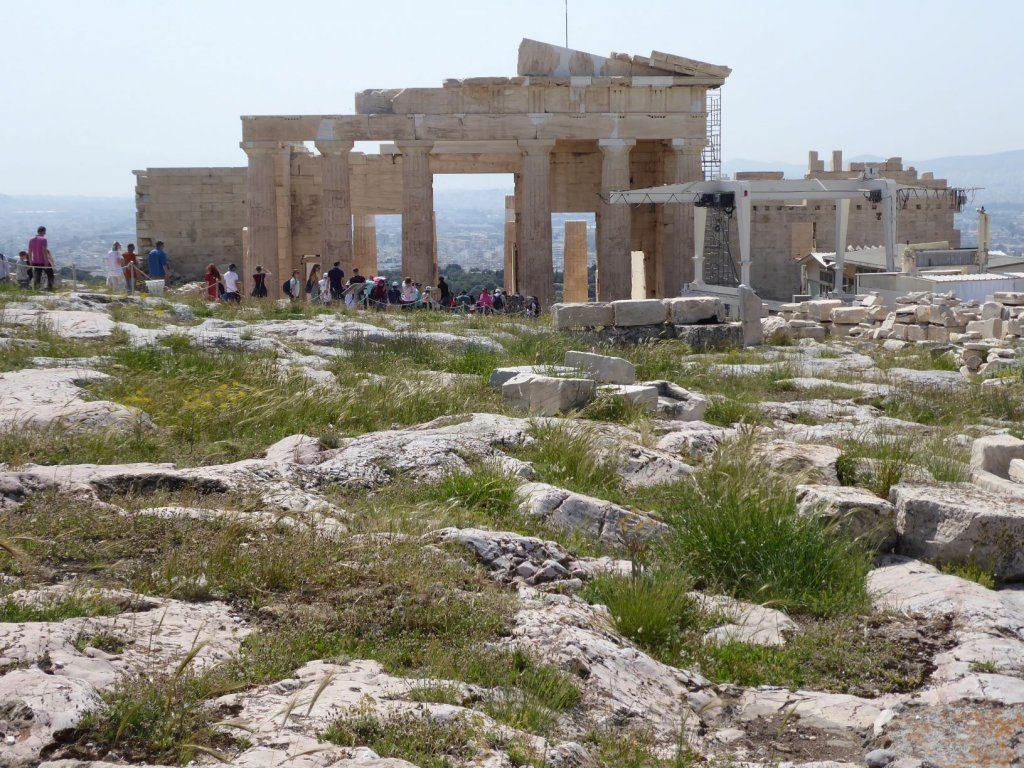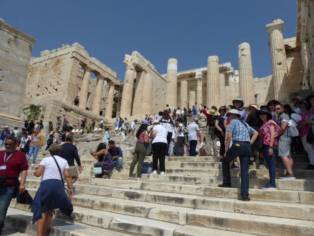 Als wir wieder zur Akropolis kommen ist die Warteschlange wieder 50m. Neuer Frust! Soll es wohl nicht sein? Wir machen eine Runde durch die Plaka, Touristenort mit ganz viel Läden und Tavernen. In der Nähe der Kirchen gibt es einen Sog. Die Leute gehen hinein und zünden Kerzen an. Das tun wir auch für unsere Mütter. Um 15.30 Uhr sind wir wieder bei den Kassen und siehe da, wir schaffen den Eintritt in 10 Minuten. Endlich. Vor dem Eingang, den Propyläen stossen wir auf eine Menge Leute und Aufseher, die schrill pfeifen, wenn jemand einen Fehltritt macht oder eine Säule berührt. Vom Odium eines heiligen Ortes keine Spur. Der Parthenon war ein Heiligtum von Athene, aber auch eine Marienkirche, ein Herrschaftssitz, ein Waffenlager und eine Moschee. Jetzt regieren Fotoapparate und Selfies.