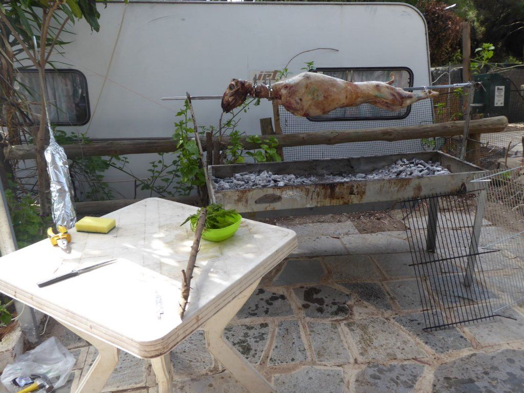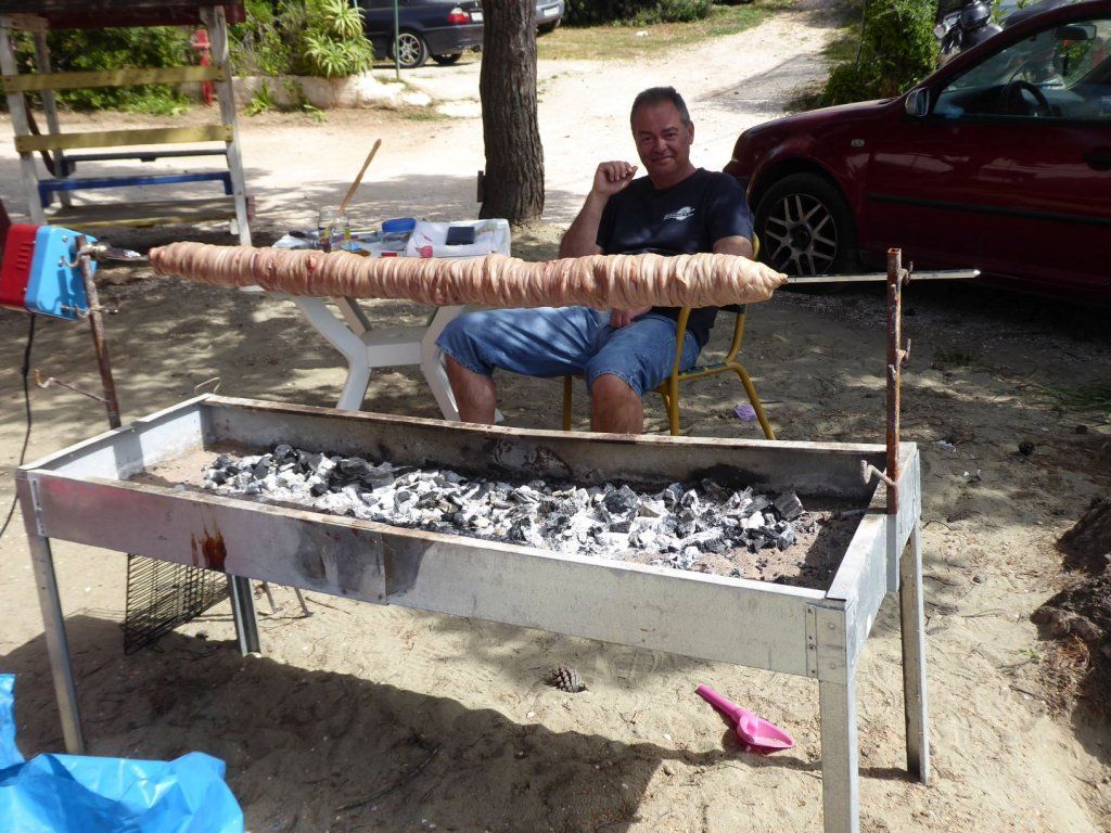 Wir suchen einen ruhigen Platz für Tagebuch und Blog und finden den Camping Bacchus am Cap Suonion. Dort ist das Osterfest in Vorbereitung. Am Ostermorgen werden um 10 Uhr die Grille entzündet und später die ganzen Schafe und Darmgebilde aufgespiesst und 4-6 Stunden gedreht, mit Motor. Immer wieder werden sie gestreichelt mit einem Pinsel aus Dill, der in Olivenöl mit Zitrone getaucht wurde. Immer mehr Leute kommen und bringen Essen und Trinken mit, dazu gibt es endlos griechische Musik. Also und als ich diesen Text schreibe, kommt die Frau mit einem Stück Darmgebilde. Drinnen hat es glaube ich Lunge und etwas Leber - ein kulinarisches Abenteuer. Kali Orexi - En Guete.