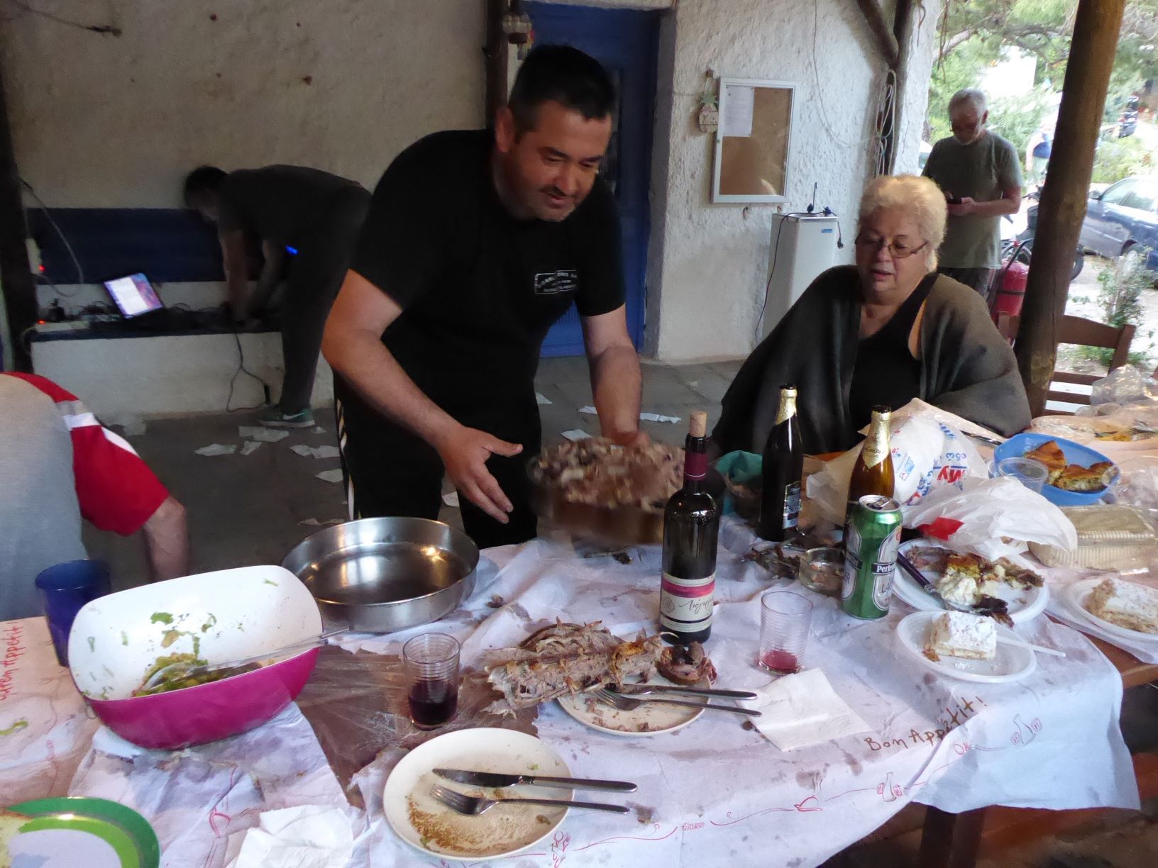 Gegen Abend haben wir eine Flasche Wein genommen und sind mit den Campern aus Freiburg auch ans Fest gegangen. Das Osterlamm war so zart und hat vorzüglich geschmeckt. Fotos vom Fest gibt es keine, Männer haben getanzt und gesungen und wir haben mitgetanzt und waren ganz in der fröhlichen und ausgelassenen Stimmung. Kalo Pascha - schöne Ostern.