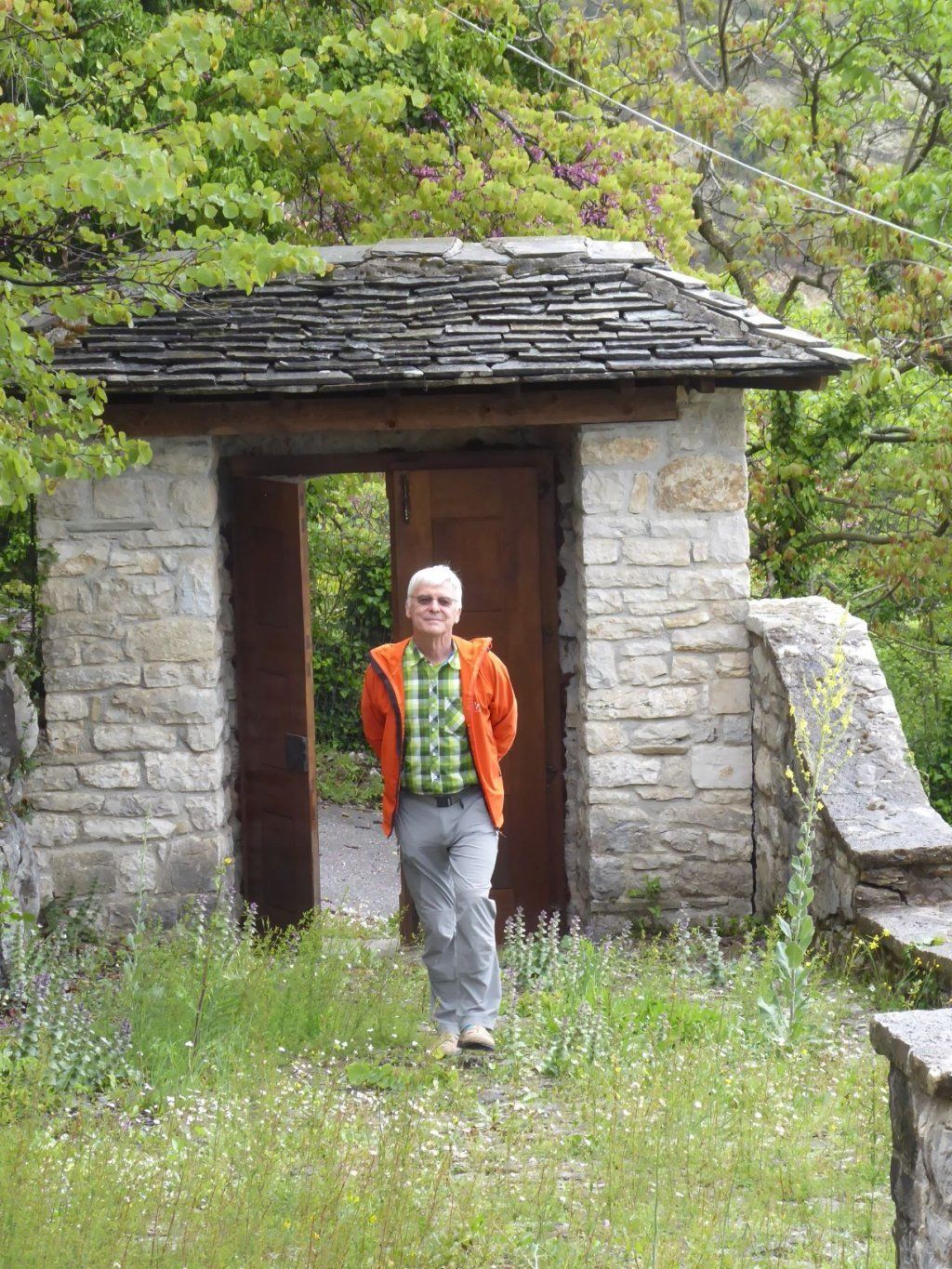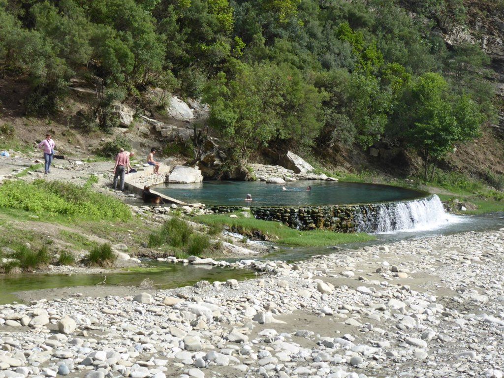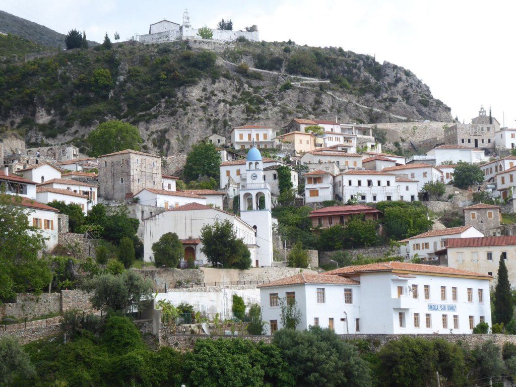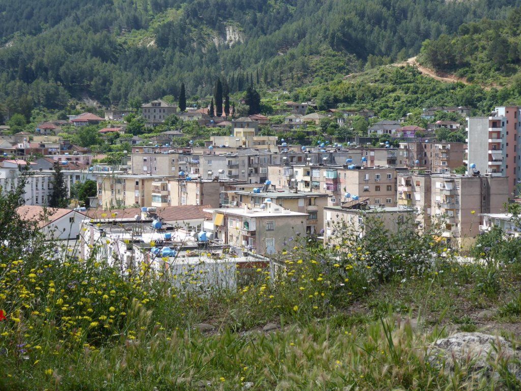 Wir wollen unbedingt nach Gjirokaster. Nach dem Morgenbad in den warmen Quellen von Benje Novosele verabschieden wir uns und fahren nach Permet. Auf der Turisteninformation werden wir gefragt, was sie in Benje Novasele besser machen könnten. Wir schlagen 2 Abfallcontainer vor, aber das sei Aufgabe der Gemeinde. Vermutlich verläuft unser Vorschlag im Sand. Wir steigen auf den Felsen und betrachten den schönen Ort mit den vielen blauen Wasserkanister auf den Dächern.