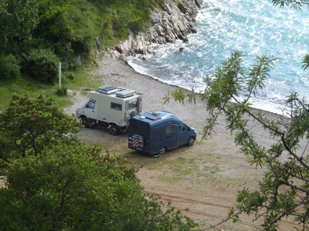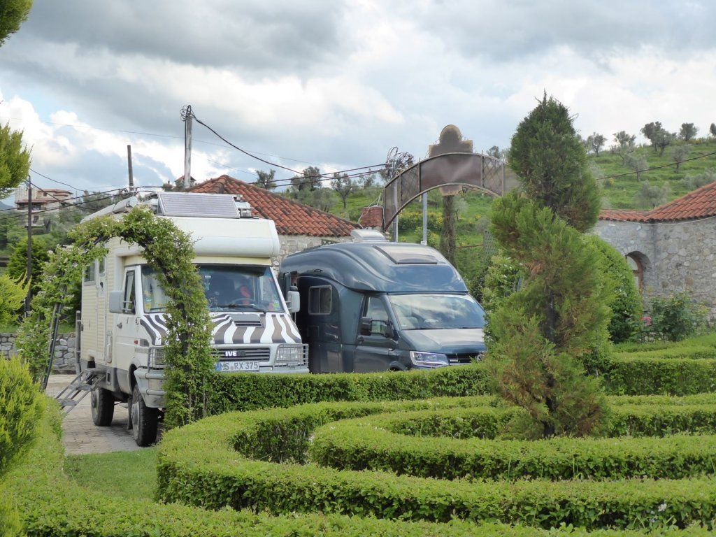 Wir fahren der Riviera von Albanien entlang, das ist eine richtige Bergstrecke mit vielen zauberhaften Dörfern. Es ist kurvenreich und geht auf und ab wie Wilde Maus. Himare ist das heimliche Zentrum der Griechen in Albanien. In seiner Geschichte gehörte es zu Griechenland, dann Albanien. Seit etwa 20 Jahren gibt es wieder eine kleine griechische Schule. Wir werden an Nepal erinnert, dort haben wir auch viele Schulzimmer ohne Fenster gesehen, bei uns undenkbar. Wir fahren über den Llogarapass. Von Süden her sind es 6 lange Serpentinen. Auf der Passhöhe sind wir voll im Nebel. Die Nordseite ist kurvenreich, aber führt wieder in die Sonne am Meer nach Vlore. Dort finden wir einen schönen Campingplatz und geniessen die warme Dusche.