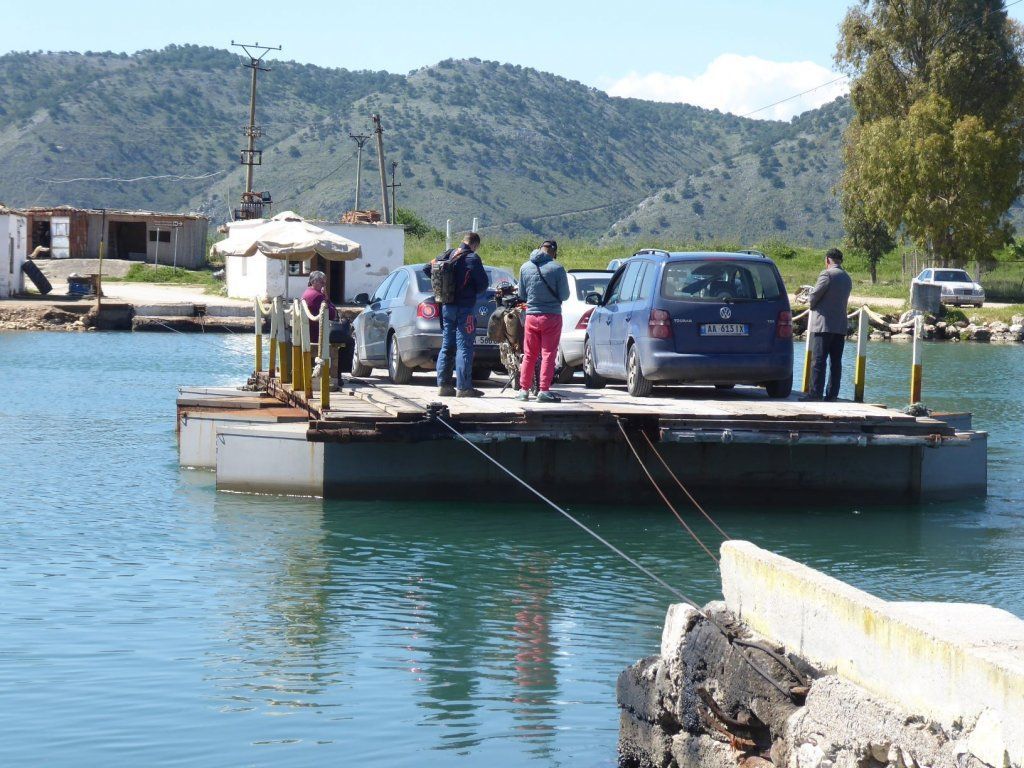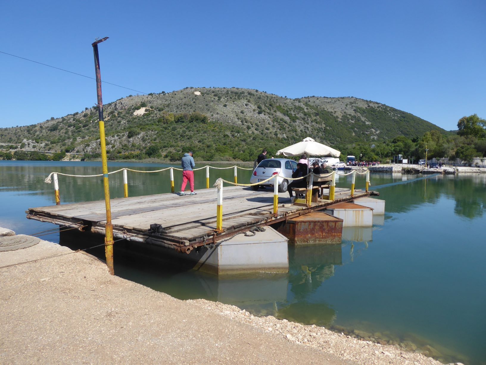Wenn wir nach Butrint wollen, gibt es eine Fähre über den Fluss, "10 Meter für 10 Euro" und 1 Euro für die Foto vom Fährmann und seiner Anlage - ein Erlebnis. Die Plattform der Fähre besteht aus Holz, ca. 5m breit und 10m lang. Sie ist auf vier Pontonbooten gelagert und wird mit Seilen via Umlenkrollen über den etwa 40m breiten Kanal gezogen. Zebra und Wigwam haben gerade Platz darauf.