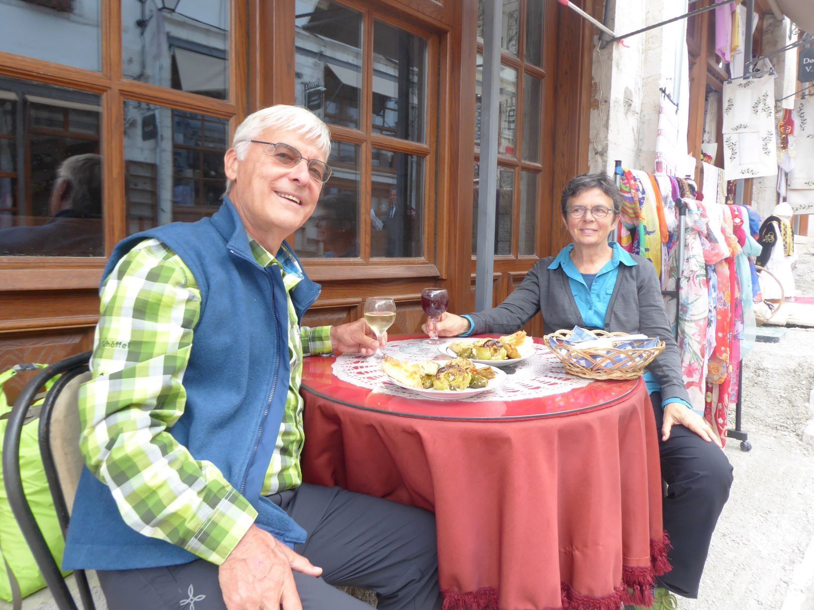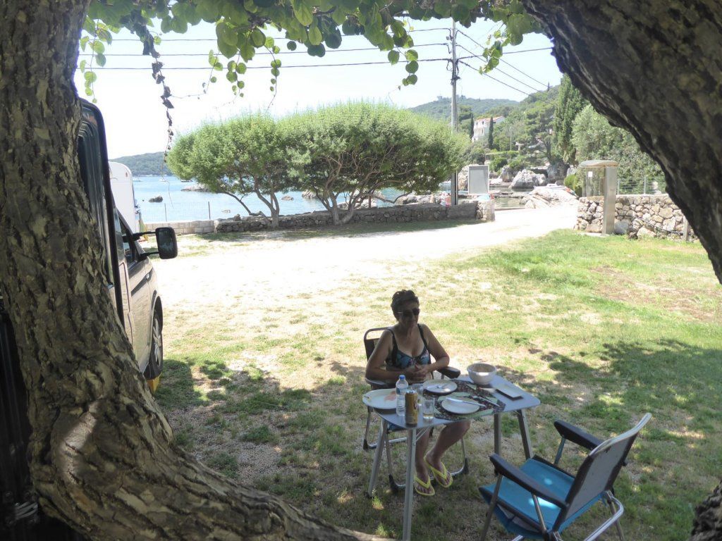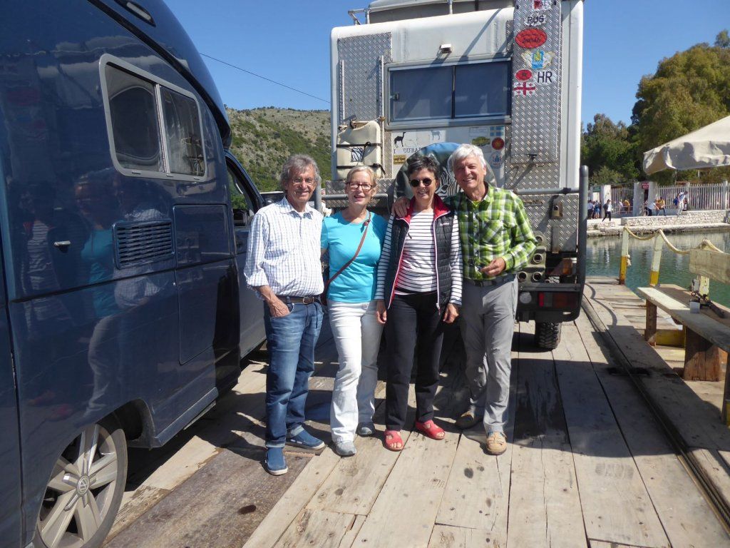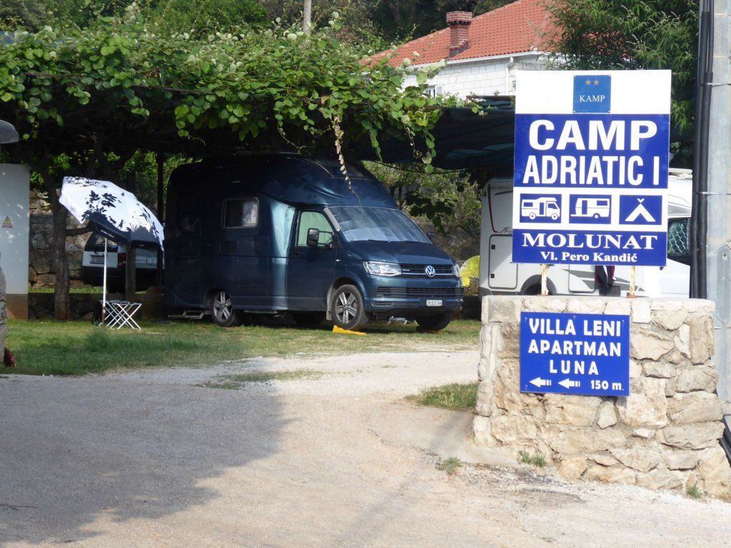 Über eine ganz kleine Grenze kommen wir wieder in die EU. Das Eintrittstor ist pompös. Fast am äussersten Zipfel Kroatiens finden wir in Molunat den zauberhaften Campingplatz Adriatik. Ein verschlafenes Dorf, aber mit gutsortiertem Laden und sogar einem Bancomat. Es ist heiss, wir suchen nur Schatten und finden ihn unter Kiwibäumen. Leider werden sie gedüngt und das hat ziemliche Salmiakimmissionen. Der Schwumm im Meer bringt Abkühlung. Wir lernen interessante Nachbarn kennen und sprechen bis nach Mitternacht über Gott und die Welt im buchstäblichen Sinn: Peter ist Pfarrer im Ruhestand und Angelika Ärztin. Wir fahren der Küste entlang an Dubrovnik vorbei, die Stadt haben wir vor 10 Jahren besucht. Auf der Halbinsel Peljesac bereiten wir uns auf die Reise nach Mostar vor.