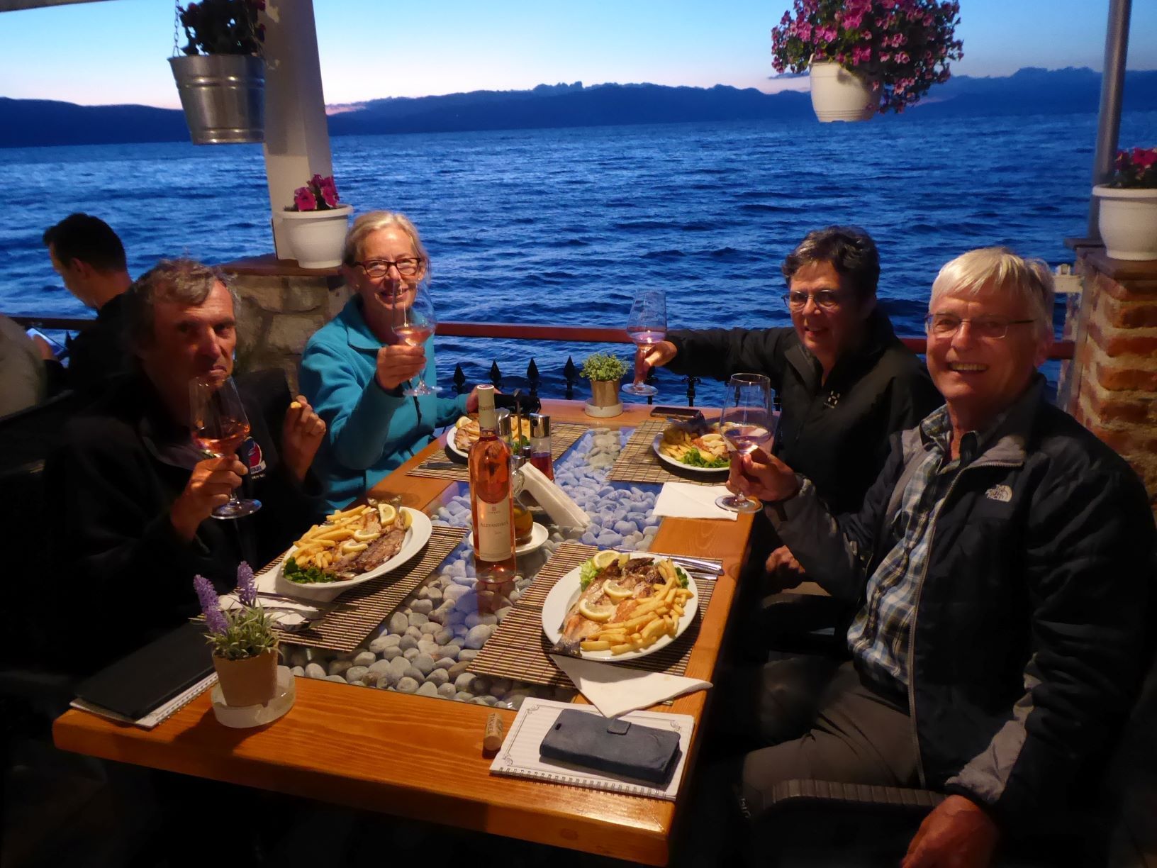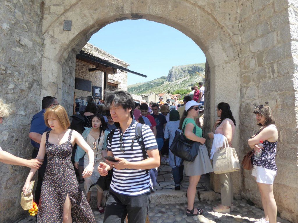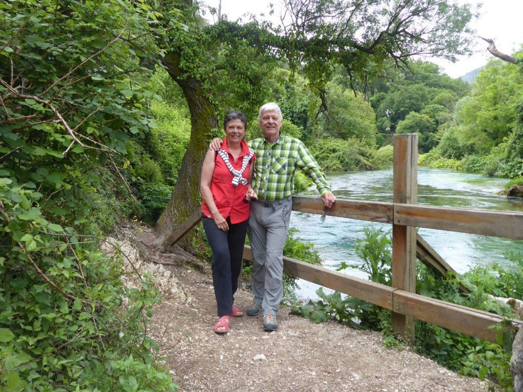 Über eine ganz kleine Grenze kommen wir wieder in die EU. Das Eintrittstor ist pompös. Fast am äussersten Zipfel Kroatiens finden wir in Molunat den zauberhaften Campingplatz Adriatik. Ein verschlafenes Dorf, aber mit gutsortiertem Laden und sogar einem Bancomat. Es ist heiss, wir suchen nur Schatten und finden ihn unter Kiwibäumen. Leider werden sie gedüngt und das hat ziemliche Salmiakimmissionen. Der Schwumm im Meer bringt Abkühlung. Wir lernen interessante Nachbarn kennen und sprechen bis nach Mitternacht über Gott und die Welt im buchstäblichen Sinn: Peter ist Pfarrer im Ruhestand und Angelika Ärztin. Wir fahren der Küste entlang an Dubrovnik vorbei, die Stadt haben wir vor 10 Jahren besucht. Auf der Halbinsel Peljesac bereiten wir uns auf die Reise nach Mostar vor.