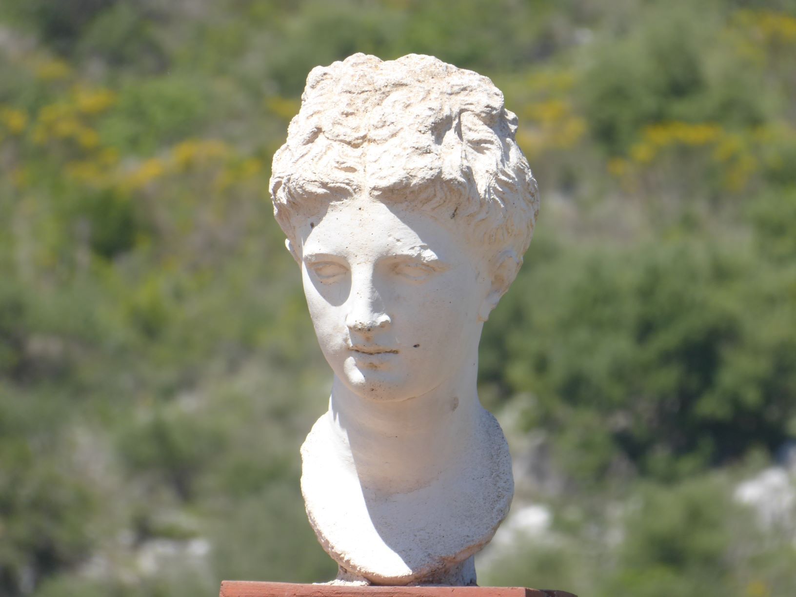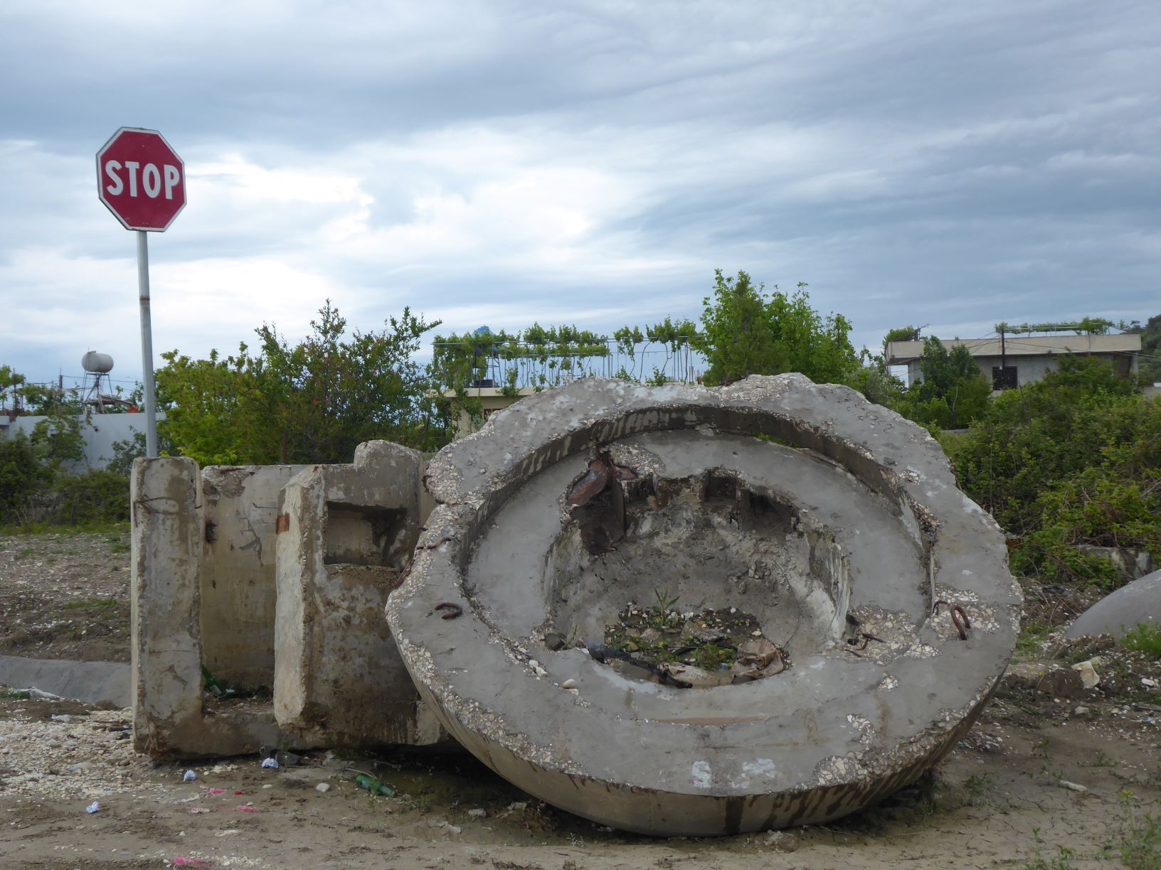 Im Regen kommen wir in Apolloni an, einer Ausgrabungsstätte wie Butrint. Später zeigt sich noch kurz die Sonne und das Tor ist offen, also machen wir eine Besichtigung halb verboten, aber prickelnd. Das Odeon, Kleintheater, zeigt sich im schönsten Licht. Zwei Hunde auf dem Parkplatz bewachen uns im Wigwam, bellen dann aber die halbe Nacht. Am nächsten Morgen sehen wir das Museum und die Zeugen sehr wechselvoller Geschichte, von Erdbeben, Eroberungen, Umbauten, Kulturraub, Zerstörung durch Einheimische, Bomben und Krieg. Apolloni war eine blühende Hafenstadt bis zu einem Erdbeben in der Mitte des 2. Jahrhunderts. Heute ist das Meer sicher 10 km entfernt. Die Akropolis ist nun voll von Hoxha Bunker, die wir auch sonst immer wieder antreffen. Zum Glück ist da noch die friedliche Bewohnerin.