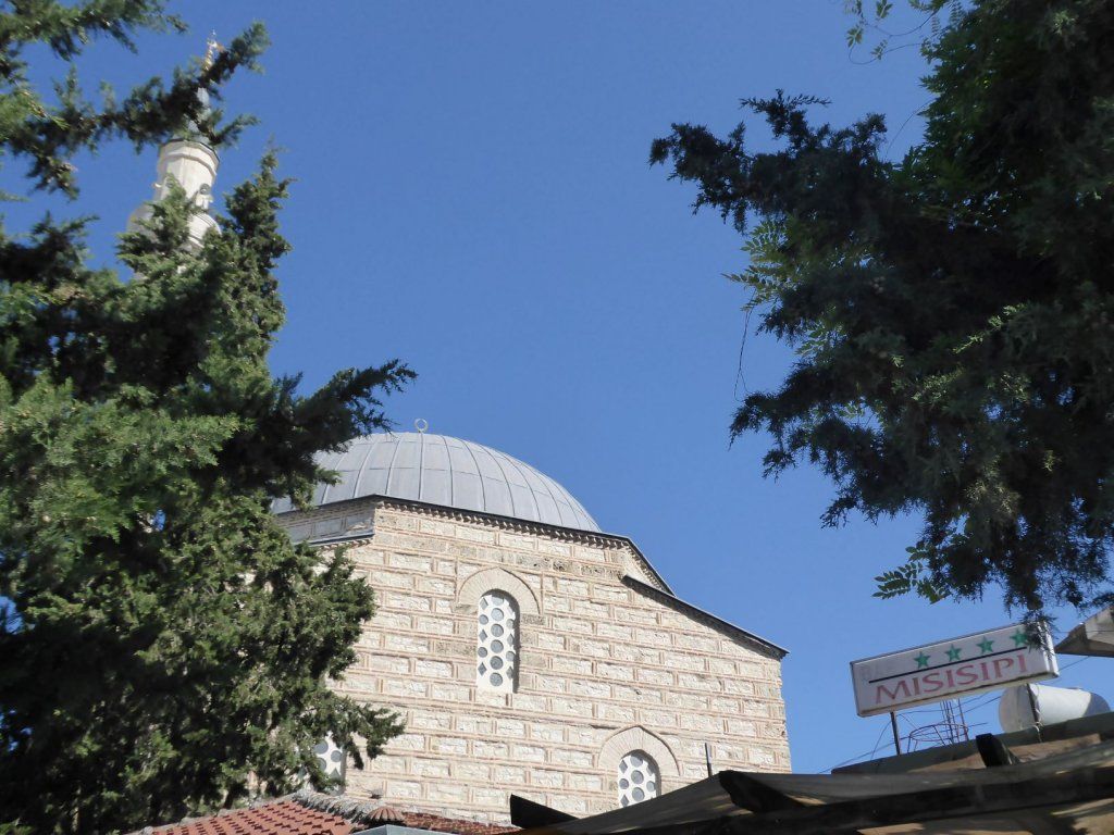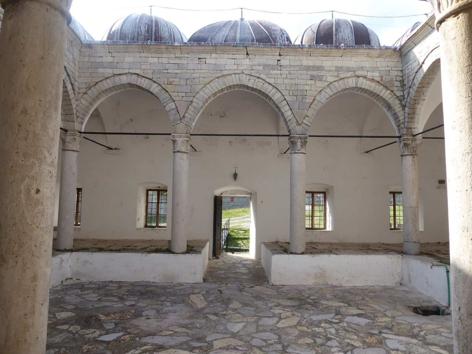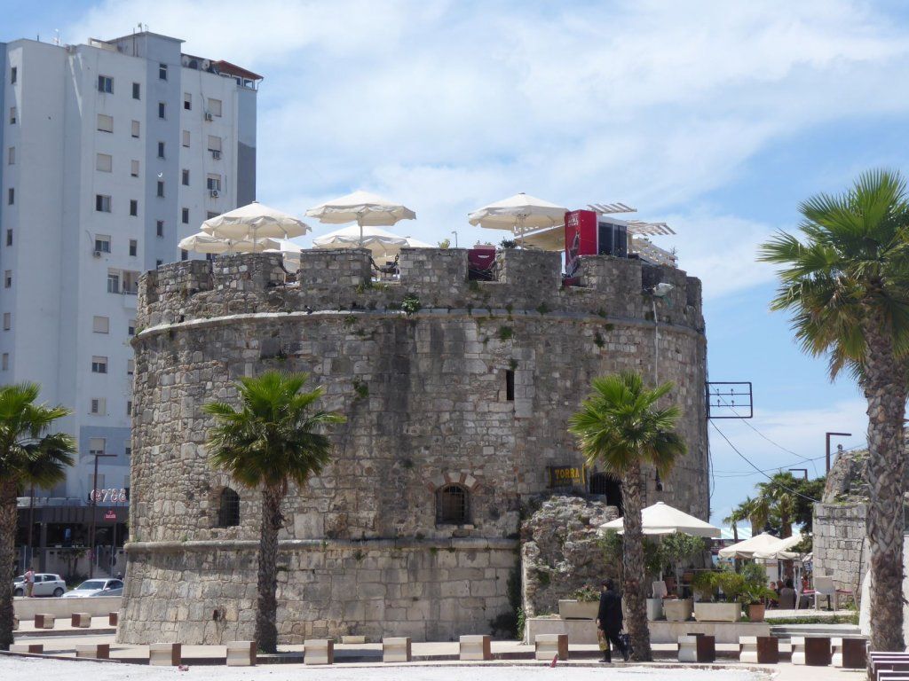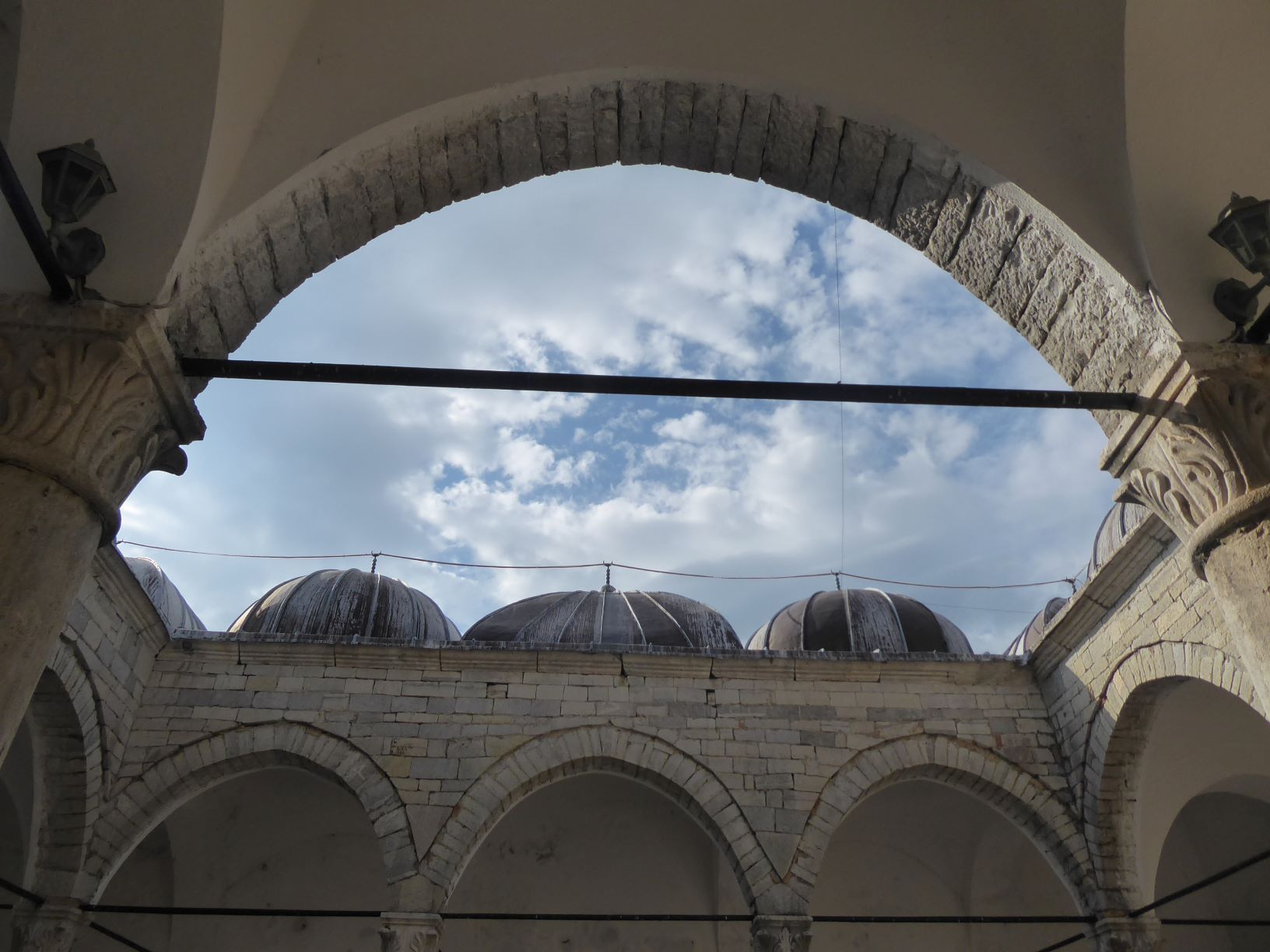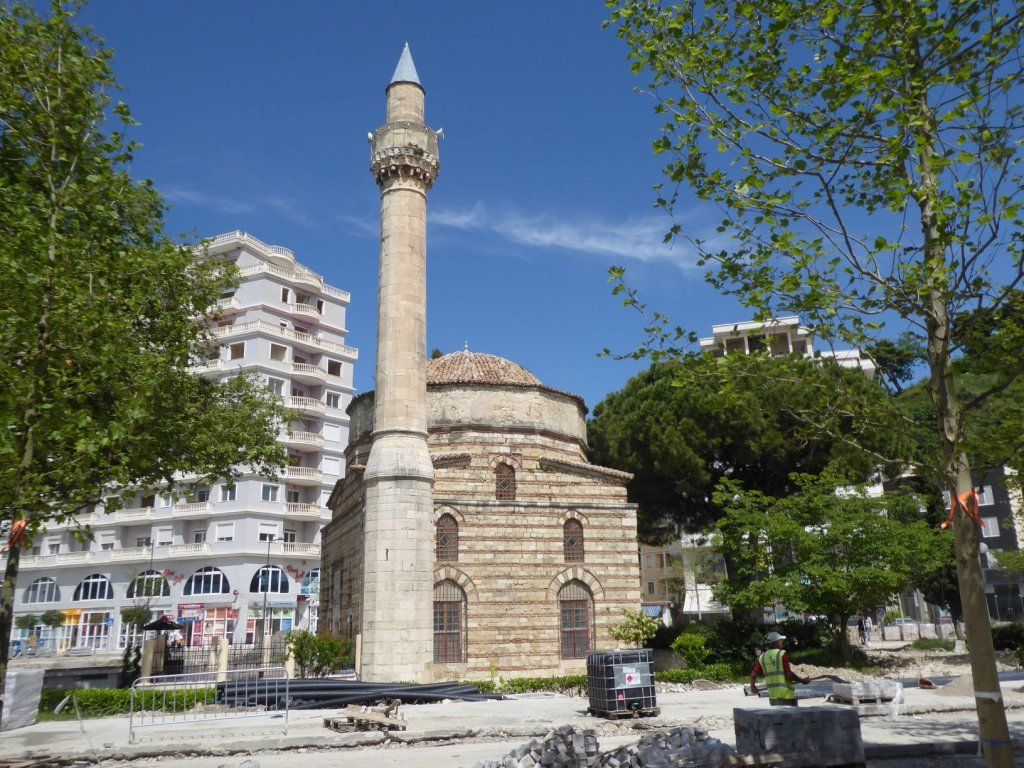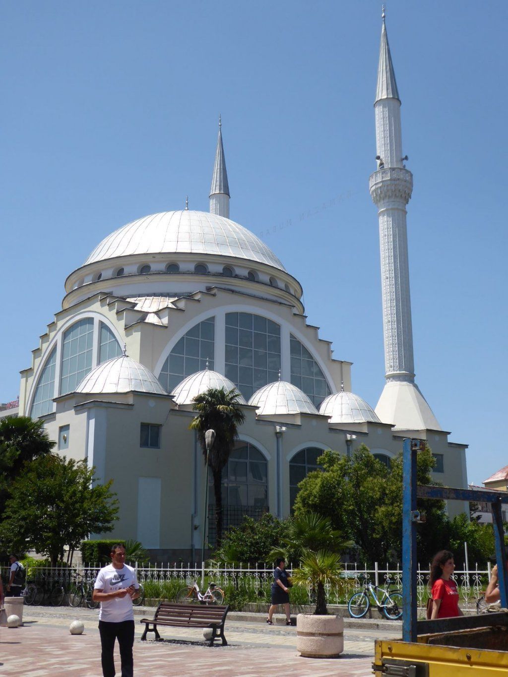 Wir fahren zum Camping Pa erme bei Durres und erhalten den letzten Platz direkt am Meer. In der Stadt nehmen wir zuerst einen Apero auf dem Venezianischen Turm und schauen dann das römische Amphitheater an. Zur Römerzeit gab es da Gladiatorenkämpfe und Christen wurden den Tieren zum Frass vorgeworfen. Später wurde eine Kapelle eingebaut von der noch sehr alte Mosaike aus dem 5.Jh erhalten sind. Gerade ist das Freitagsgebet fertig und eine Frau räumt die Teppiche vor der Moschee weg. Wir steuern auf den Eingang zu und ich ziehe schon meine Schuhe aus, aber da kommt sie schnell und sagt in gutem Englisch, dass dieser Eingang nur für Männer sei. Den Fraueneingang um die Ecke finde ich nicht, aber einen Augenschein vom Männereingang habe ich erwischt.