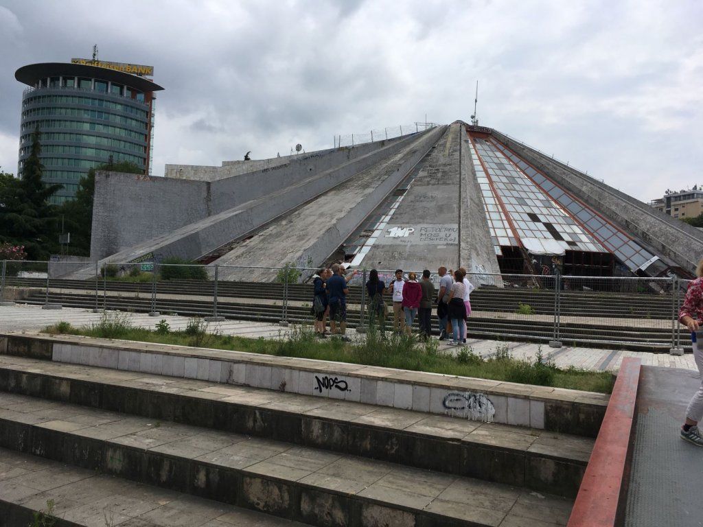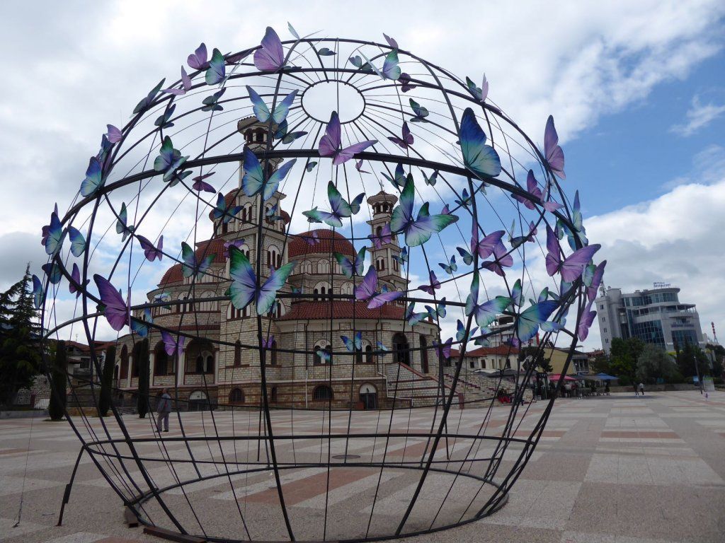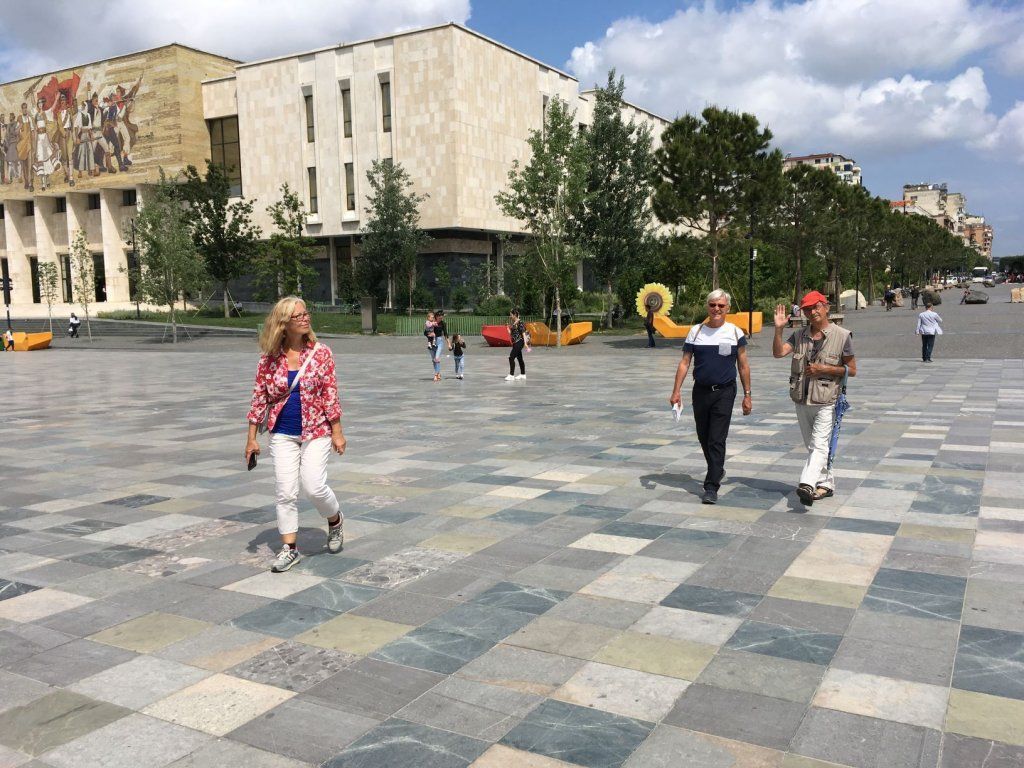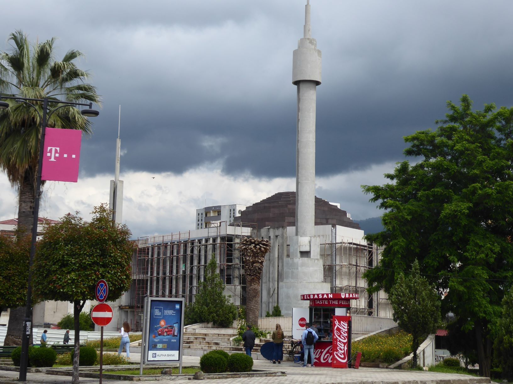 Nächste Station ist Tirana. Der Camping Tirana ist 17km vor der Stadt und an einem See gelegen. Malwin, ein junger Fahrer nimmt uns in die Stadt und fasst die Sehenswürdigkeiten zusammen. Dann lässt er uns frei und holt uns wieder ab. Vom Skanderbeg (Nationalheld 15.Jh) Platz schlendern wir durch das breite Boulevard bis zum Denkmal von Mutter Teresa. Ihr Name ist mit Blumen in eine Wiese geschrieben. Unterwegs kommen wir an der Pyramide von Hoxhas Tochter vorbei. Das sollte das Mausoleum für ihren Vater werden, leider starb er vorher und in typisch kommunistischer Art hat der Beton schlechte Qualität und das Werk zerfällt.