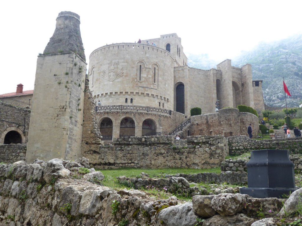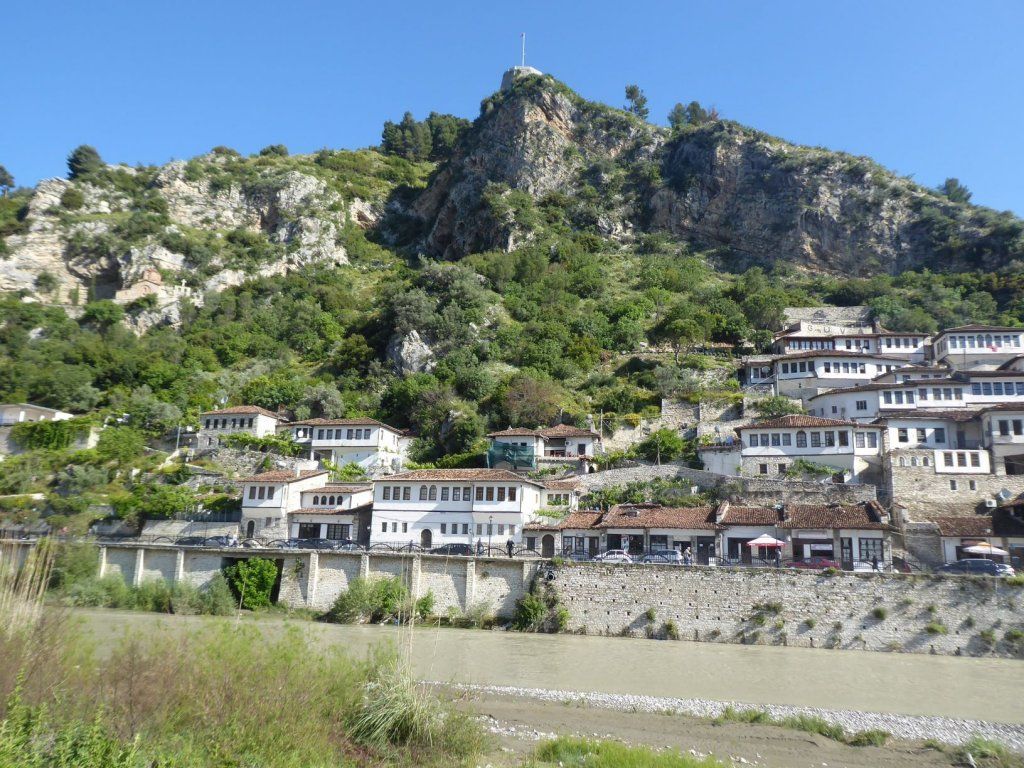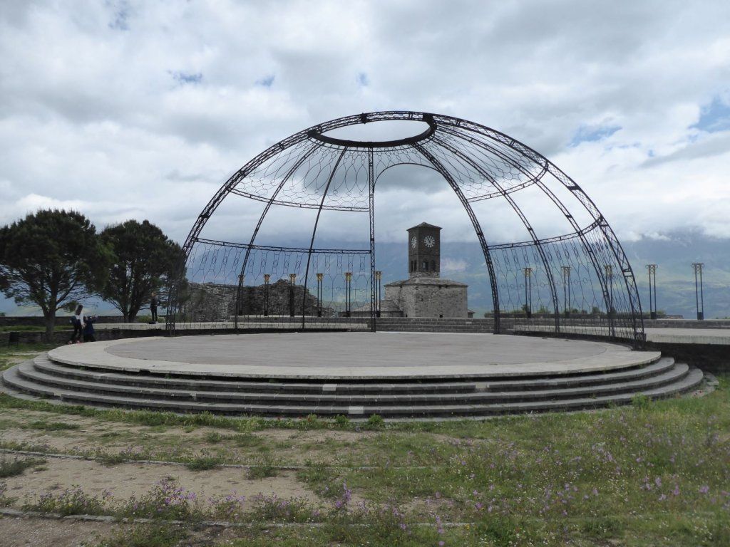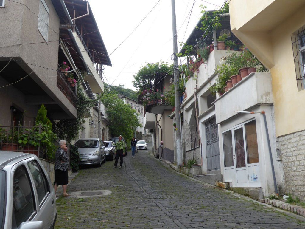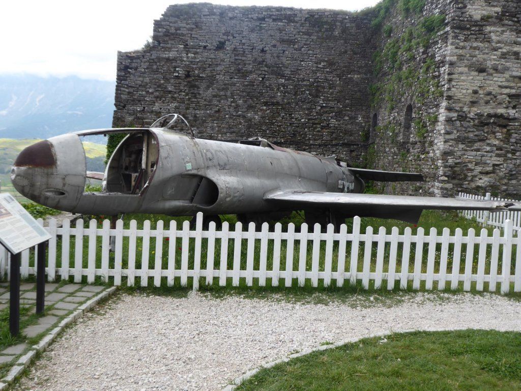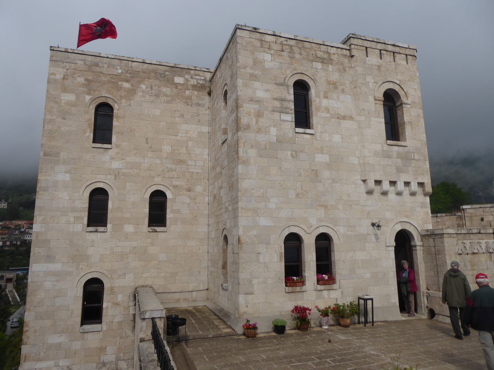 Die Stadt erkunden wir zu Fuss. Bis zur Burg sind es 45 Minuten. Der Weg wird immer steiler, er ist aus breitem Kopfsteinpflaster. Wir kommen durch ein sehr ursprüngliches Quartier und bewundern die schönen Balkone. Ein Teil der Burg ist eine Ausstellung von Kanonen aus dem 1. und 2. Weltkrieg und sogar ein amerikanisches Flugzeug ist dabei. Der Pilot ist wegen schlechtem Wetter vom italienischen Luftraum abgekommen und musste in Albanien notlanden. Das Hoxha-Regime stellte dies als Erfolg ihrer Abfangjäger dar, als Triumpf über die Amerikaner und hievte das Flugzeug zum Beweis auf die Burg hoch. Der andere Teil ist nun Kulturraum mit einer schönen Freilichtbühne. Von dort aus können wir uns orientieren.