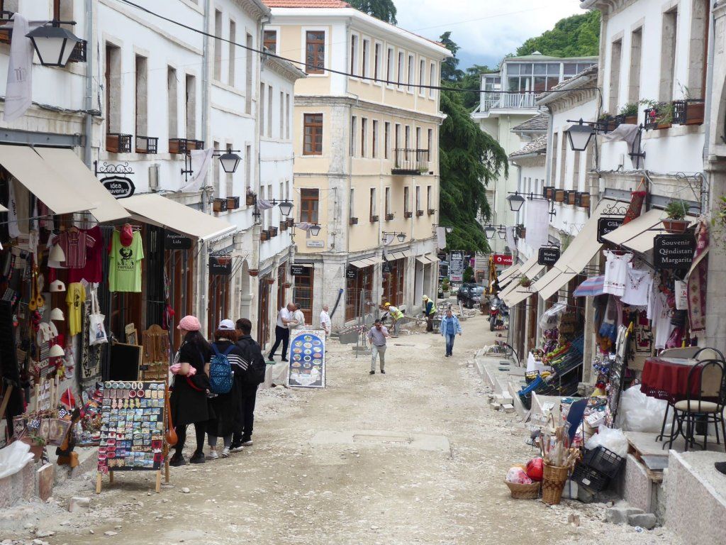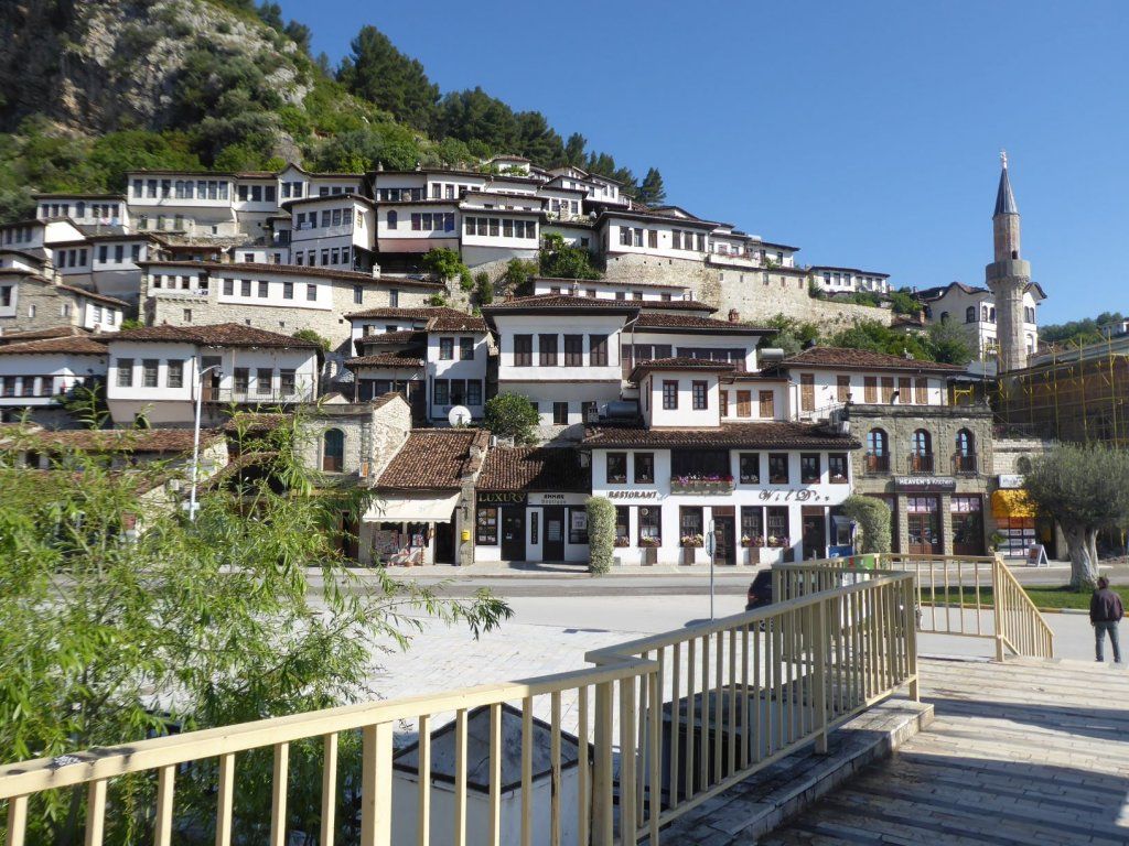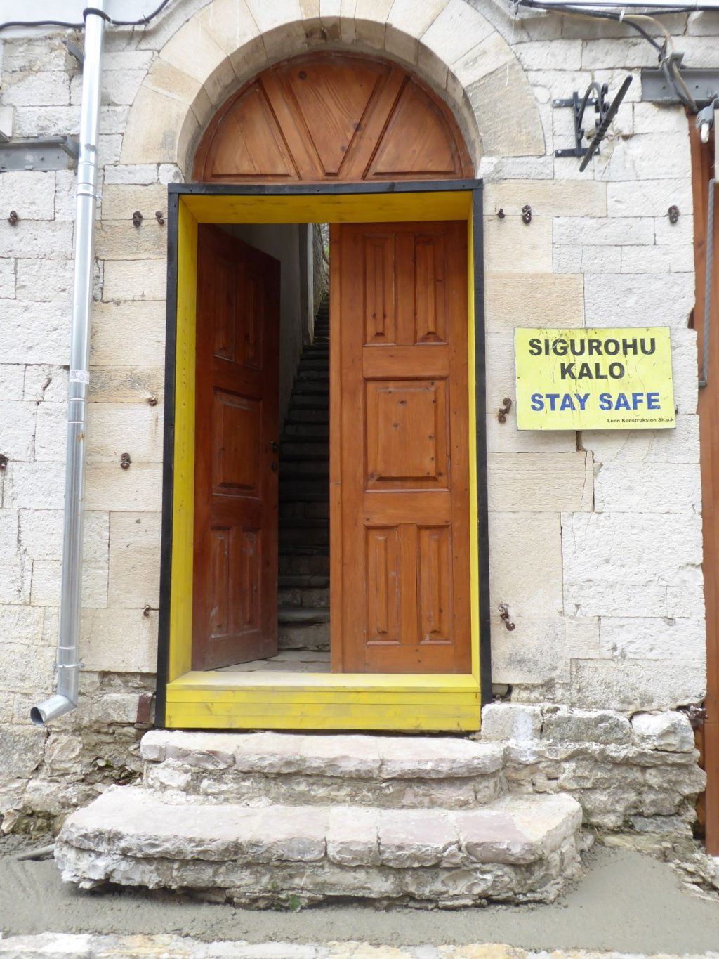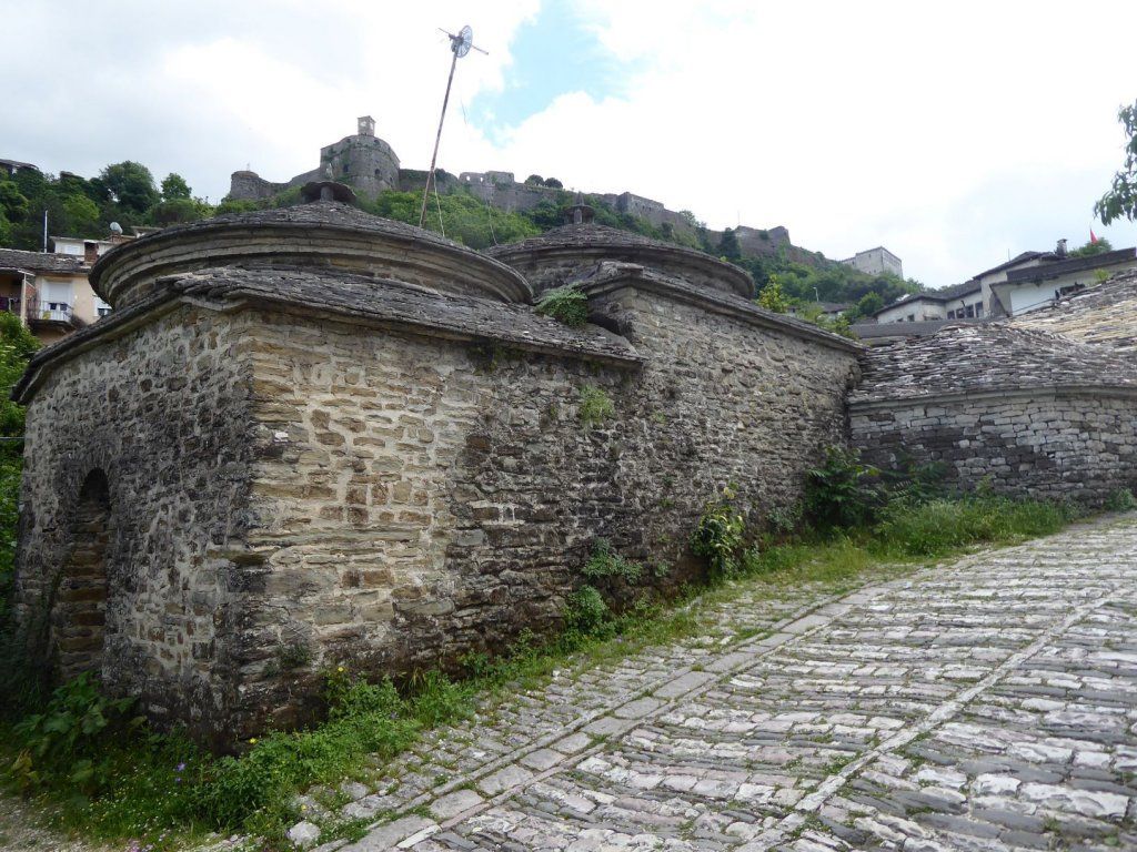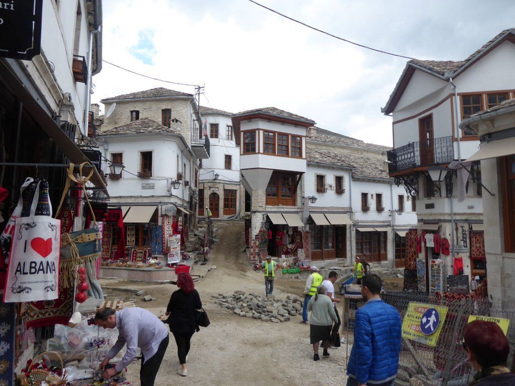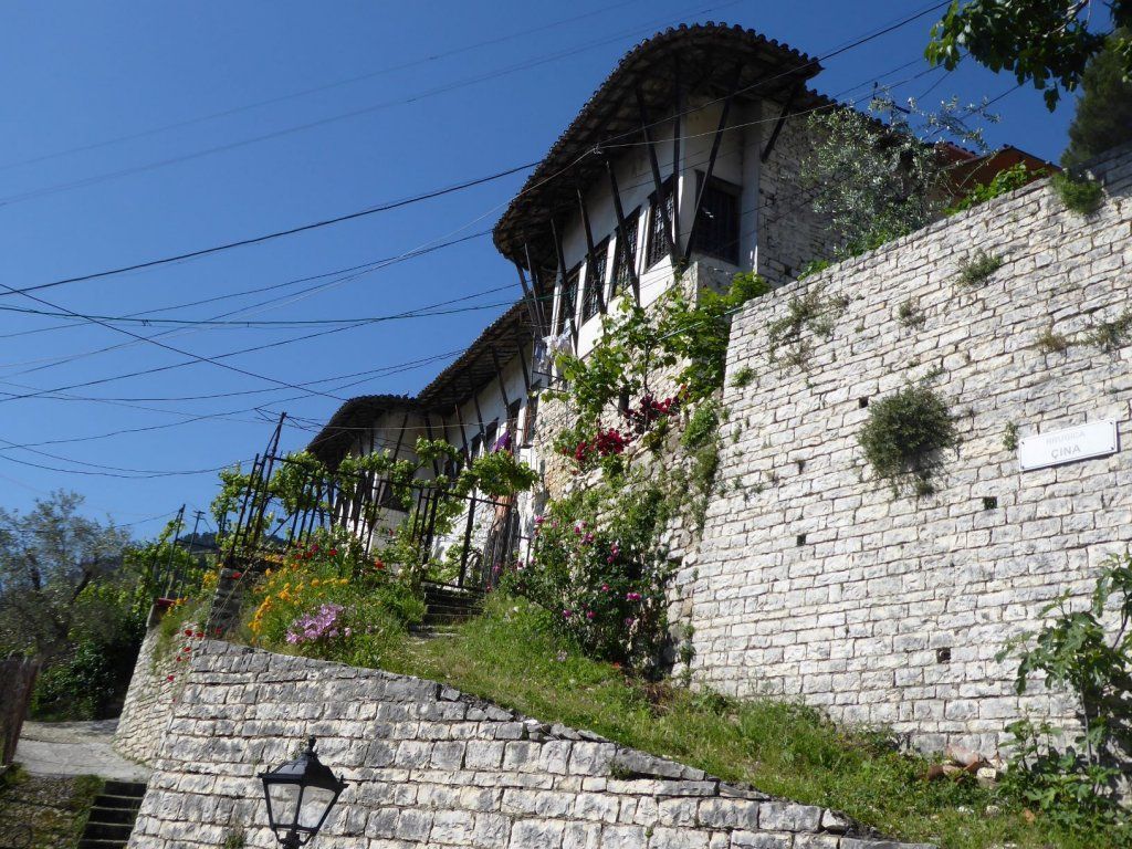 Die Stadt erkunden wir zu Fuss. Bis zur Burg sind es 45 Minuten. Der Weg wird immer steiler, er ist aus breitem Kopfsteinpflaster. Wir kommen durch ein sehr ursprüngliches Quartier und bewundern die schönen Balkone. Ein Teil der Burg ist eine Ausstellung von Kanonen aus dem 1. und 2. Weltkrieg und sogar ein amerikanisches Flugzeug ist dabei. Der Pilot ist wegen schlechtem Wetter vom italienischen Luftraum abgekommen und musste in Albanien notlanden. Das Hoxha-Regime stellte dies als Erfolg ihrer Abfangjäger dar, als Triumpf über die Amerikaner und hievte das Flugzeug zum Beweis auf die Burg hoch. Der andere Teil ist nun Kulturraum mit einer schönen Freilichtbühne. Von dort aus können wir uns orientieren.