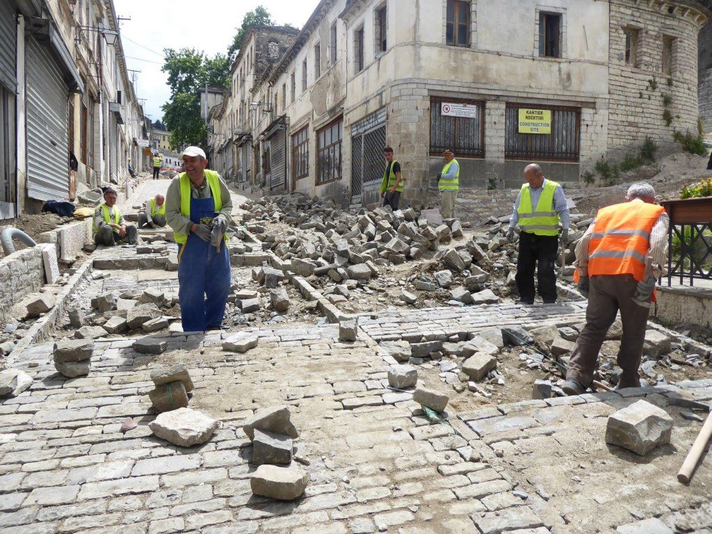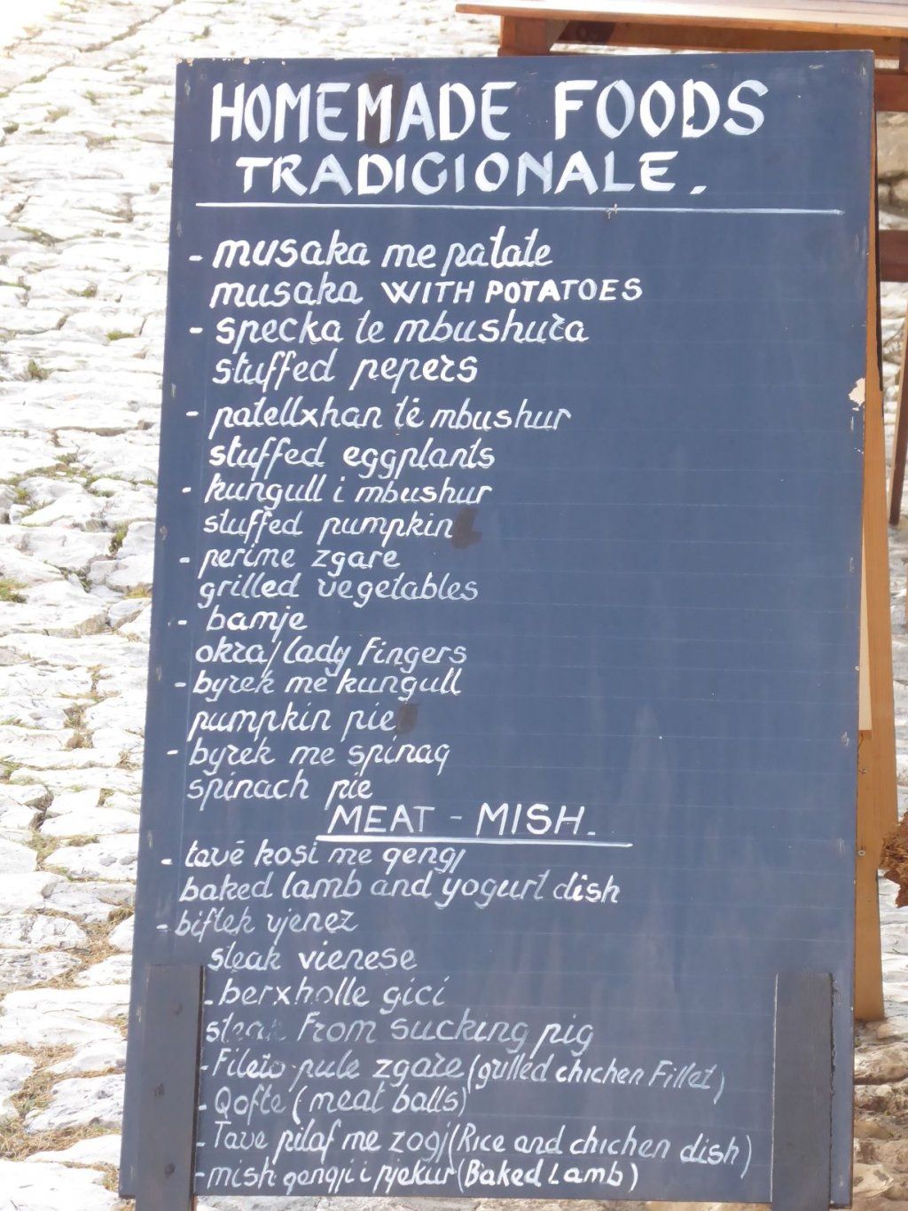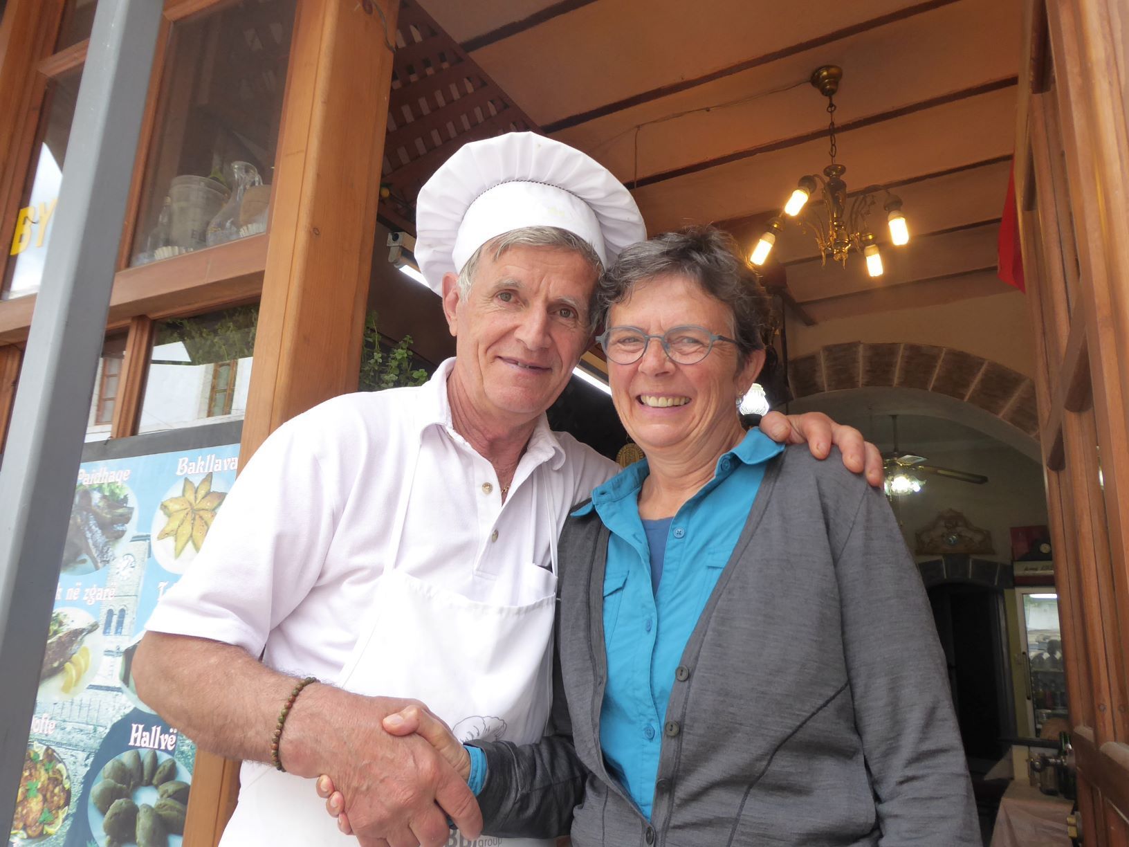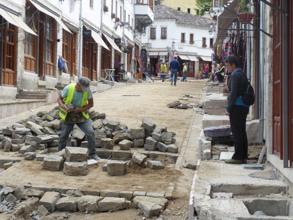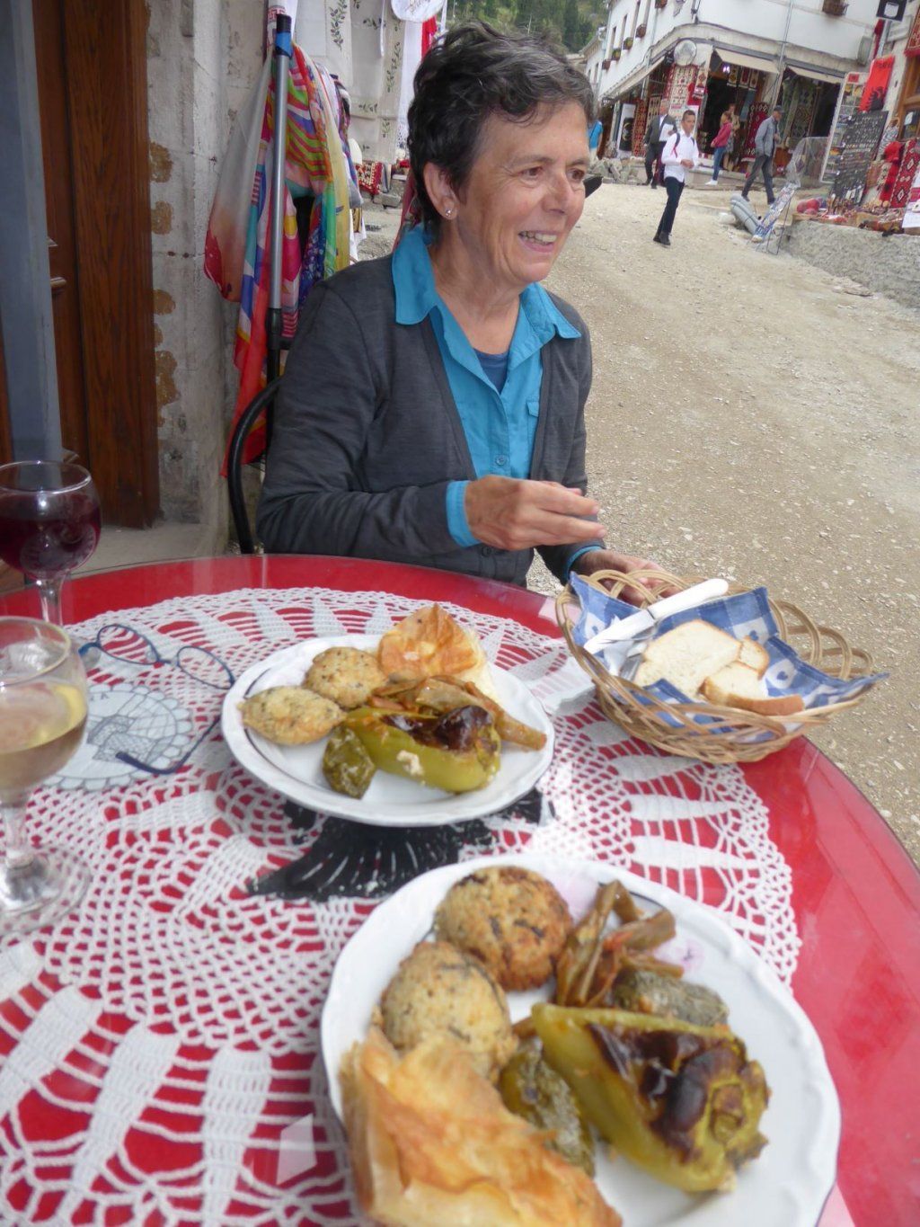 Wir suchen die erste albanische Schule aus dem Anfang des 20. Jahrhundert. Nach mehreren Anläufen finden wir dank Maps.me den Aufgang durch eine Art Haustüre. Lehrer, die damals albanisch unterrichteten, wurden anfänglich verfolgt. In der Altstadt wird neu gepflästert. Alle Gassen sind aufgerissen und an verschiedenen Stellen können wir die Strassen- und Mauerbauer bei der Arbeit betrachten - wahre Künstler. Der Koch mit der speziellen Kappe zeigt uns sein traditionelles Essen: Qifqi = gebratene Reisbällchen, Dolmades = Weinblätter mit Reis gefüllt, Peperoni mit Reis gefüllt, Bohnen an Tomatensauce und Byrek = Käsestrudel. Wir bekommen einen gemischten Teller und fragen uns woher der Reis kommt. Zur Hoxhazeit, zur Zeit als er mit China verbunden war, wurde im Süden Reis angebaut. Im trockenen Albanien Reis, der so viel Wasser braucht? Nun wird er importiert.