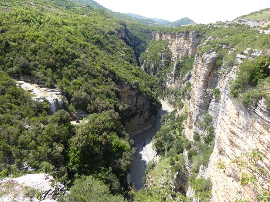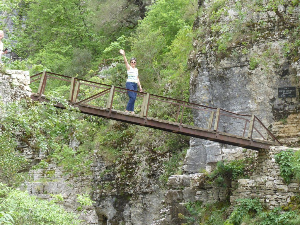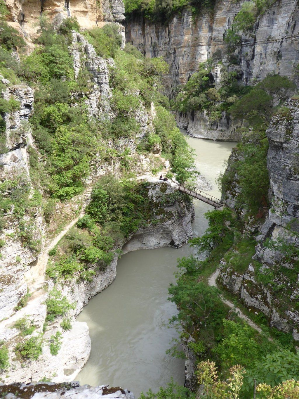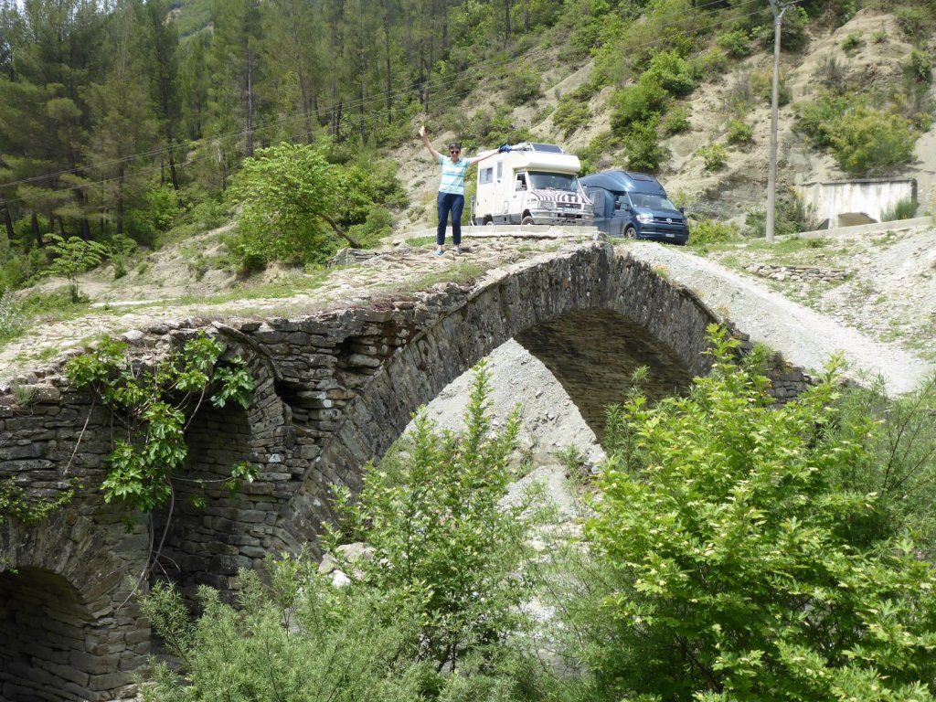 Am nächsten Tag fahren wir ins Osum Tal. Der Osum ist ein ganz grosser Fluss. Die Strasse ist eng, kurvenreich, löchrig, abgebrochen. Die Fahrt ist sehr anstrengend. Bei einer schönen Osmanischen Brücke können wir zu ersten Mal Picknicken, so schön ist das Wetter. Dann fahren wir alle Aussichtspunkte an und bestaunen die tiefe Schlucht. Auf dem Canyon Camping Corovoda verbringen wir die Nacht. Von einer feiernden Männergesellschaft bekommen wir die Reste einer Ziege vom Grill, ist sehr fein. Das Fest endet mit Tanz und Raki, Schnaps. Bei Bogova wandern wir zu einem Wasserfall. Es tut gut, Wege auch zu Fuss zu gehen. Es macht einfach glücklich.