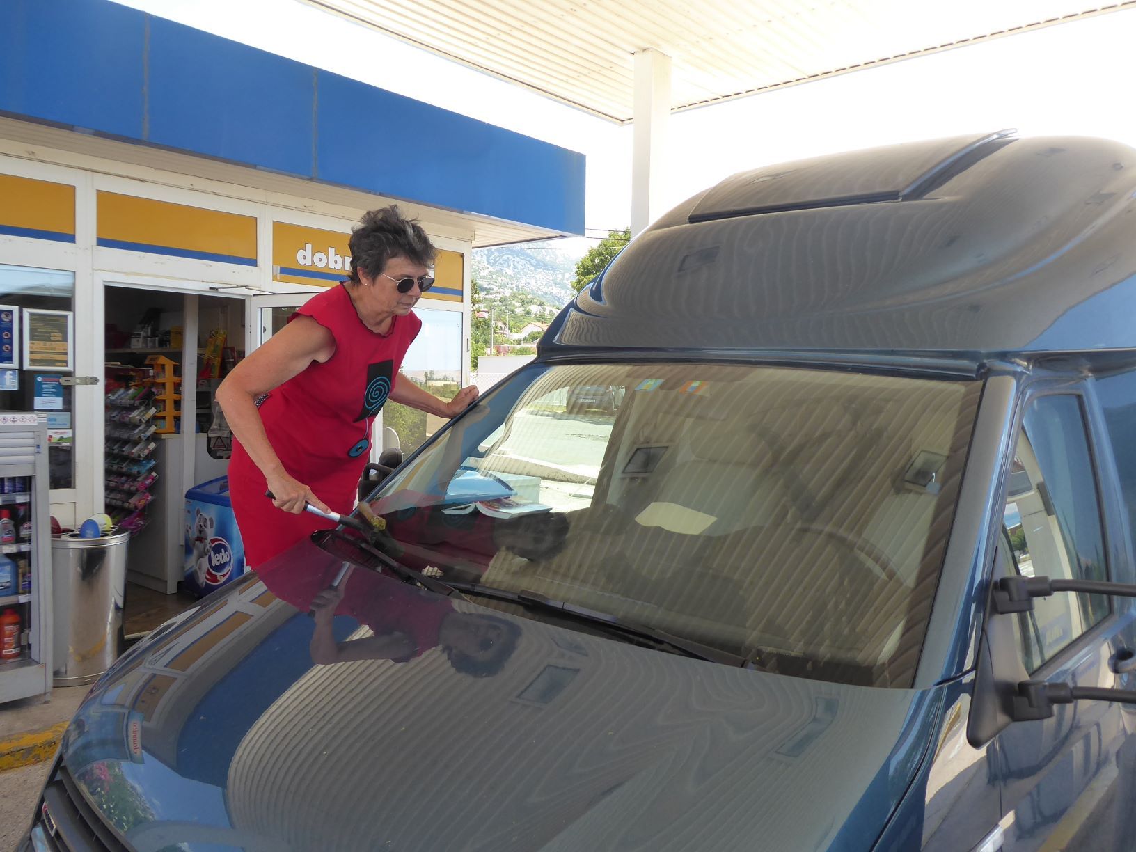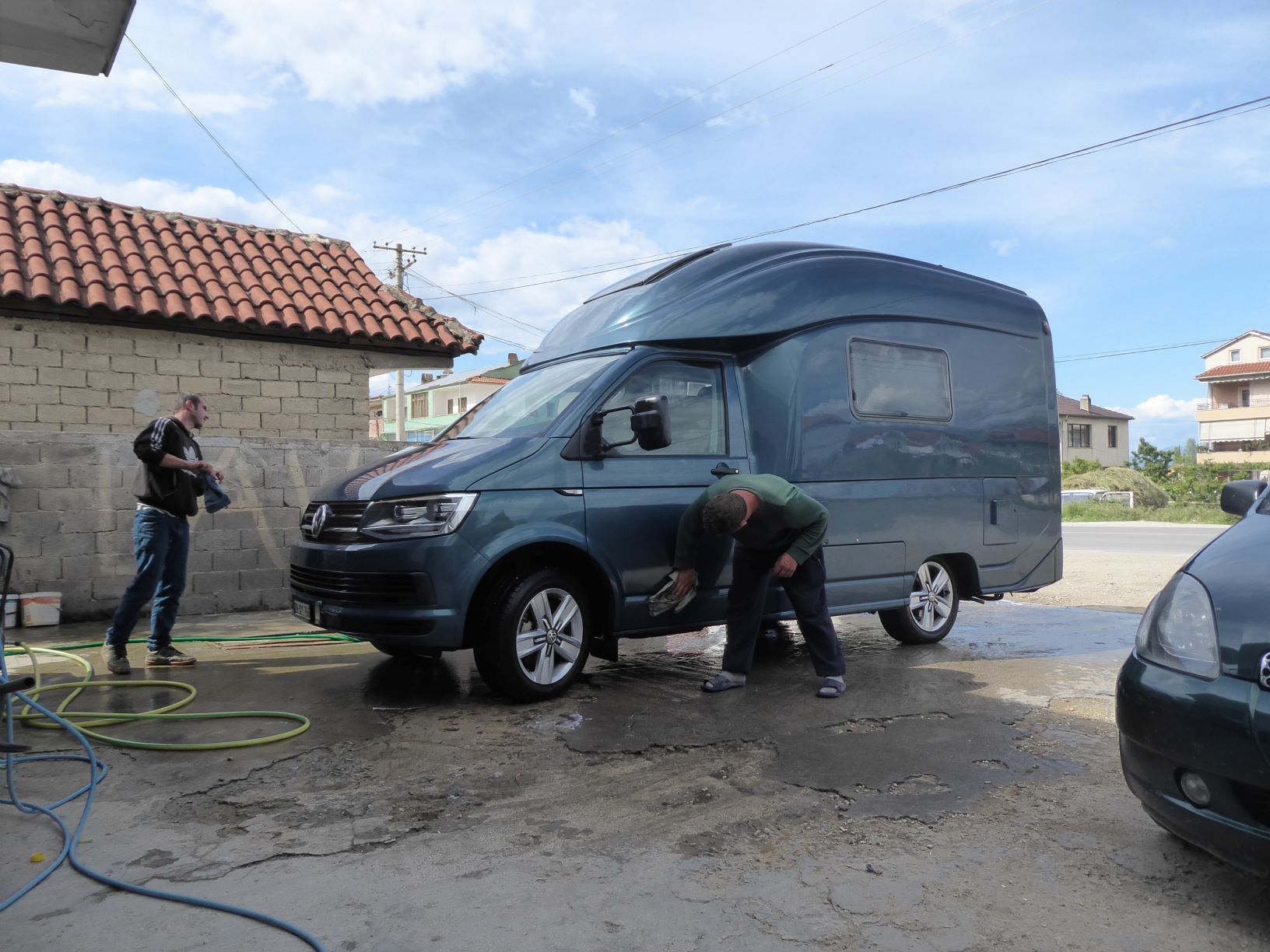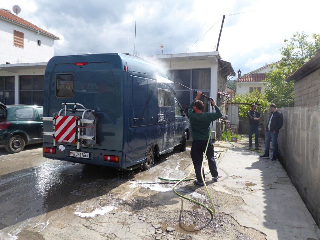 Nach all den Regengüssen, Pfützen, Staubwolken und klebrigen Saft von Linden, hat das Wigwam eine Wäsche nötig, für sagenhafte 200 Lek, 2 Franken und das in 10 Minuten.
