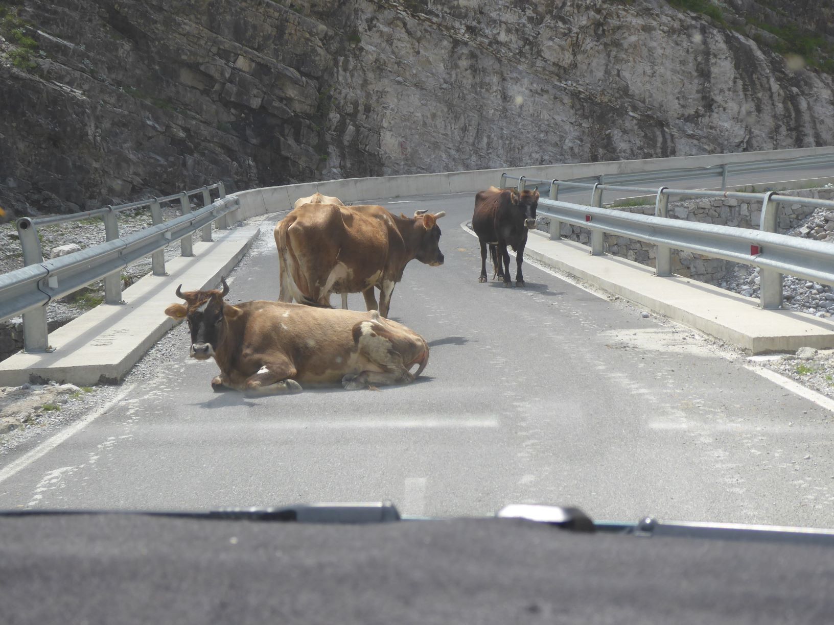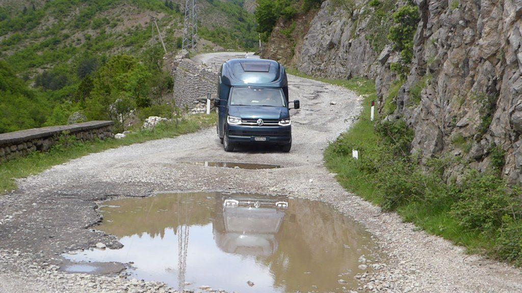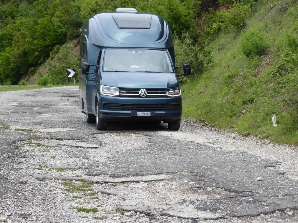 Am nächsten Morgen regnet es wieder heftig, die Holländer fahren ab und es wird wieder ruhig und verträumt. Da kommen wir auf eine Strasse, die zwar geteert ist, aber eher einer off-road Strecke gleicht. Die Bilder sprechen für sich. Mein Kurvenmeister und Fahrer hat das grandios gemeistert. Wir hatten keinen Gegenverkehr zum Glück und haben erst später erfahren, dass es eine neue Strasse gibt, die unser Navi nicht kennt. Also, es war super!