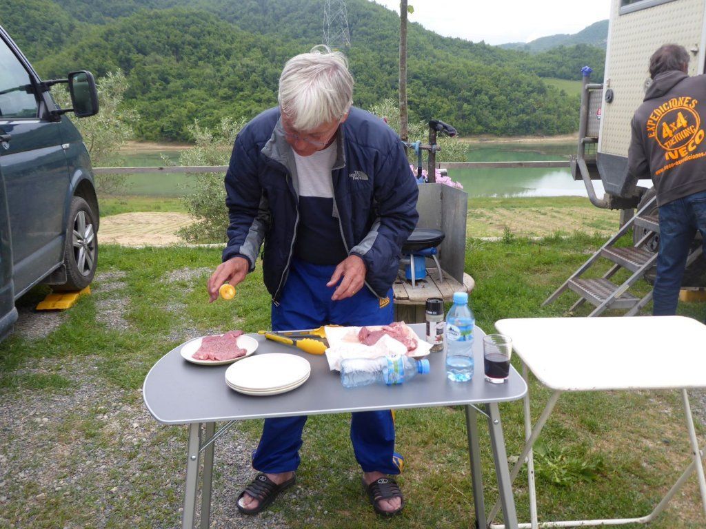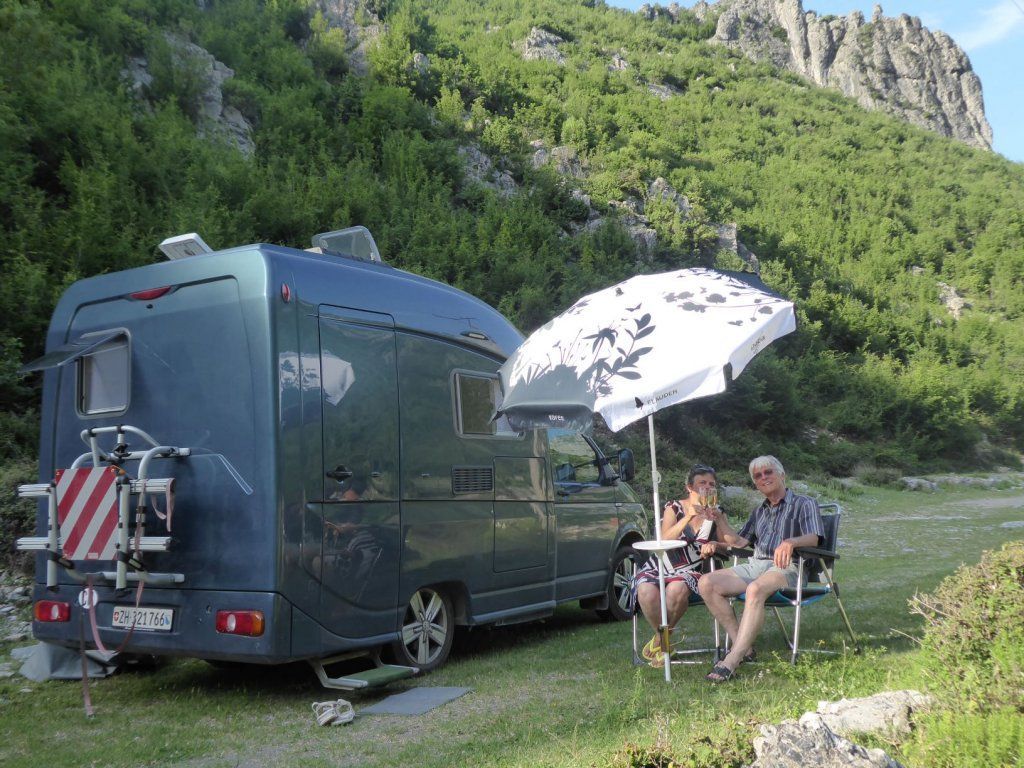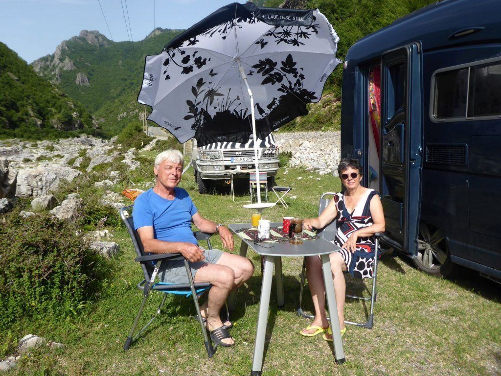 New ParagraphHeute ist nämlich der letzte Abend der gemeinsamen Reise mit Marianne und Uli. Sie haben einen schönen Platz am Fluss gefunden, eben 5 km vor Prekali auf der Südroute nach Theth. Von da an ist es nur noch offroad, also nichts für unser Wigwam. Mit einer üppigen und feinen Grillade, Wein und einem Lagerfeuer lassen die Zeit ausklingen. Es war schön und interessant zusammen, hin und wieder auch einmal schwierig, genau wie das Leben auch ist.